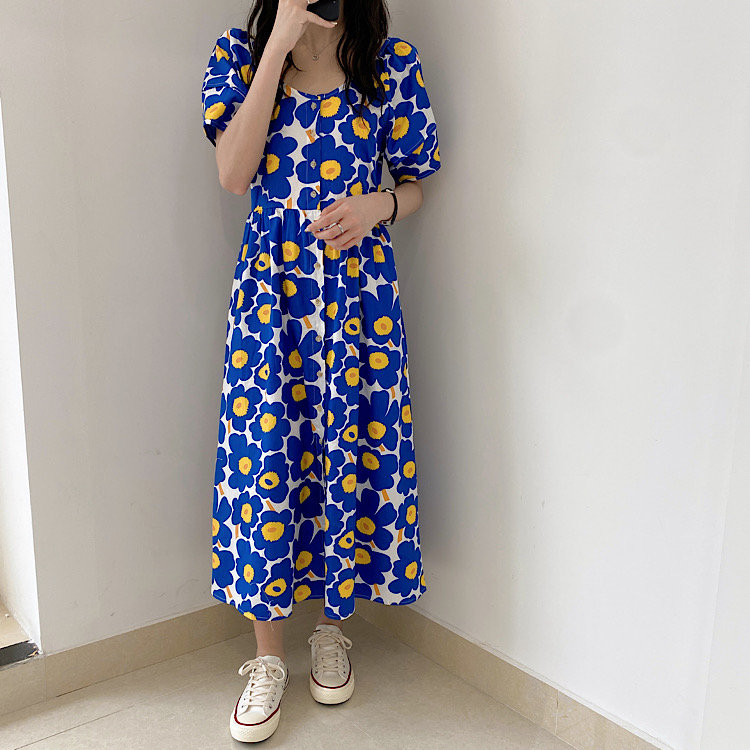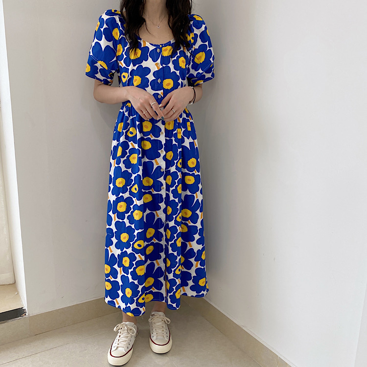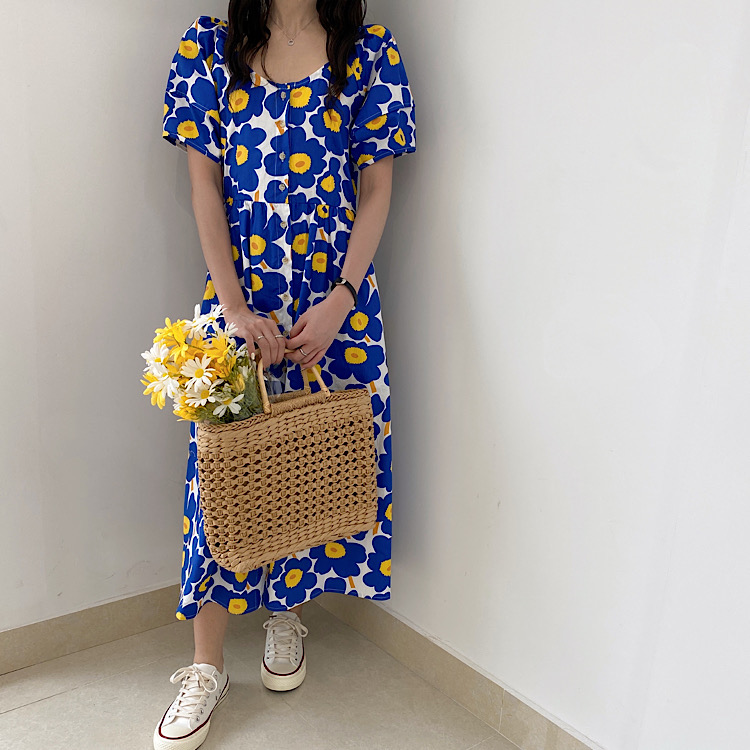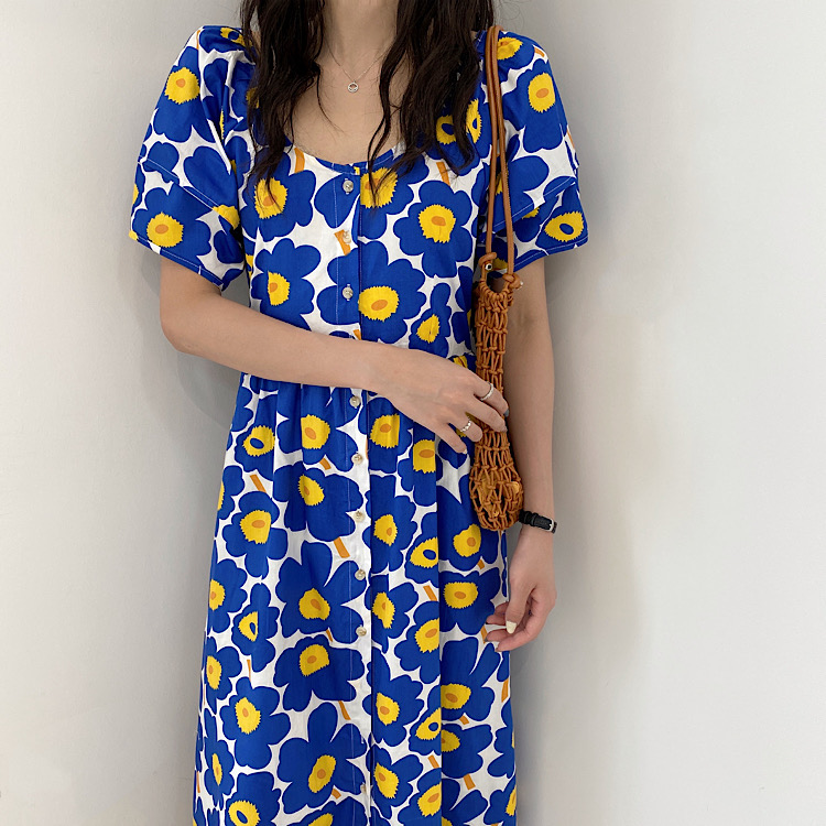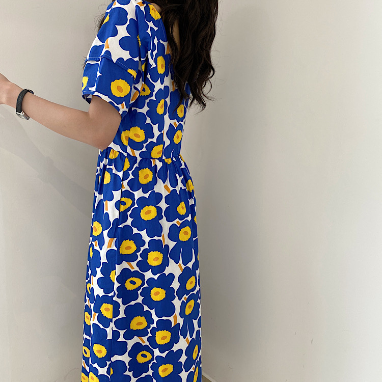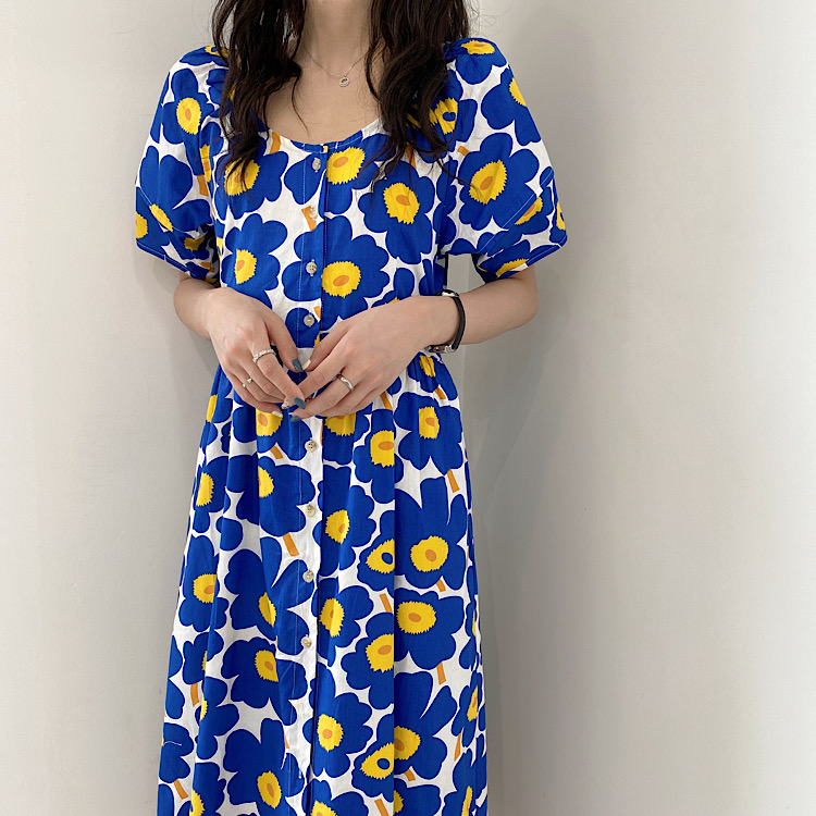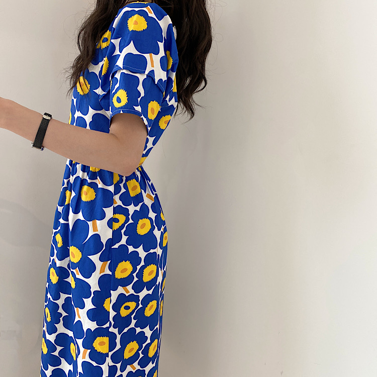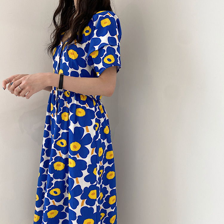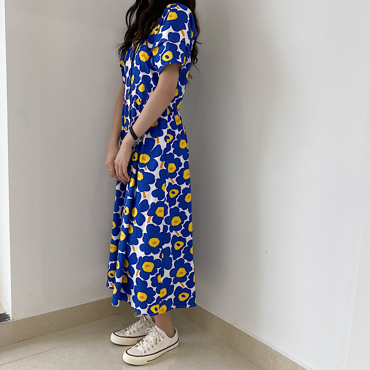鮮やかなブルーの大胆な花柄が印象的な半袖シャツワンピース。