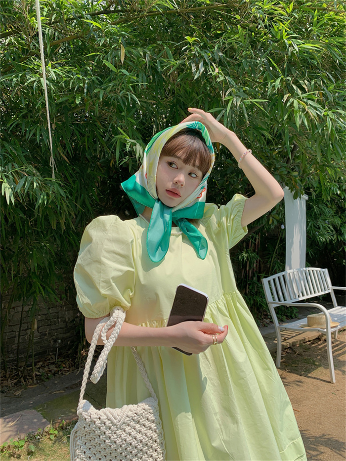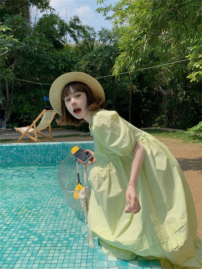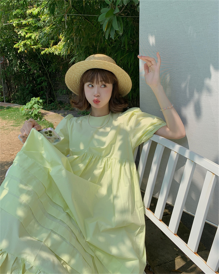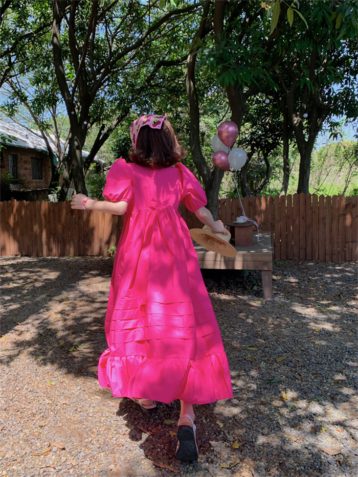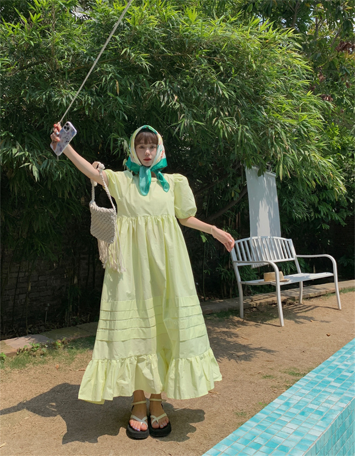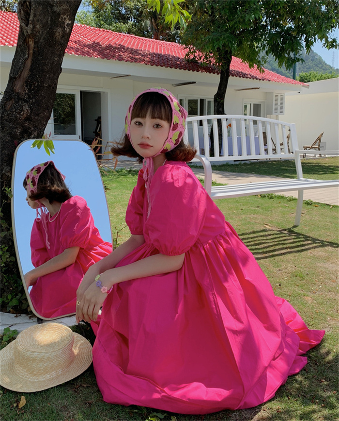 優雅なパフスリーブと丸首デザインが魅力的なフレアロングワンピース。
