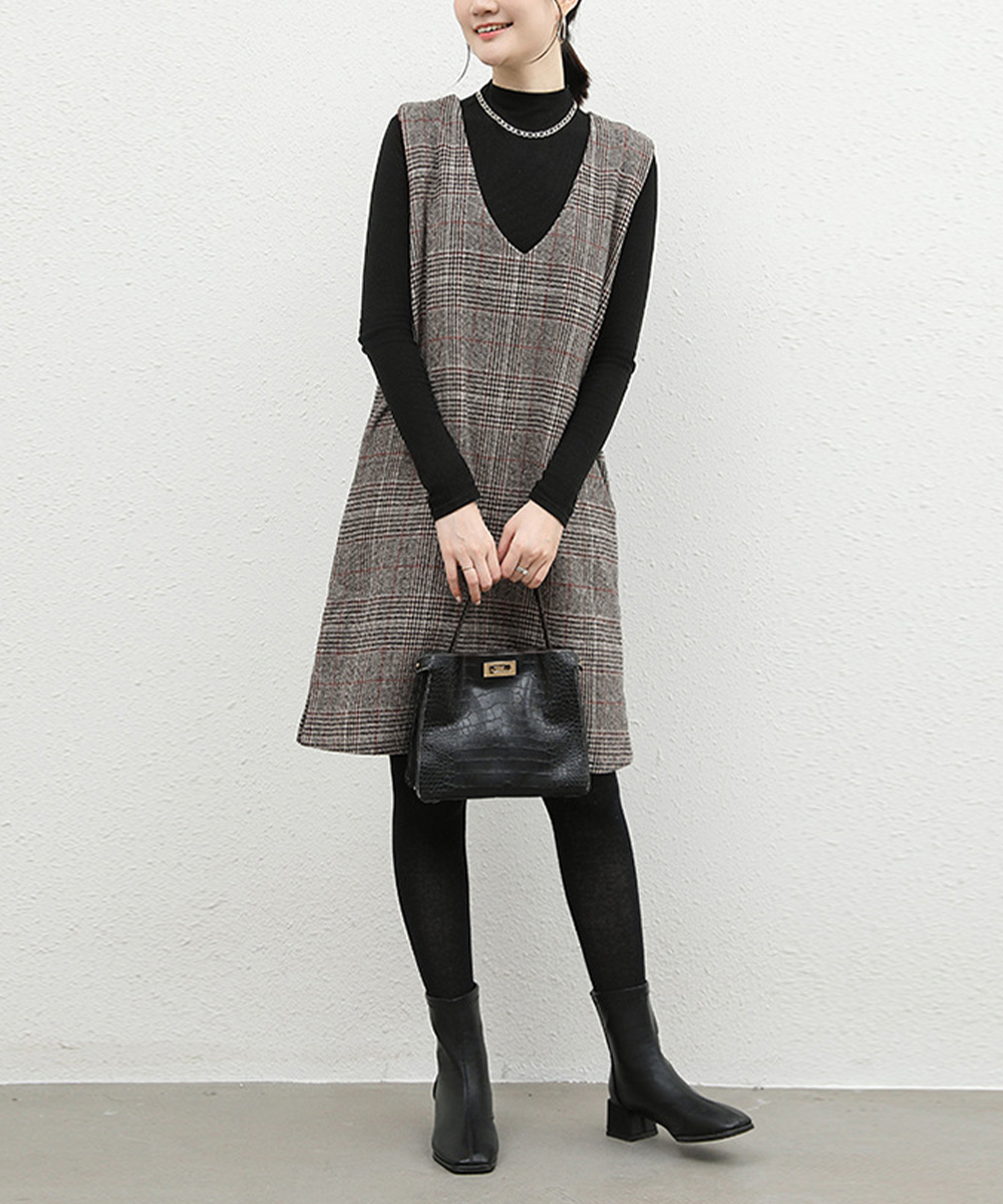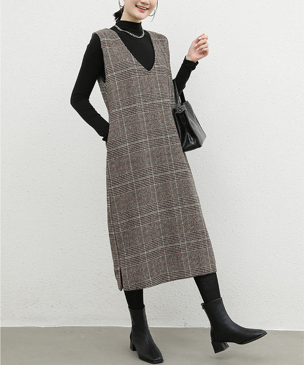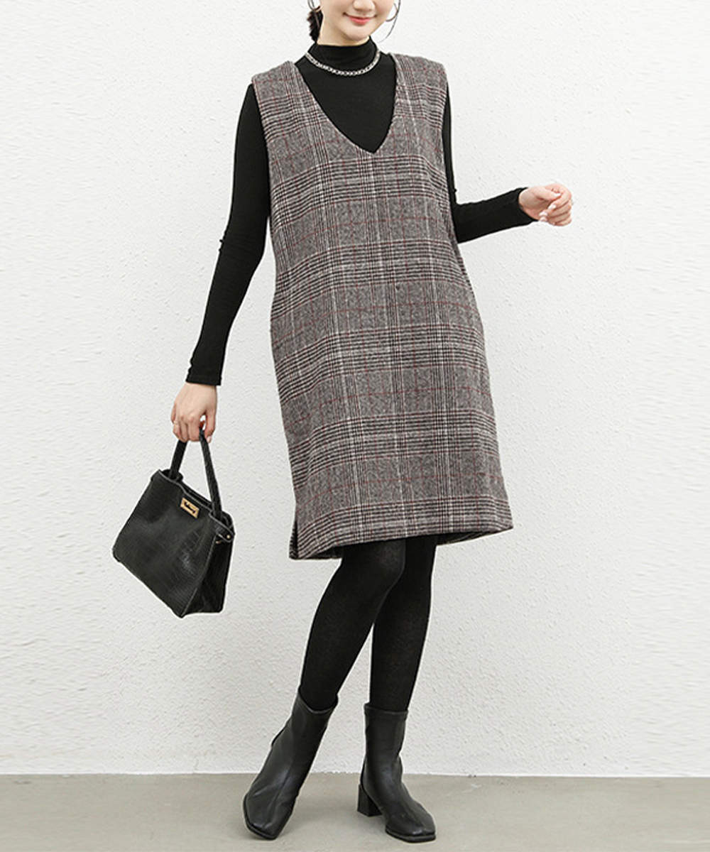 深めの襟ぐりとゆったりシルエットが魅力的なノースリーブのチェック柄ジャンパースカート