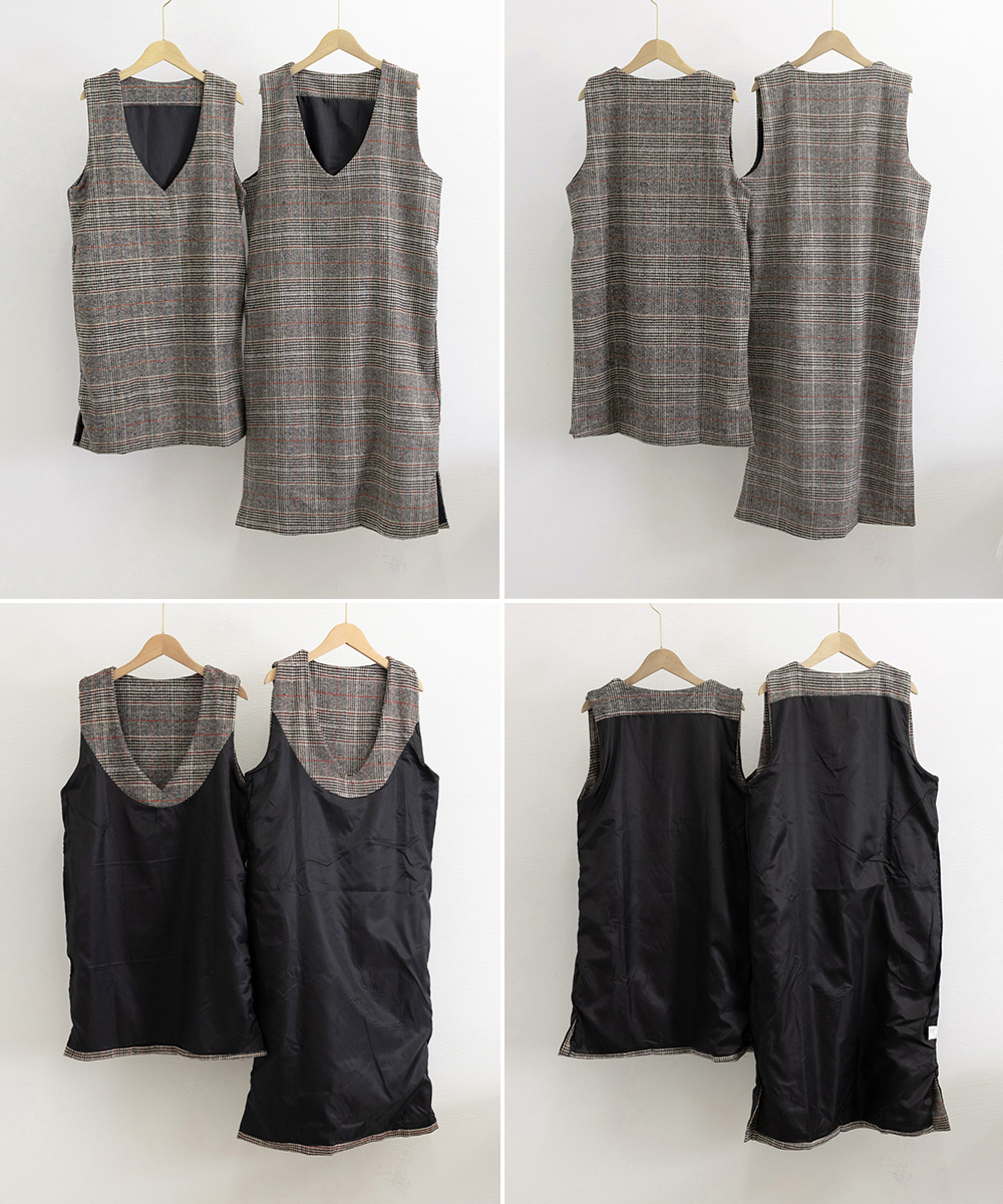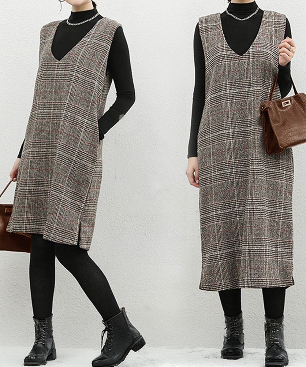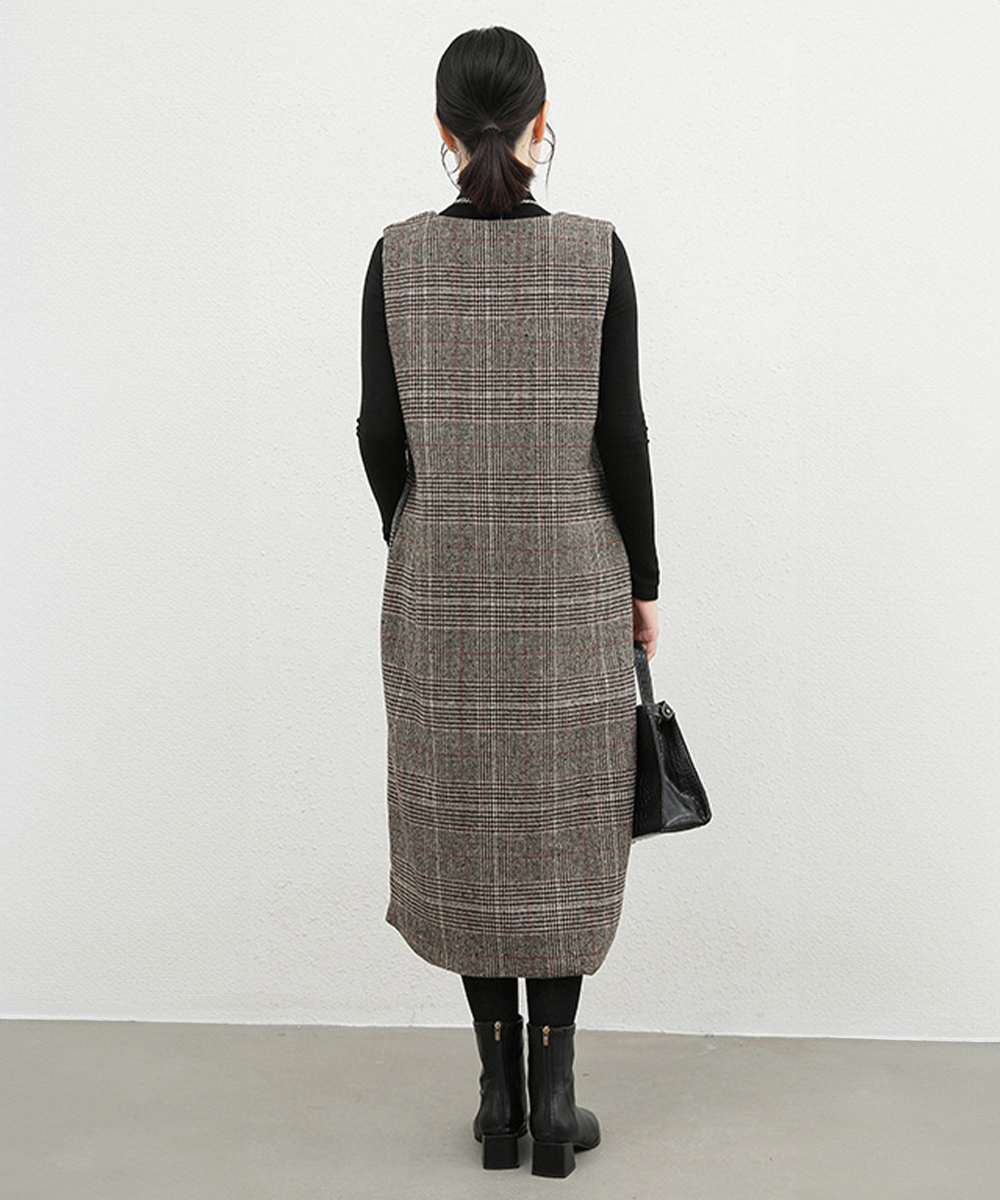 深めの襟ぐりとゆったりシルエットが魅力的なノースリーブのチェック柄ジャンパースカート