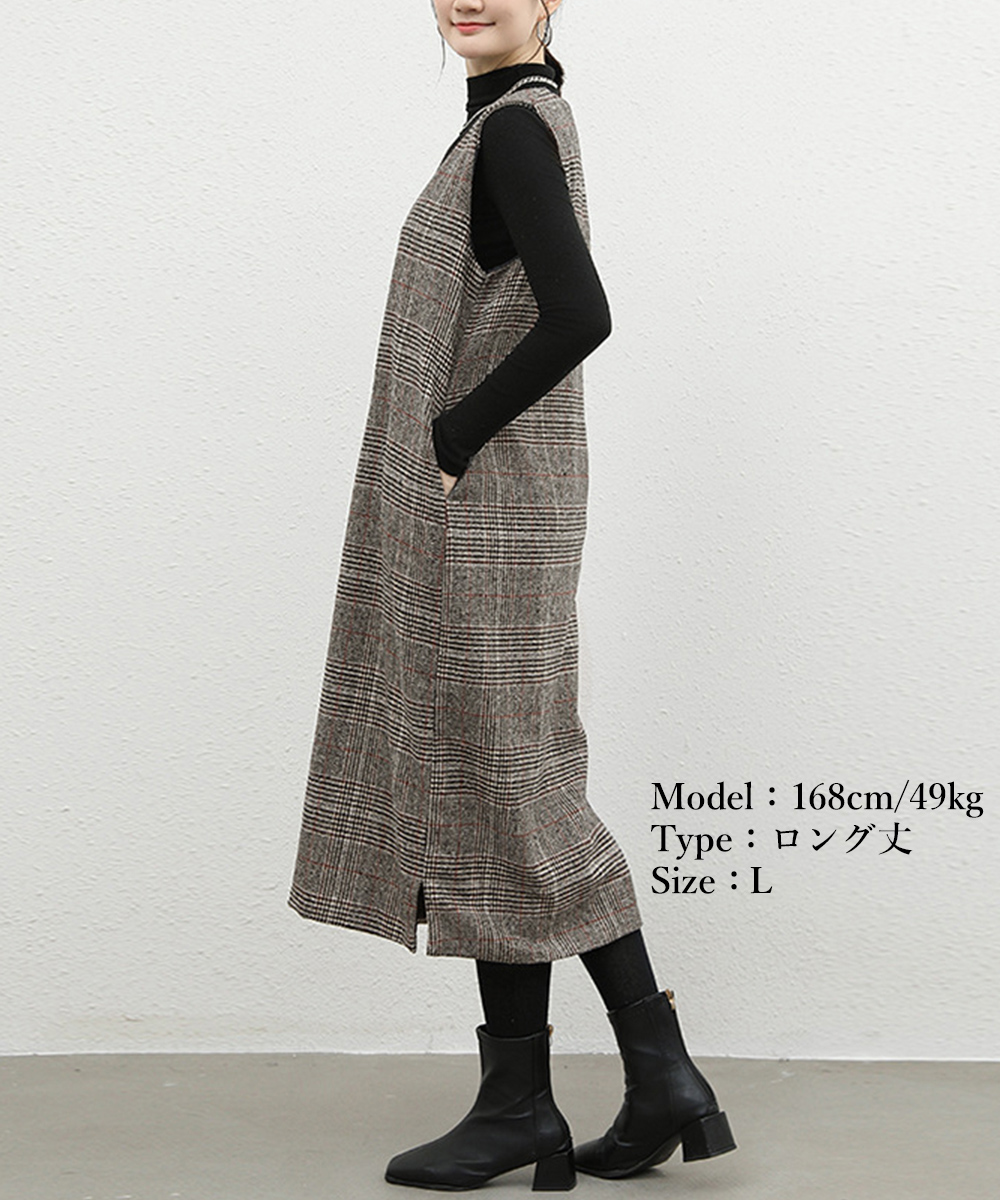 カラー:チェック柄 タイプ:ショート丈/ロング丈 サイズ:M/L ショート丈 [M]総丈:約89cm 肩幅:約35cm 身幅:約50cm 胸囲:約100cm ウエスト:約104cm ヒップ:約104cm [L]総丈:約93cm 肩幅:約35cm 身幅:約51cm 胸囲:約102cm ウエスト:約106cm ヒップ:約106cm ロング丈 [M]総丈:約112cm 肩幅:約35cm 身幅:約52cm 胸囲:約104cm ウエスト:108約cm ヒップ:約108cm [L]総丈:約116cm 肩幅:約35cm 身幅:約54cm 胸囲:約108cm ウエスト:約110cm ヒップ:約110cm 裏地:あり 伸縮性:なし 透け感:なし ※すべて平置きサイズです(採寸方法違いより、多少の誤差がございますので、ご了承ください)。