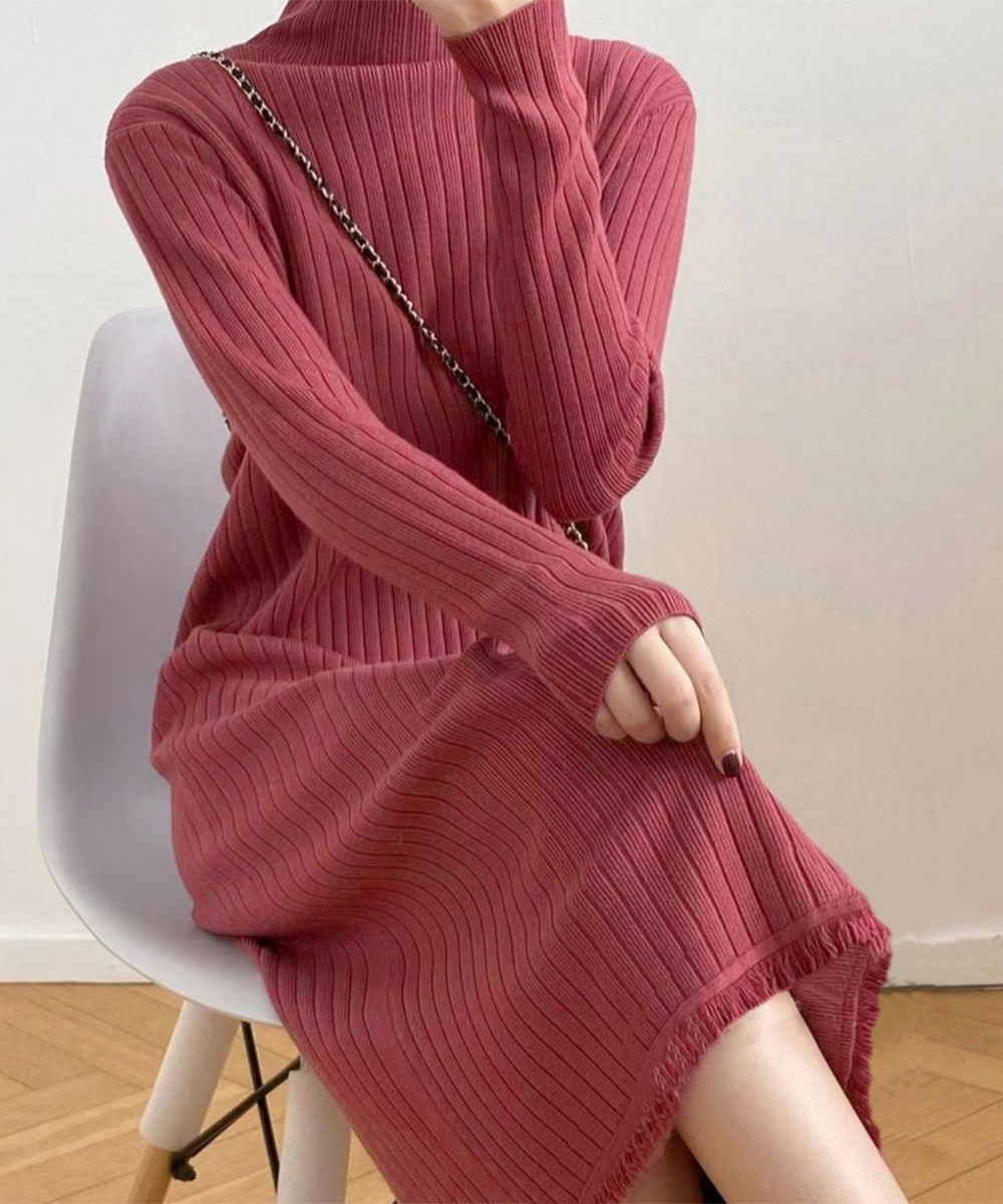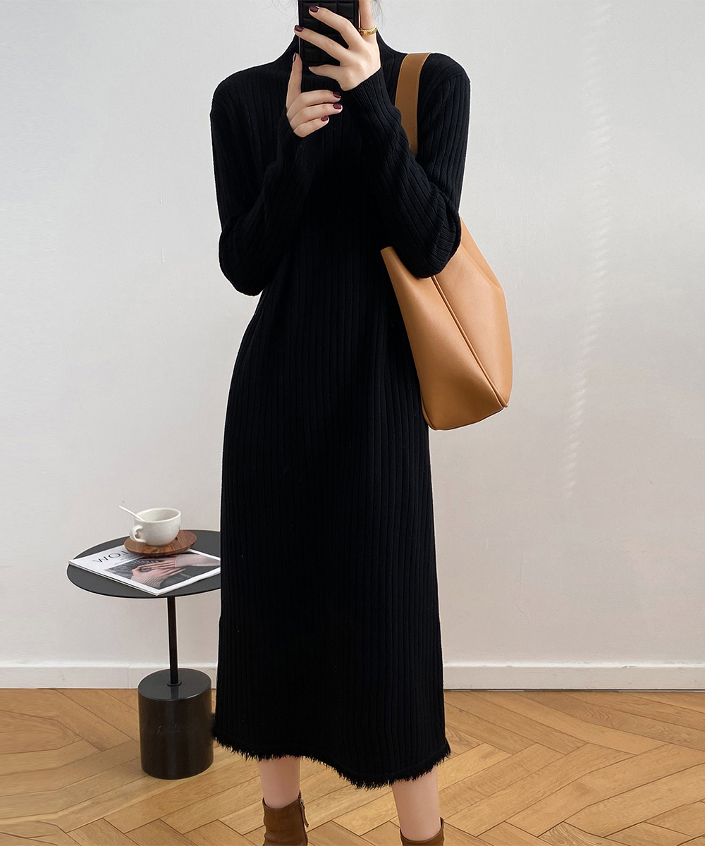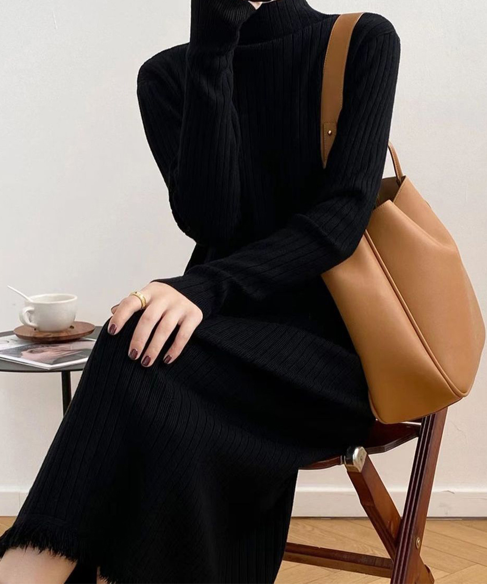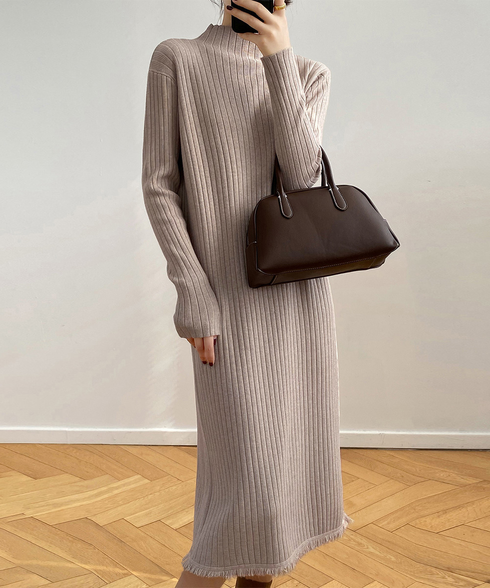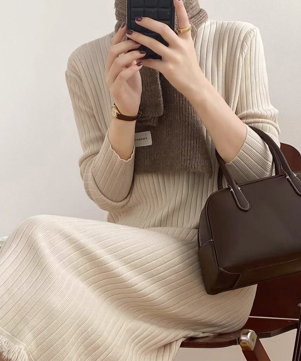 女性らしさと上品さを兼ね備えたリブニットのロングワンピース