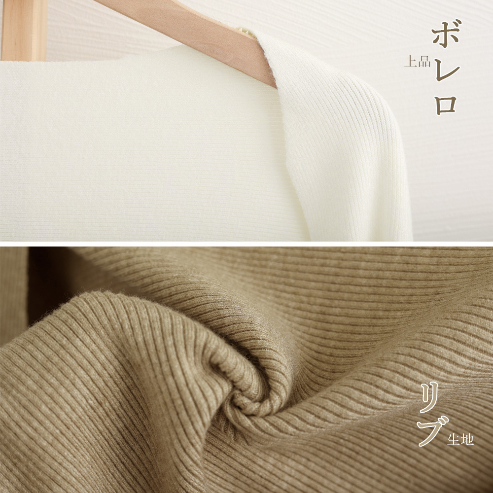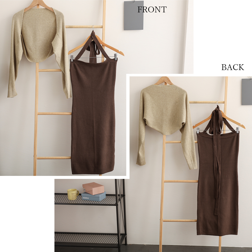 カラー:ブラック/オフホワイト/ブラウン/ネイビー サイズ:ワンサイズ ボレロ 着丈:約36.5cm ゆき:約69cm 胸囲:フリー ワンピース 着丈:約78cm 身幅:約34cm 胸囲:約68-100cm ウエスト:約65-130cm ヒップ:約68-150cm ★着丈のサイズ記載は肩紐部分は含みません。 ★肩紐は結び位置で長さ調節可能です。 裏地:なし 伸縮性:あり 透け感:なし
