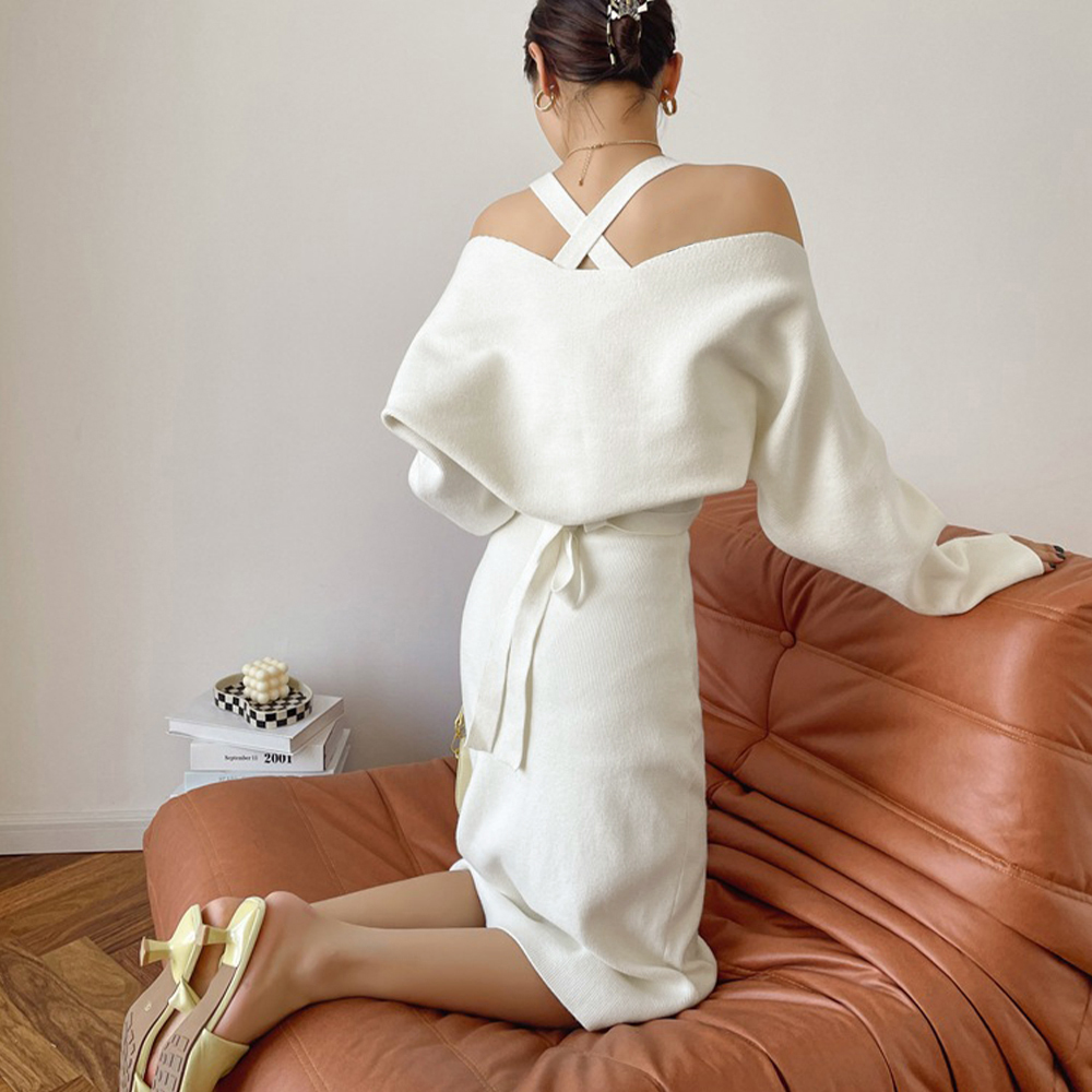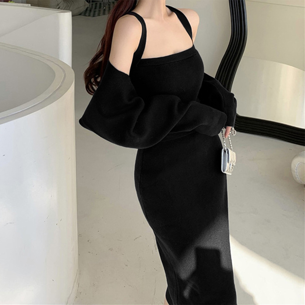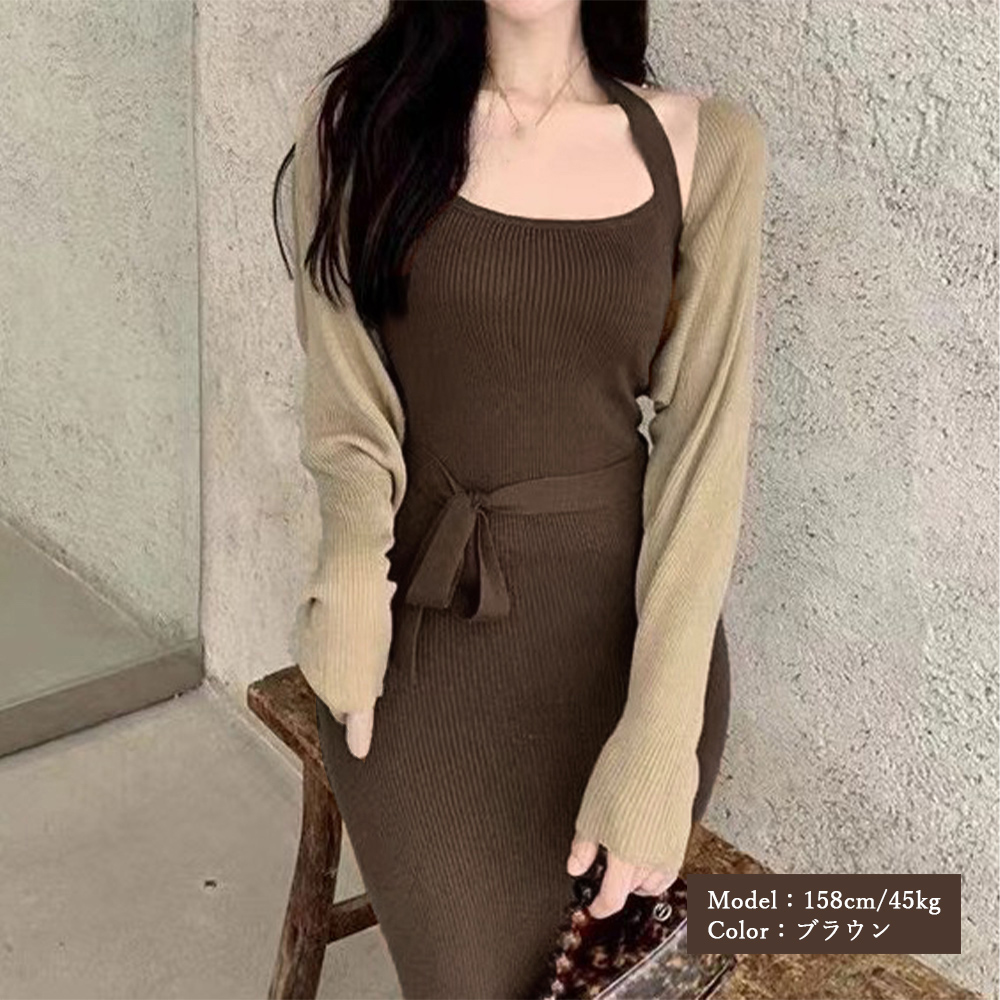 韓国風デザインのリブニット2点セット。キャミソール風ロングワンピースとショート丈カーディガンの組み合わせでフェミニンな印象に。