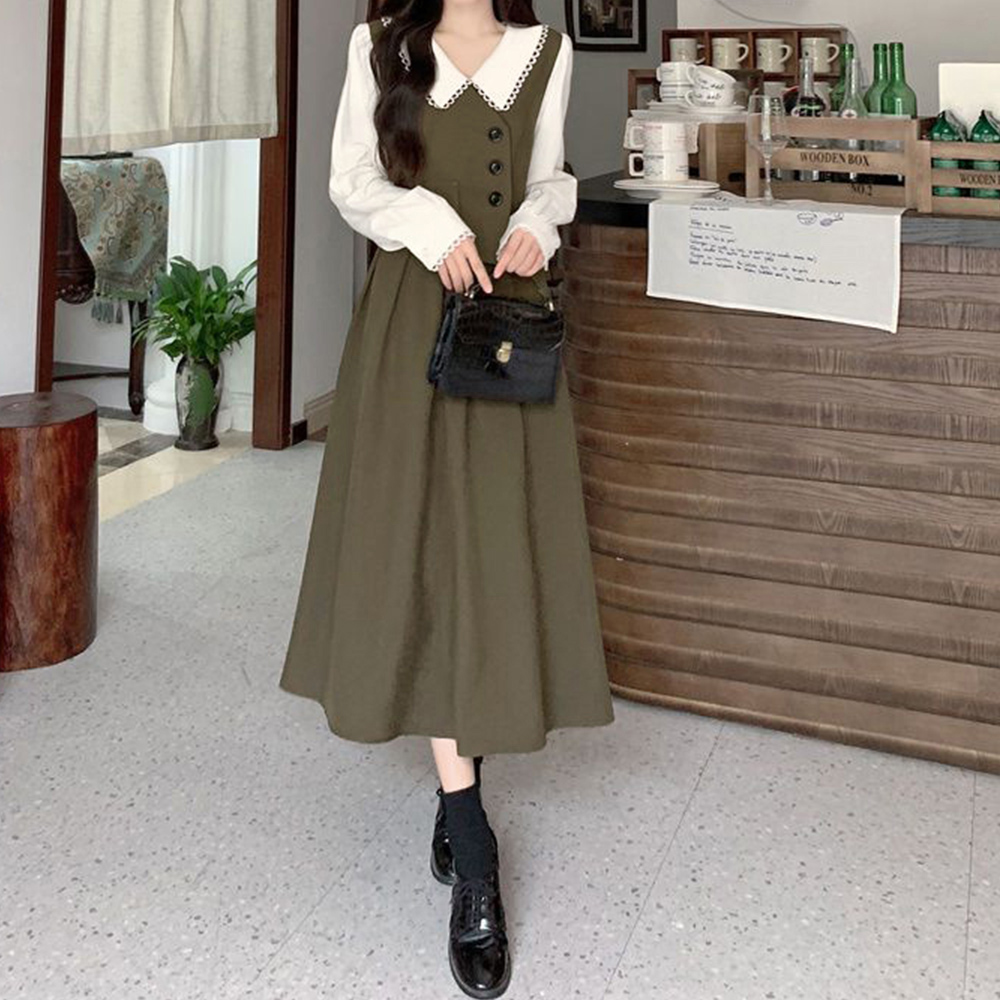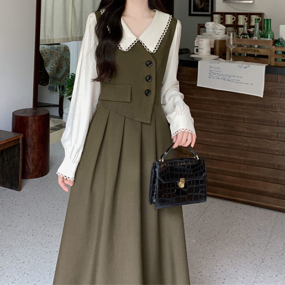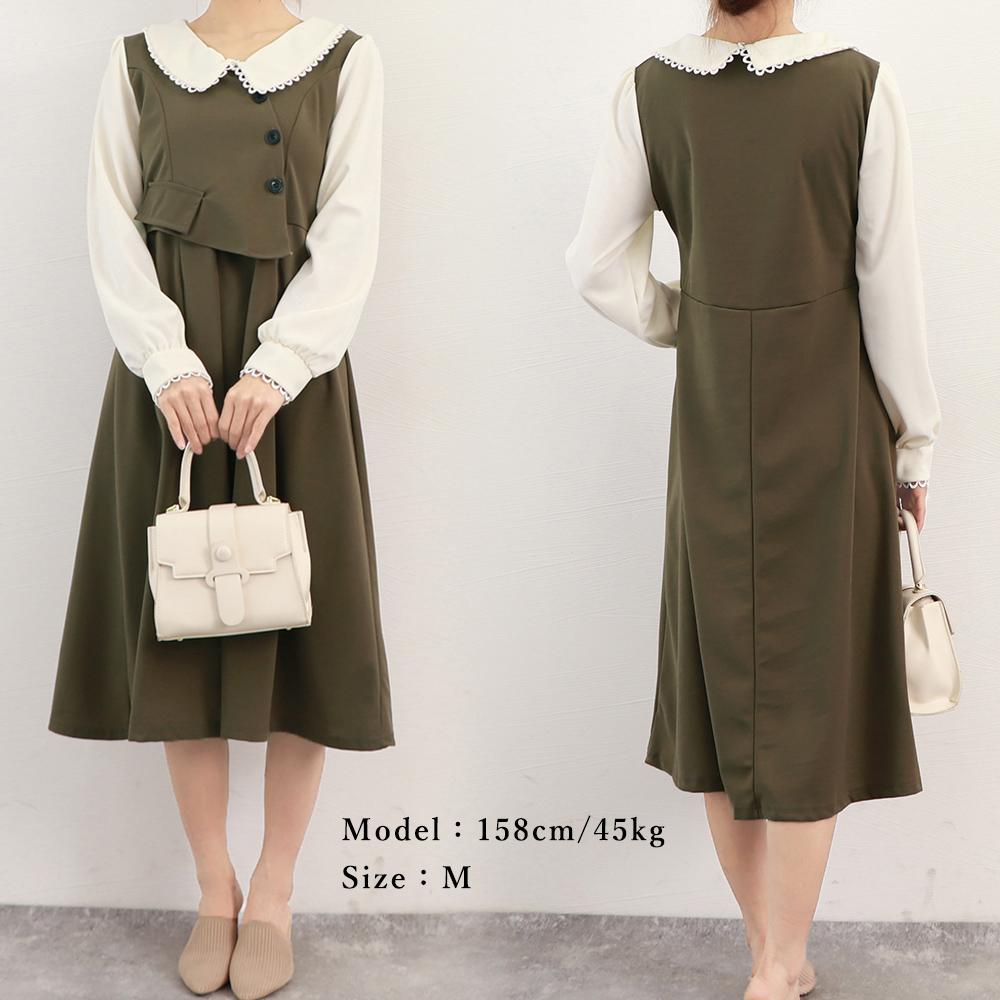 レディース大人可愛い重ね着風デザインのフレアロングワンピース。