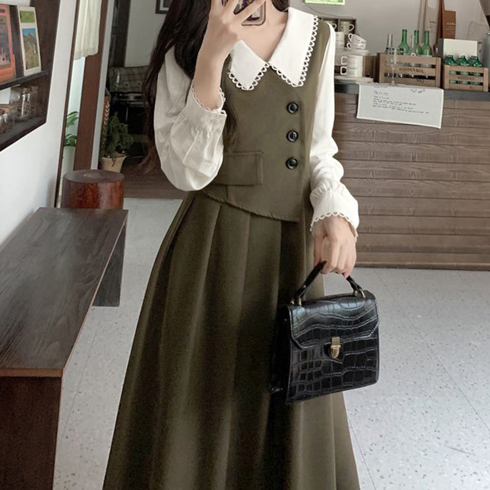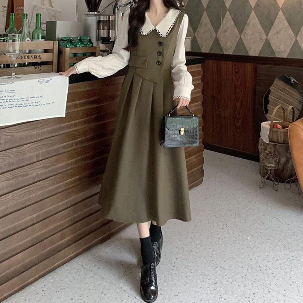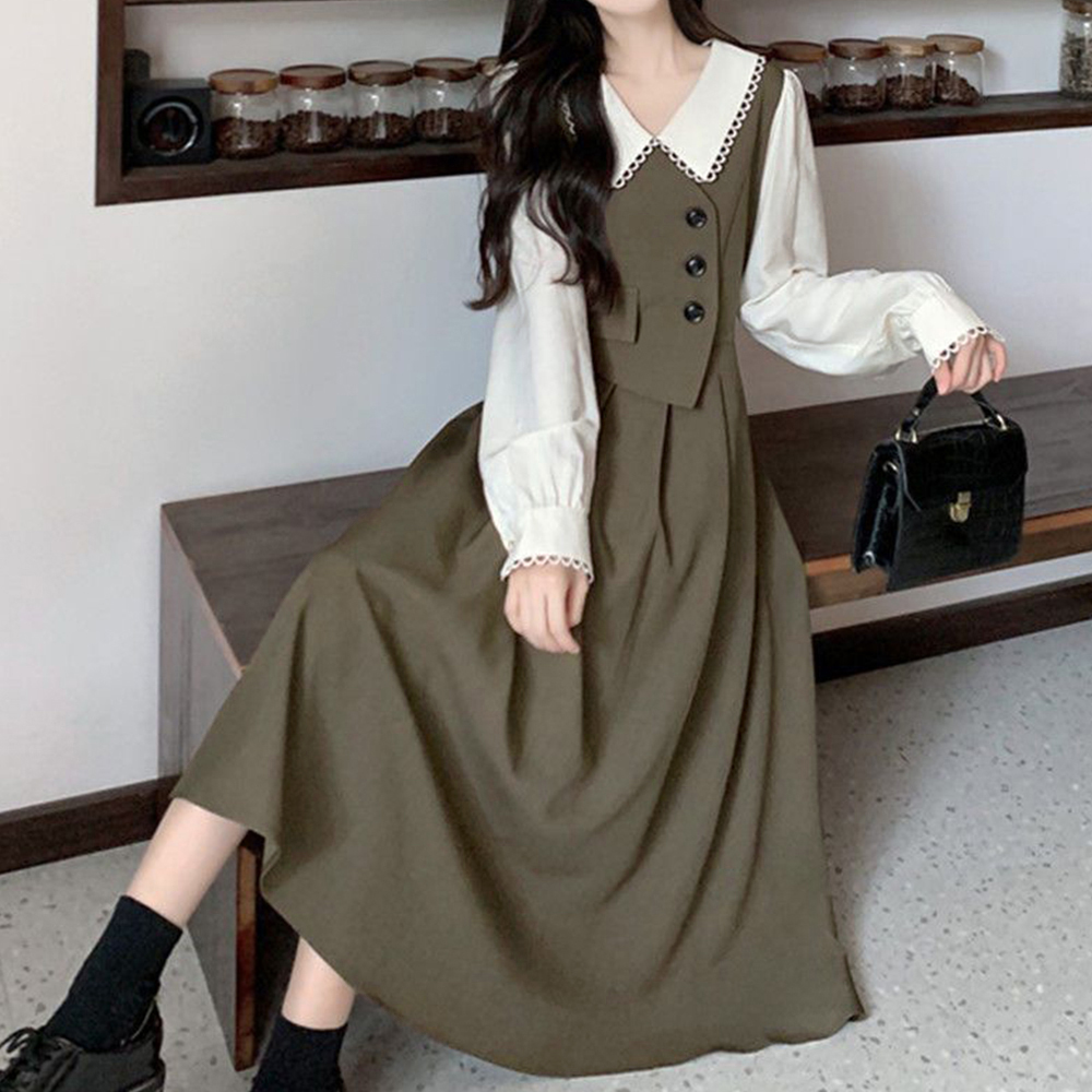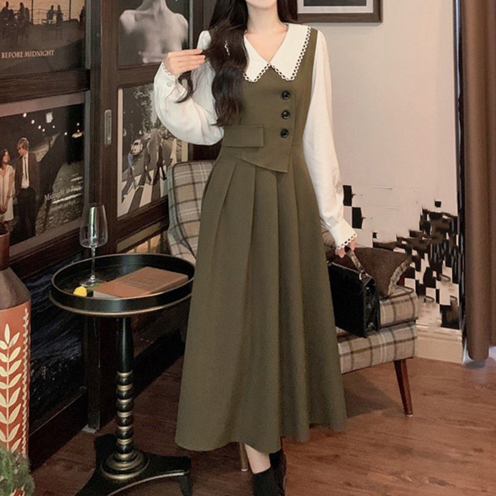 レディース大人可愛い重ね着風デザインのフレアロングワンピース。