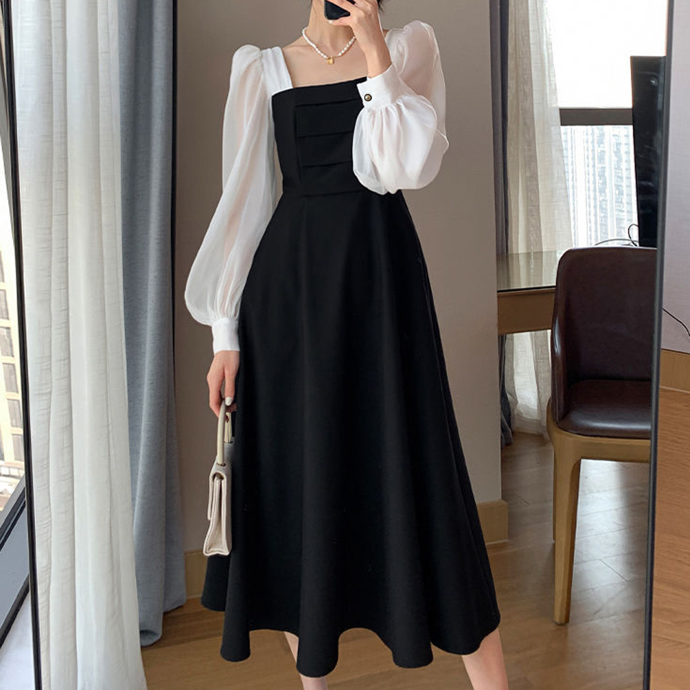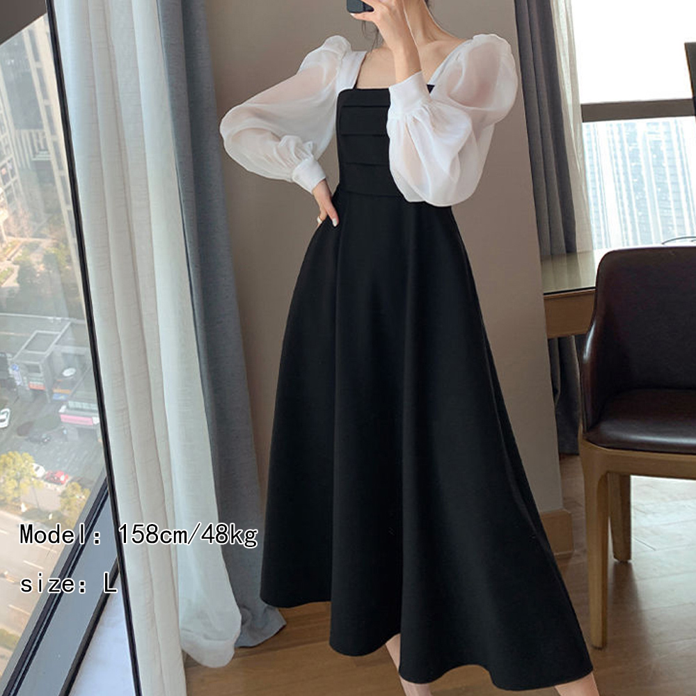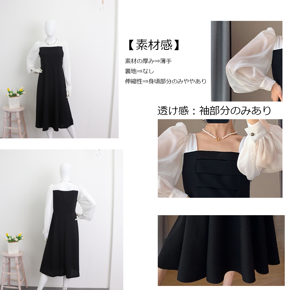 素材:ポリエステル100% カラー:ブラック*ホワイト サイズ:M/L/XL [M]総丈:約110cm 肩幅:約29cm 袖丈:約60cm ゆき:約74.5cm 身幅:約37cm 胸囲:約74cm ウエスト:約68cm ヒップ:約104cm [L]総丈:約111cm 肩幅:約30cm 袖丈:約61cm ゆき:約76cm 身幅:約40cm 胸囲:約80cm ウエスト:約74cm ヒップ:約108cm [XL]総丈:約112cm 肩幅:約31cm 袖丈:約62cm ゆき:約77.5cm 身幅:約43cm 胸囲:約86cm ウエスト:約80cm ヒップ:約112cm 裏地:なし 伸縮性:身頃部分のみややあり 透け感:袖部分のみあり ※すべて平置きサイズです(採寸方法違いより、多少の誤差がございますので、ご了承ください)。