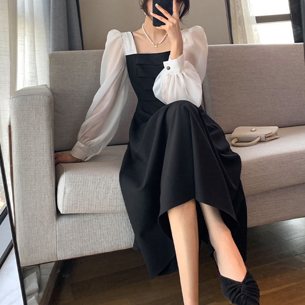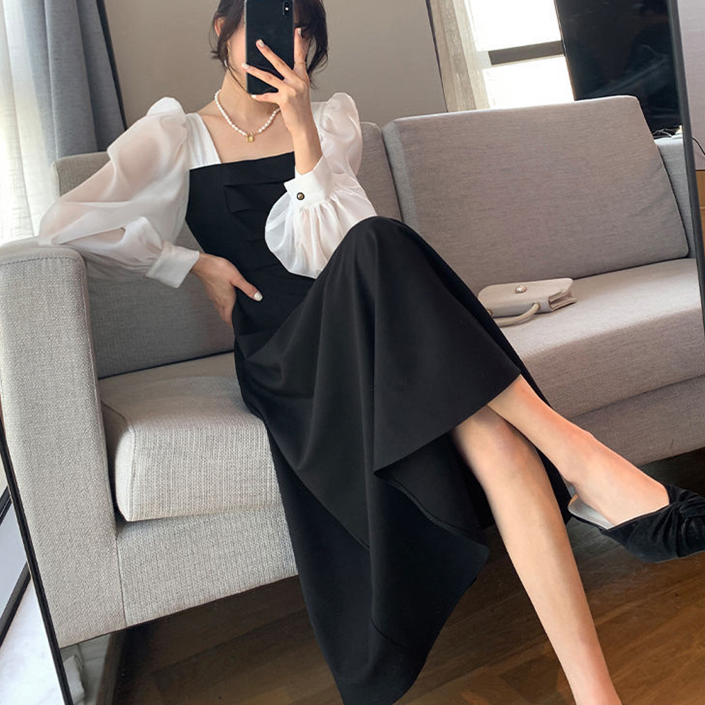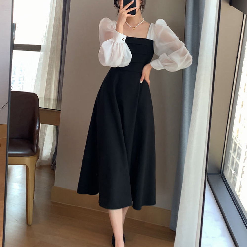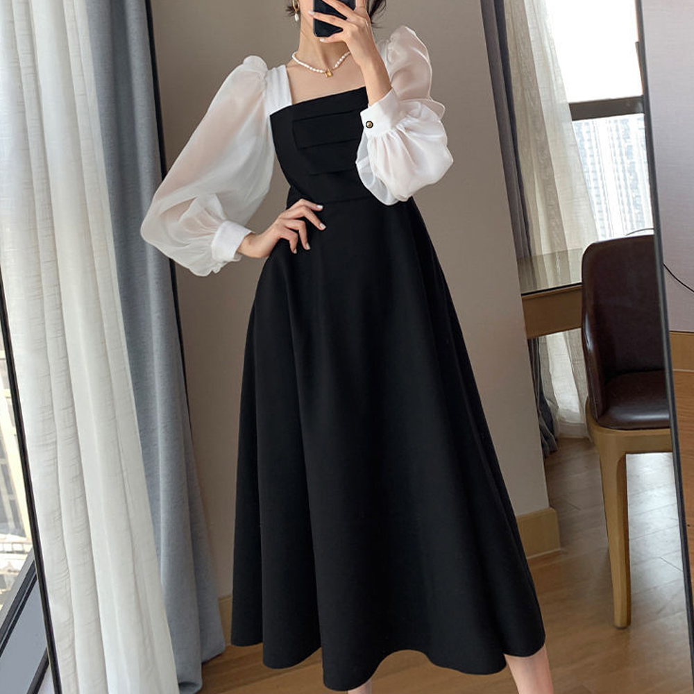 素材:ポリエステル100% カラー:ブラック*ホワイト サイズ:M/L/XL [M]総丈:約110cm 肩幅:約29cm 袖丈:約60cm ゆき:約74.5cm 身幅:約37cm 胸囲:約74cm ウエスト:約68cm ヒップ:約104cm [L]総丈:約111cm 肩幅:約30cm 袖丈:約61cm ゆき:約76cm 身幅:約40cm 胸囲:約80cm ウエスト:約74cm ヒップ:約108cm [XL]総丈:約112cm 肩幅:約31cm 袖丈:約62cm ゆき:約77.5cm 身幅:約43cm 胸囲:約86cm ウエスト:約80cm ヒップ:約112cm 裏地:なし 伸縮性:身頃部分のみややあり 透け感:袖部分のみあり ※すべて平置きサイズです(採寸方法違いより、多少の誤差がございますので、ご了承ください)。