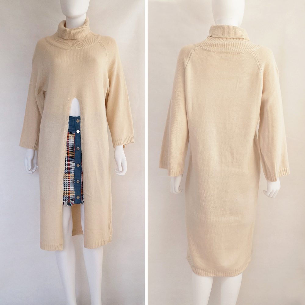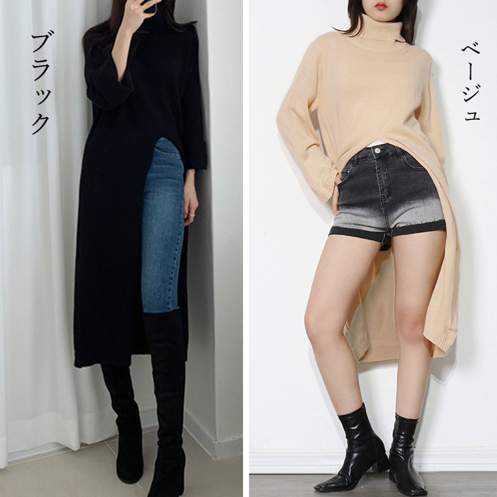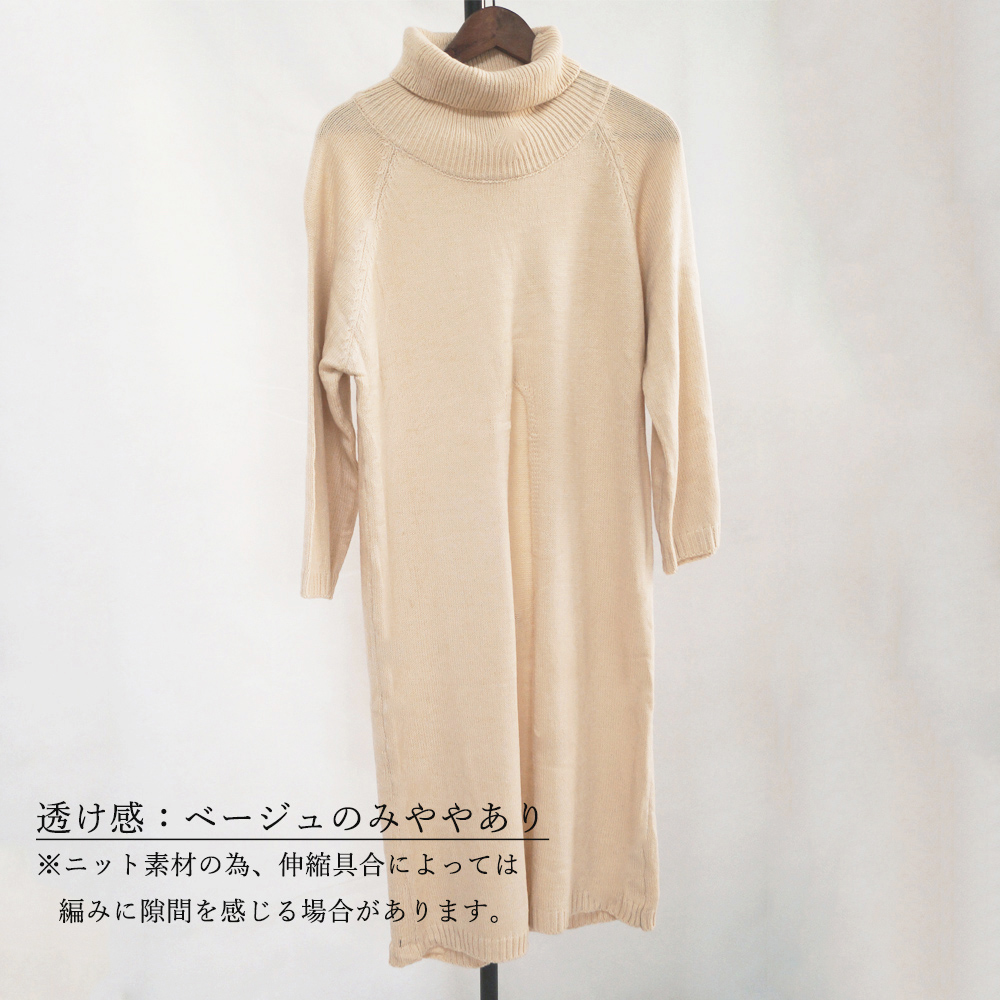 素材:ポリエステル75%+アクリル25% カラー:ブラック/ベージュ サイズ:ワンサイズ 総丈:約112cm ゆき:約69cm 身幅:約48cm 胸囲:約96-120cm ウエスト:約98-122cm ヒップ:約98-122cm 裏地:なし 伸縮性:あり 透け感:ベージュのみややあり ※ニット素材の為、伸縮具合によっては編みに隙間を感じる場合があります。 ※すべて平置きサイズです(採寸方法違いより、多少の誤差がございますので、ご了承ください)。