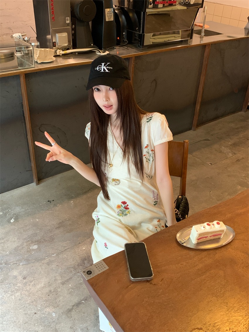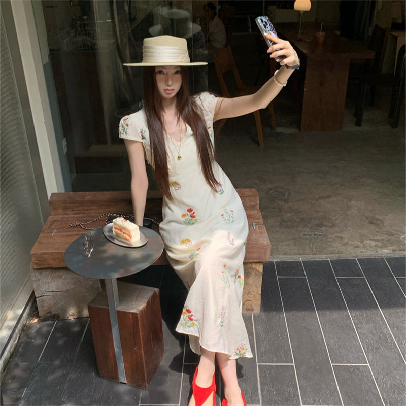 優雅な花柄刺繍が魅力的なフレアタイプのロングワンピースです。