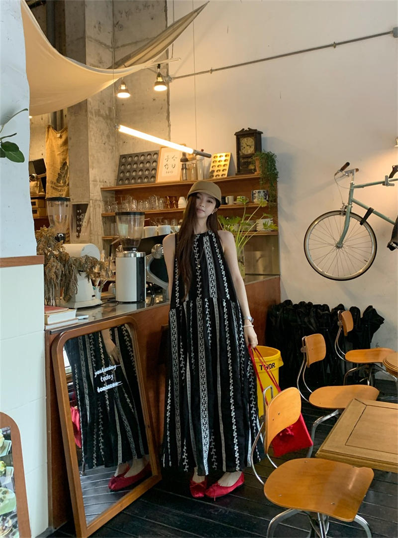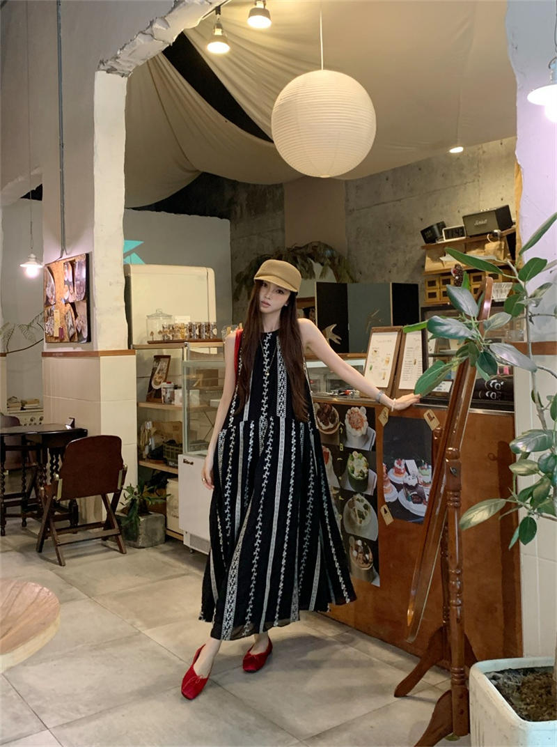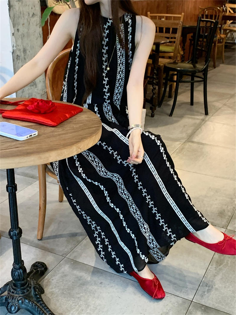 上品な花柄ストライプが印象的なノースリーブロングワンピース。