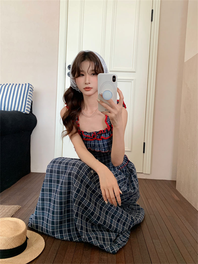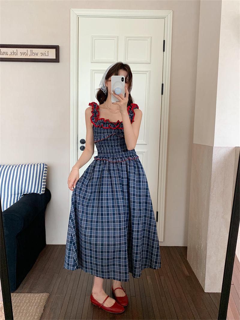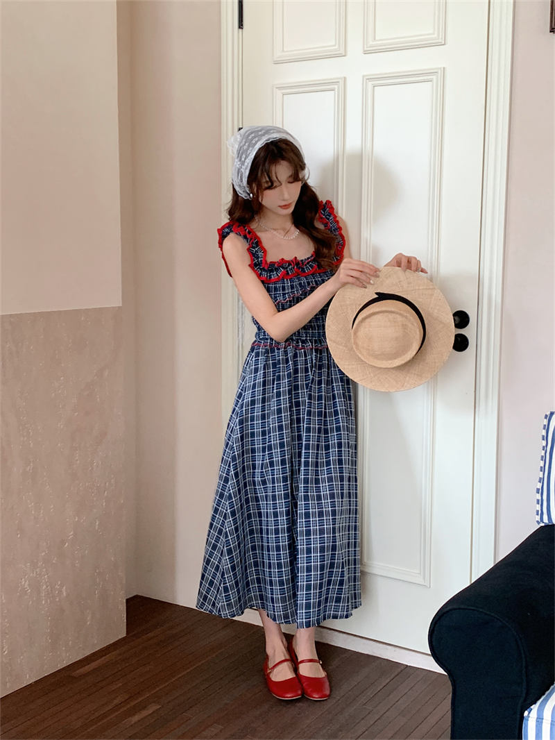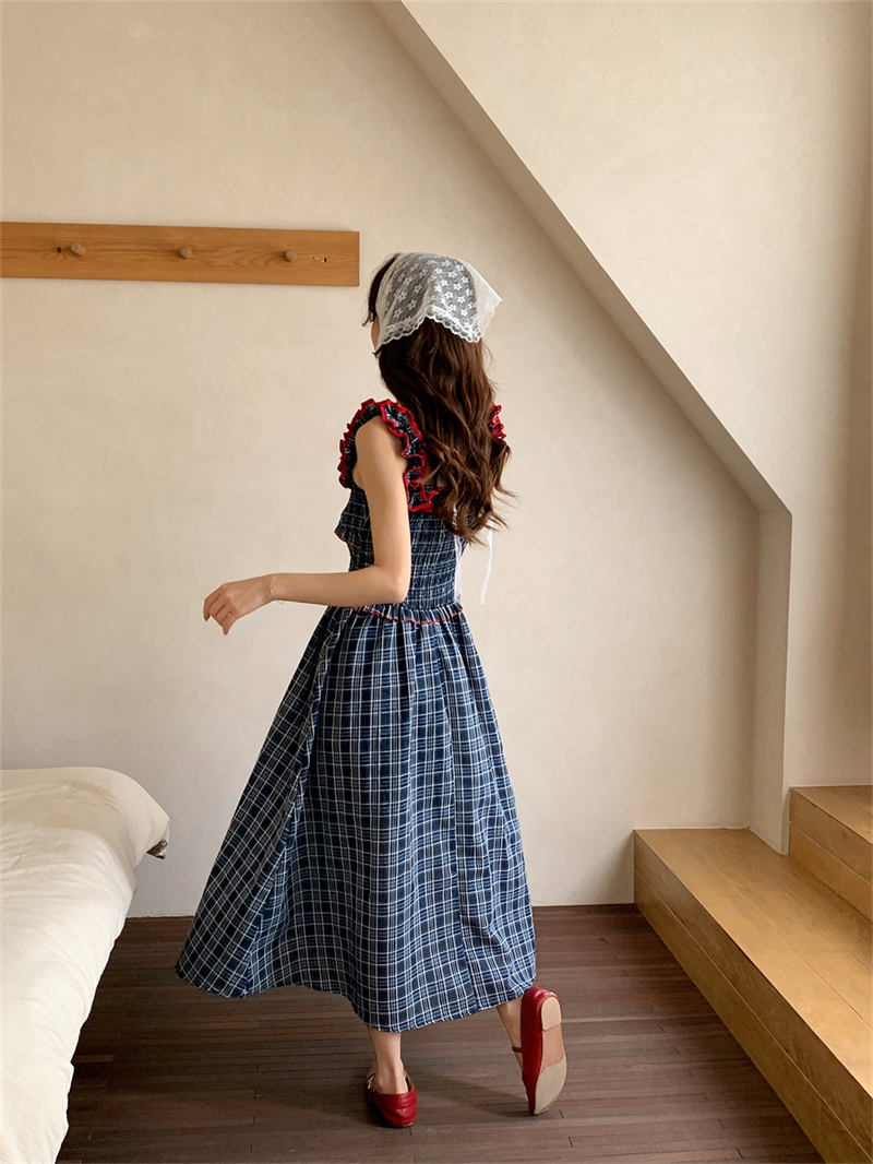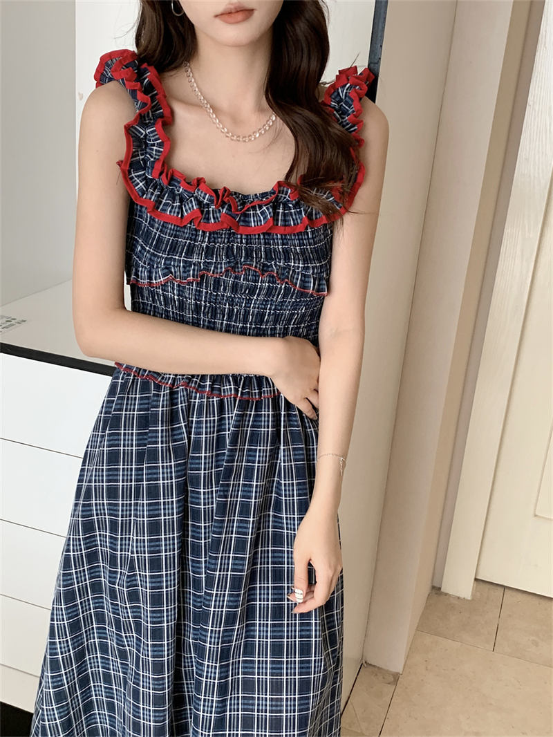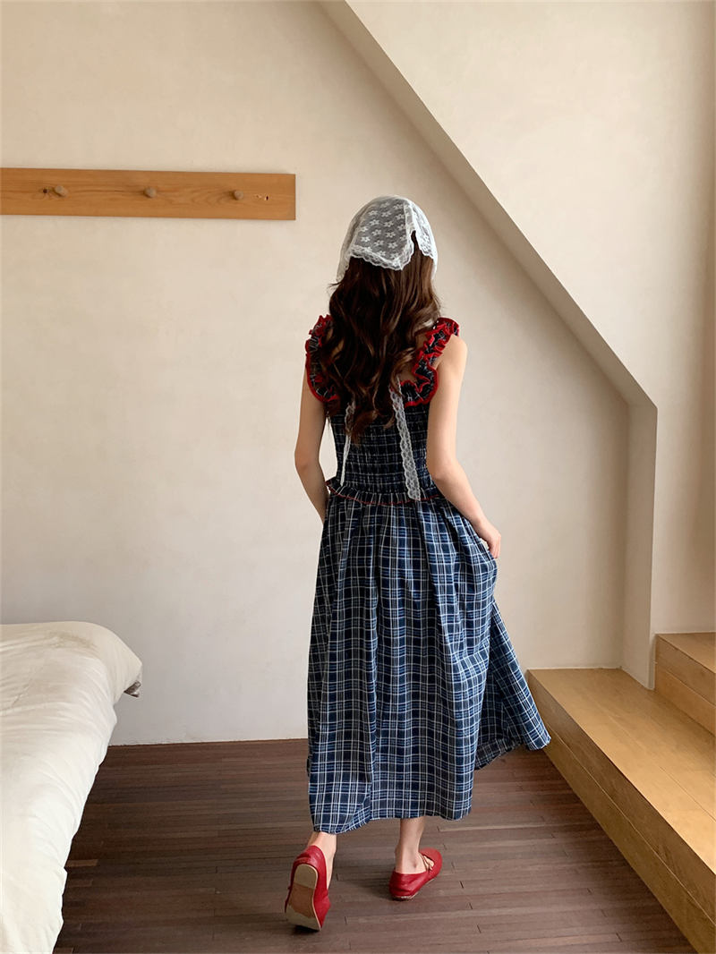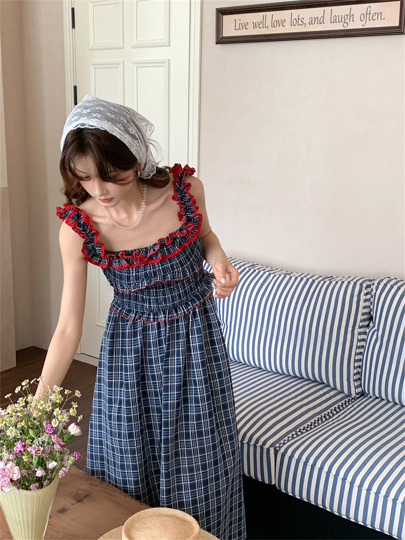 赤いフリルがアクセントのチェック柄デザインで、どんなシーンにもマッチする上品なスタイル。