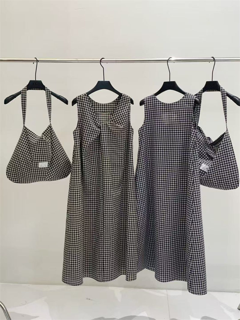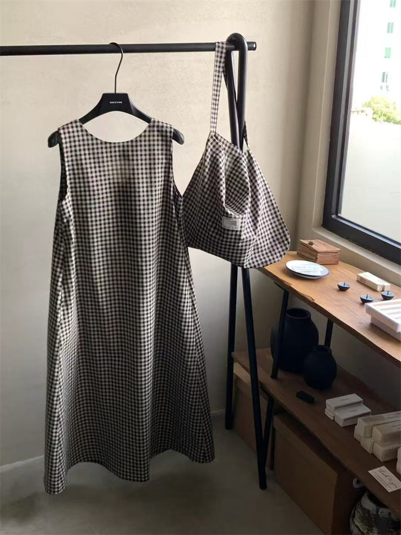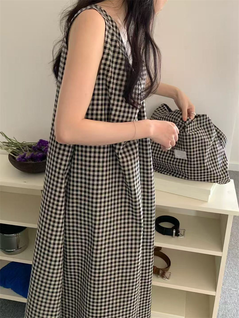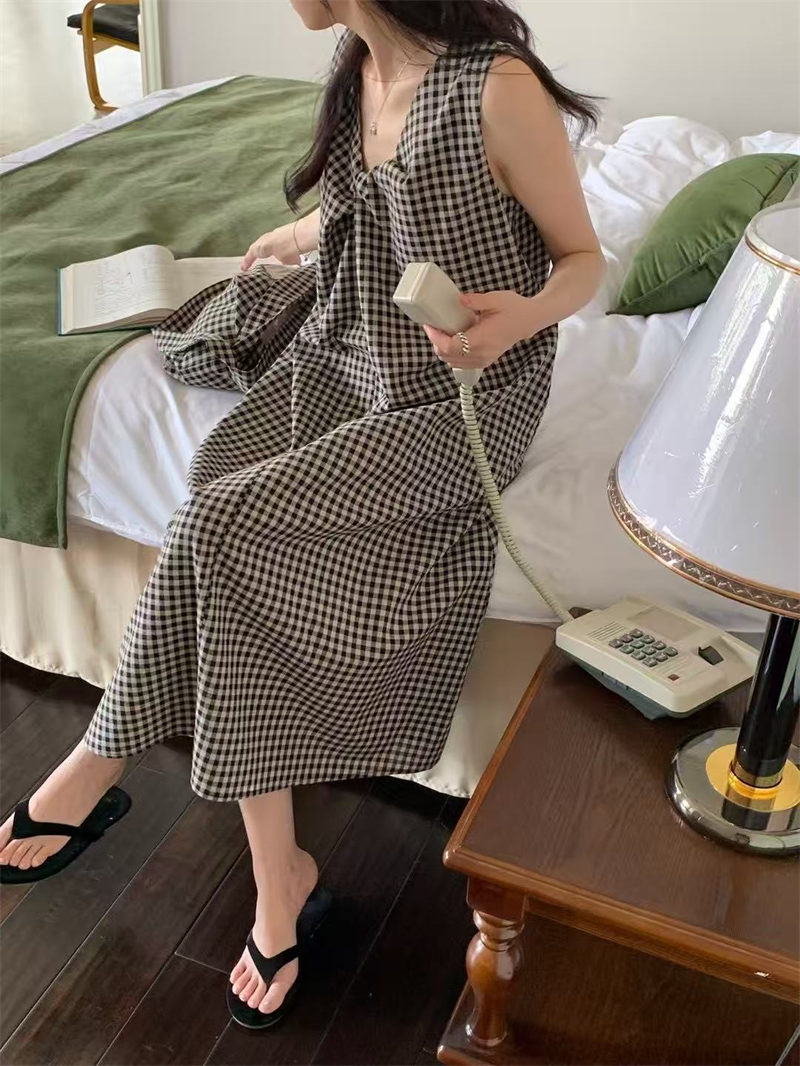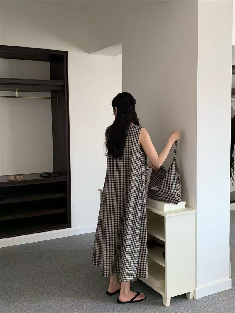 上品なギンガムチェック柄が魅力的なノースリーブのロングワンピースです。