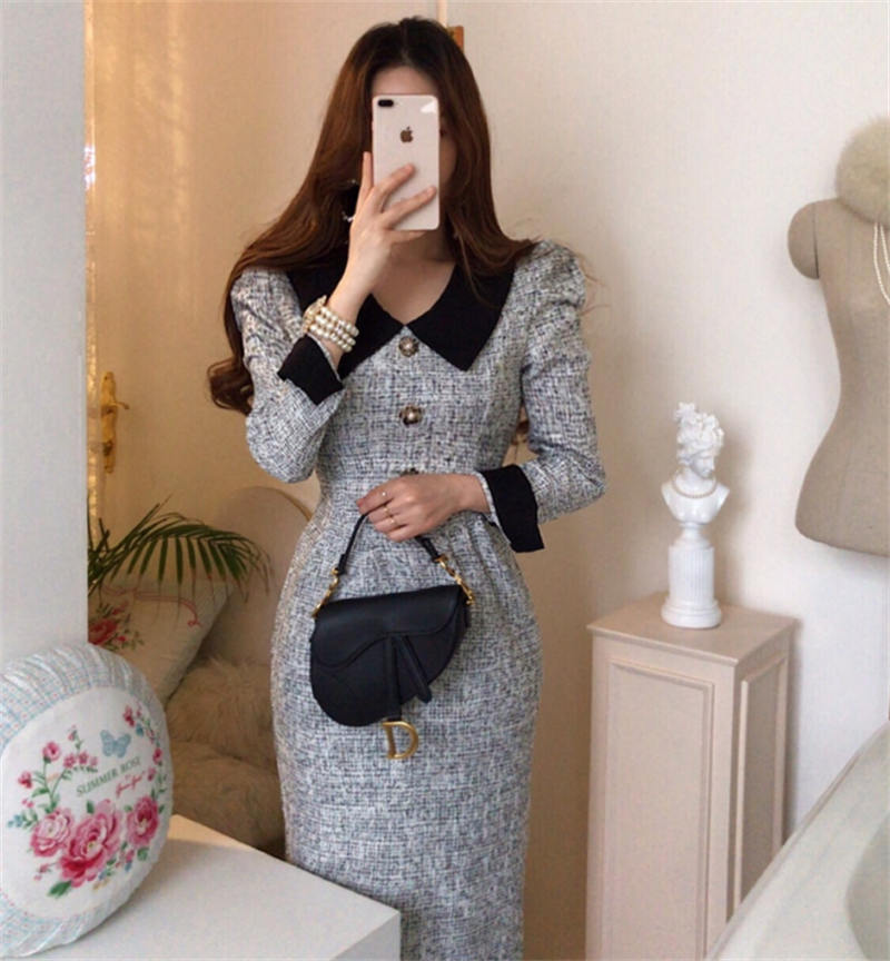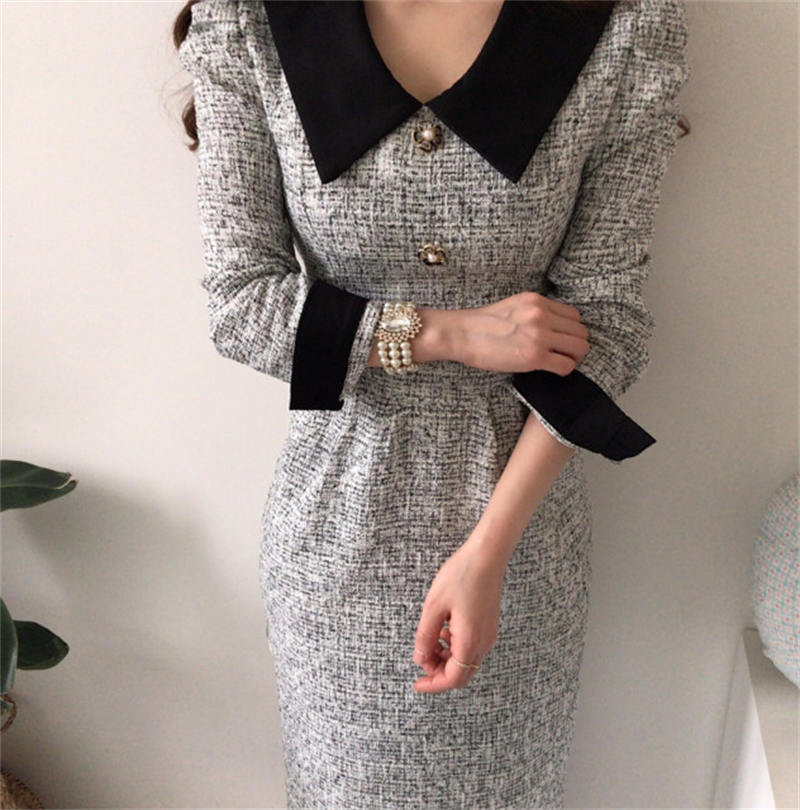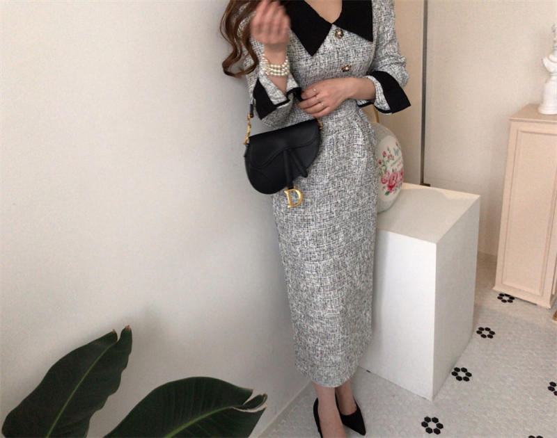 上品なツイード素材を使用したエレガントなロングワンピース。