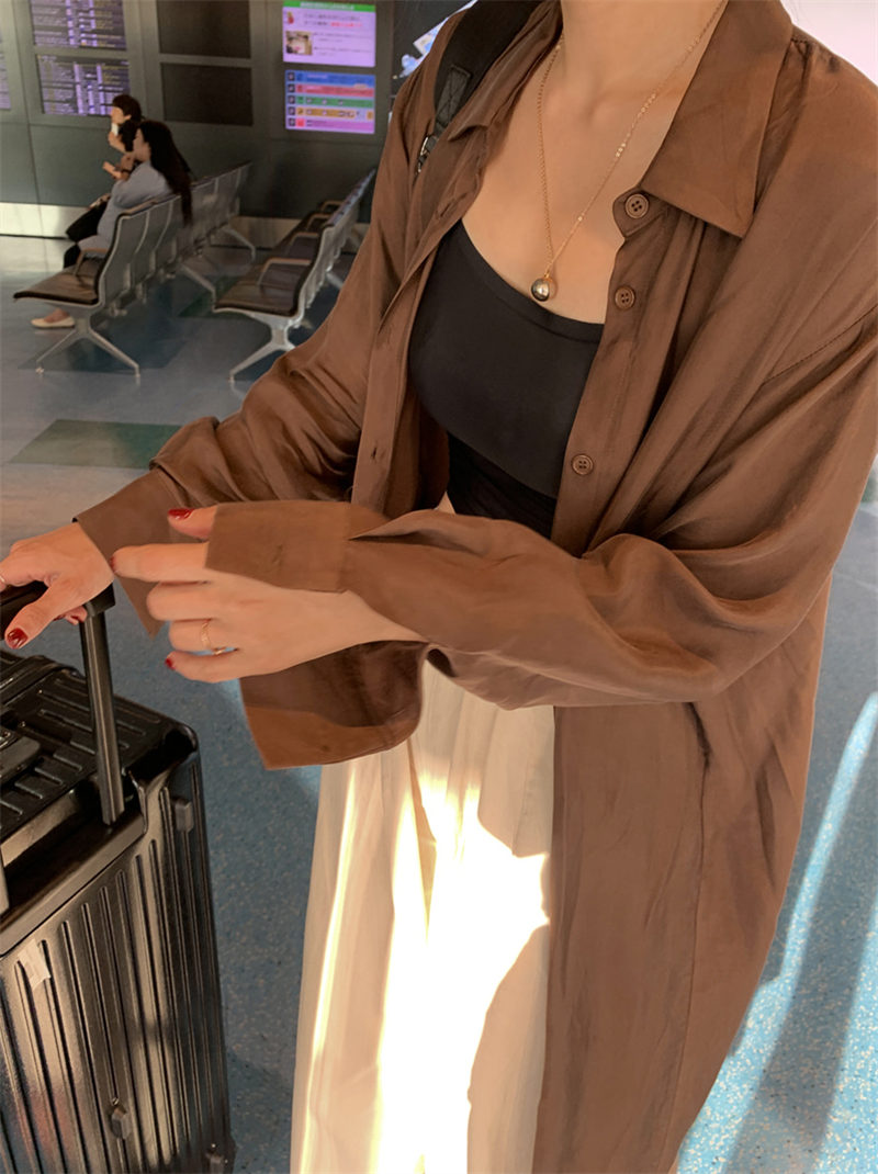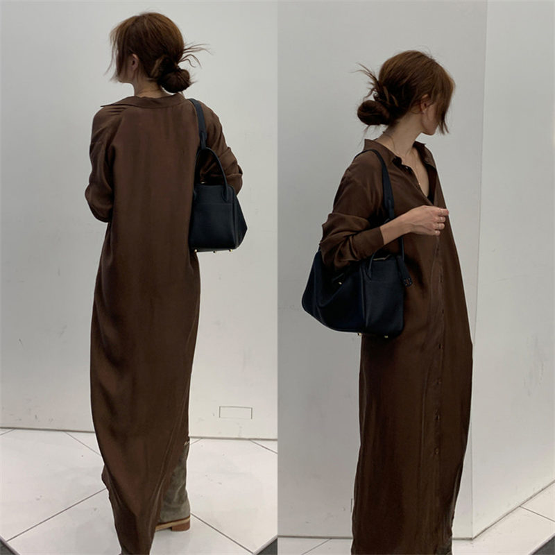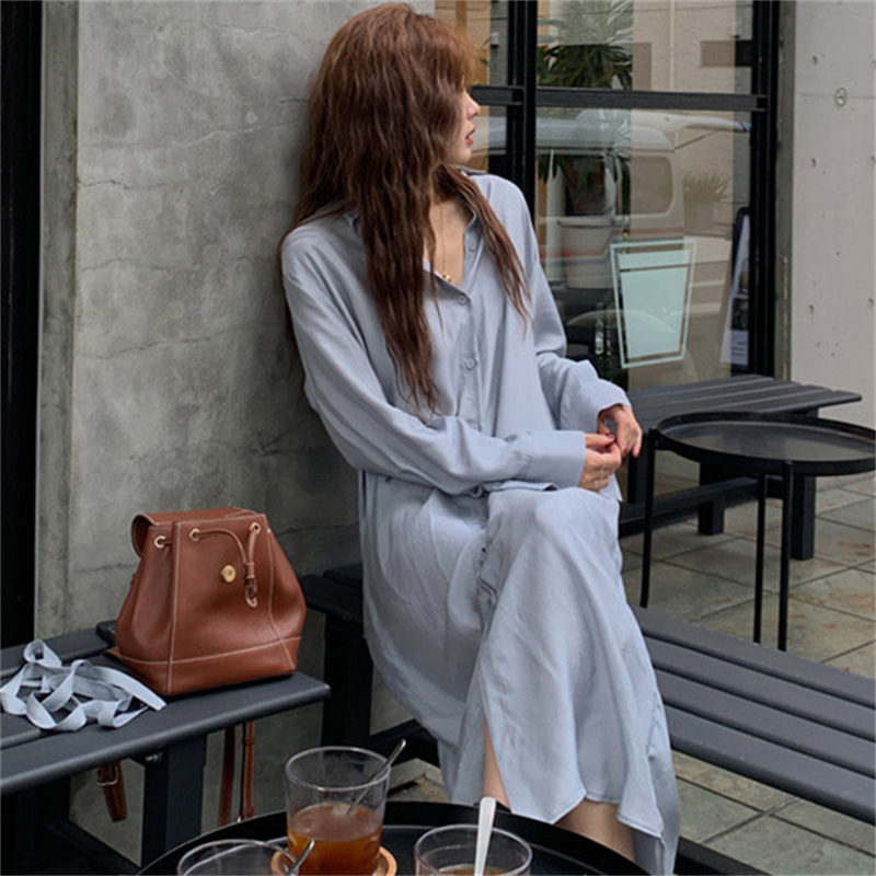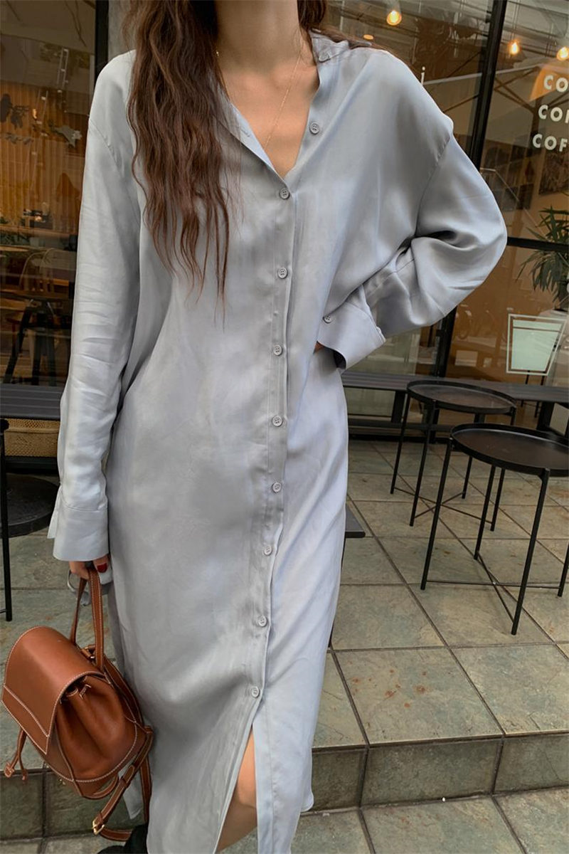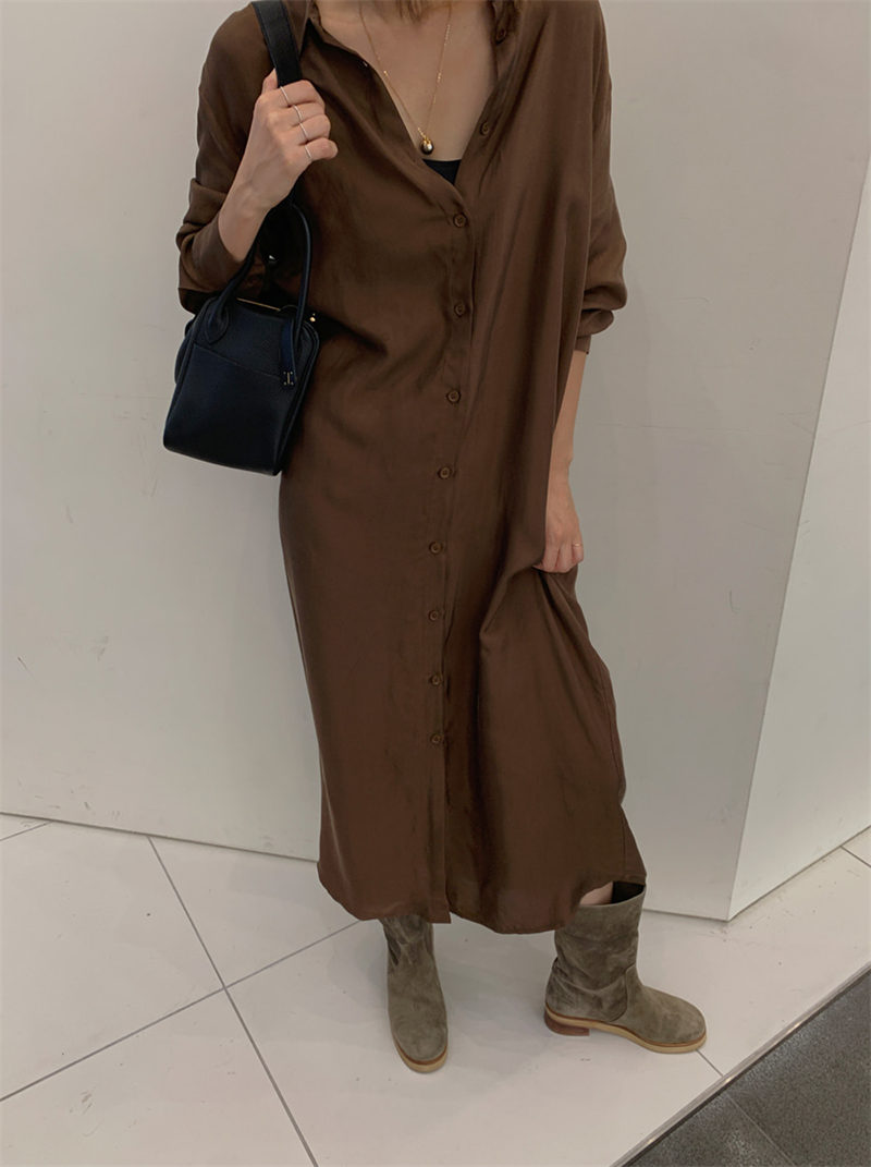 今季注目の韓国風デザインが魅力的なシャツタイプのロングワンピース。