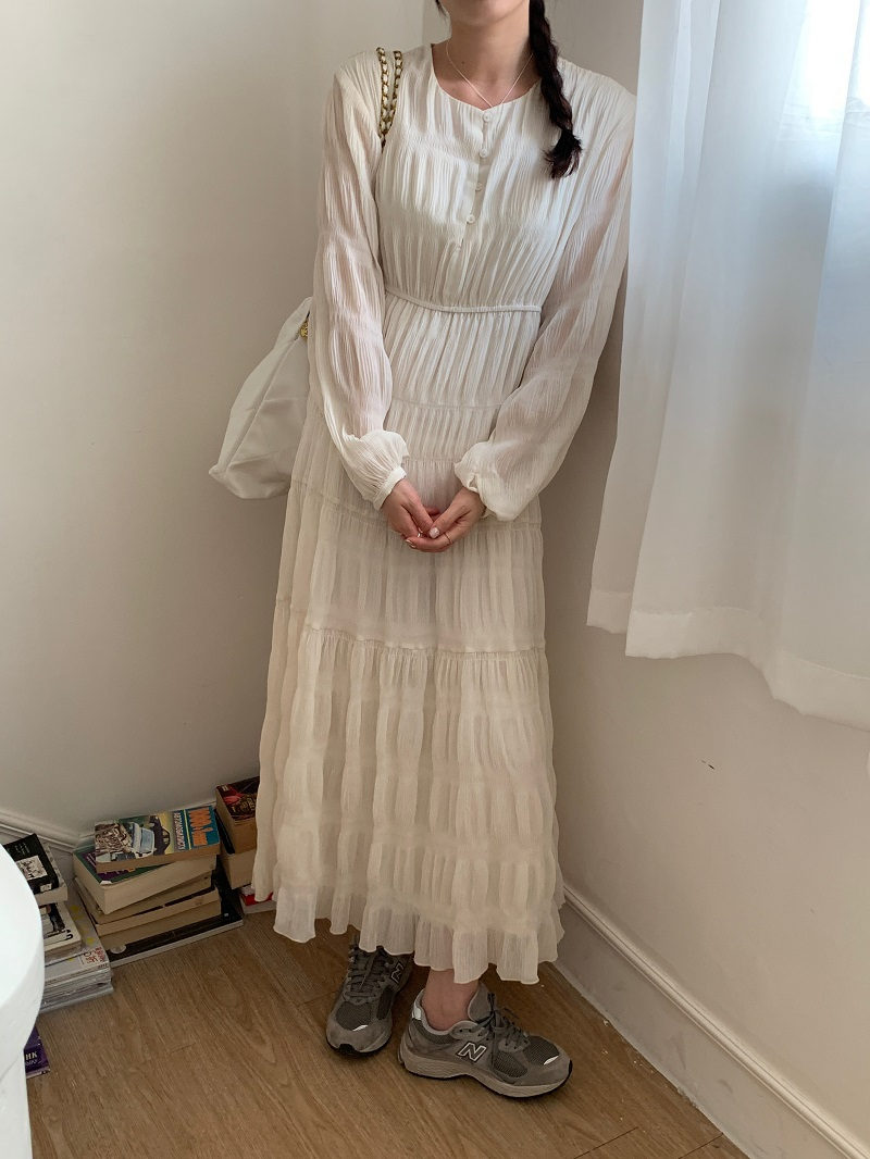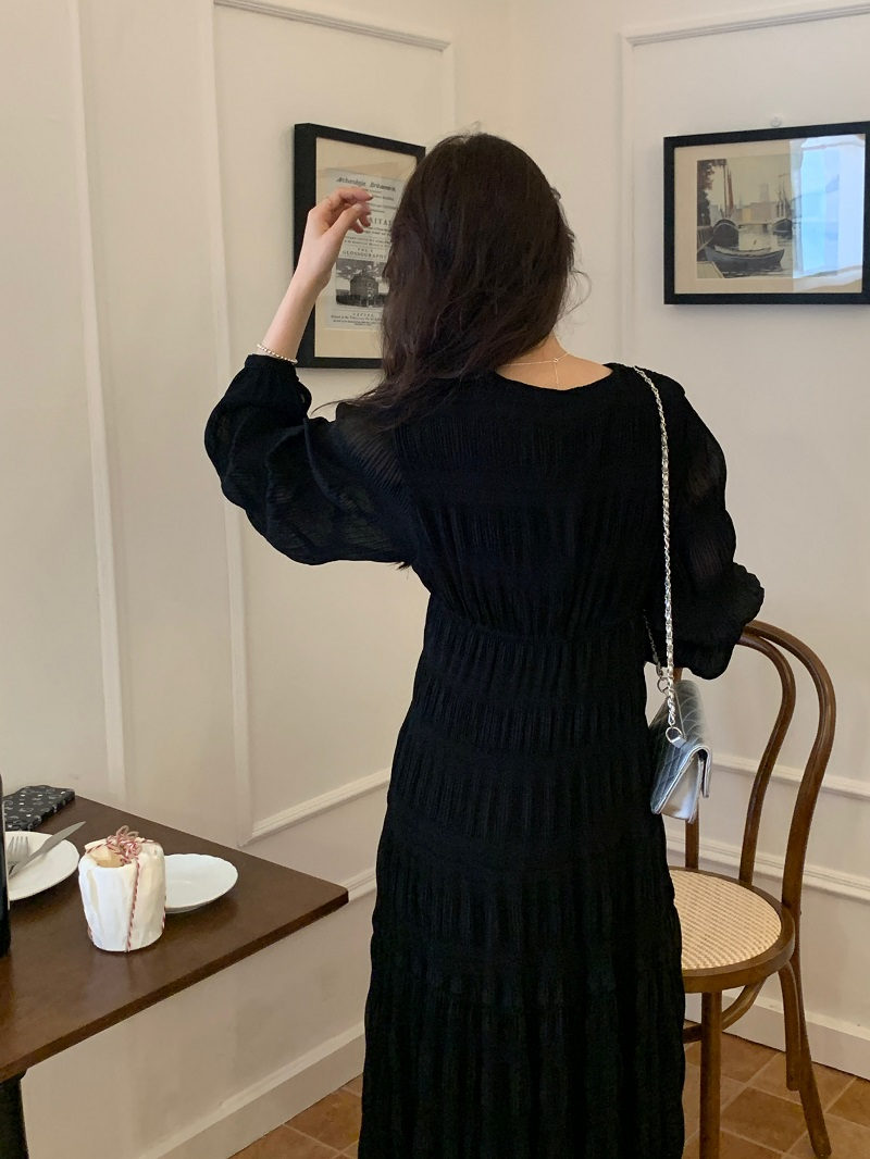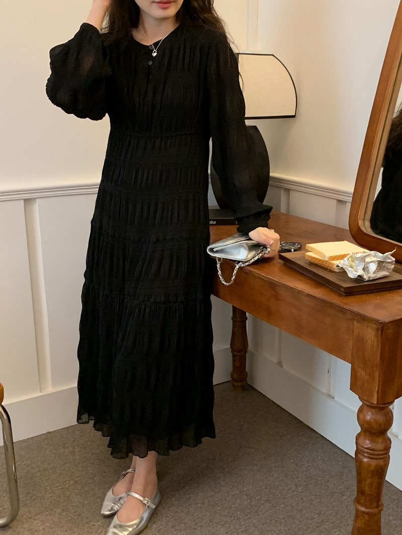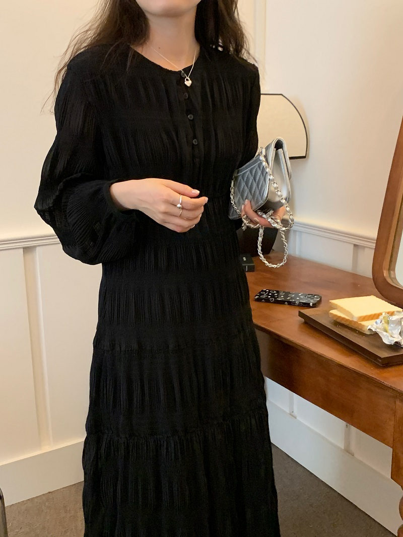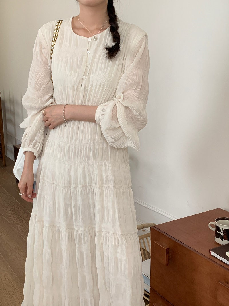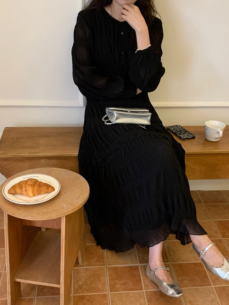 上品なレースとプリーツが美しい韓国風ロングワンピース。