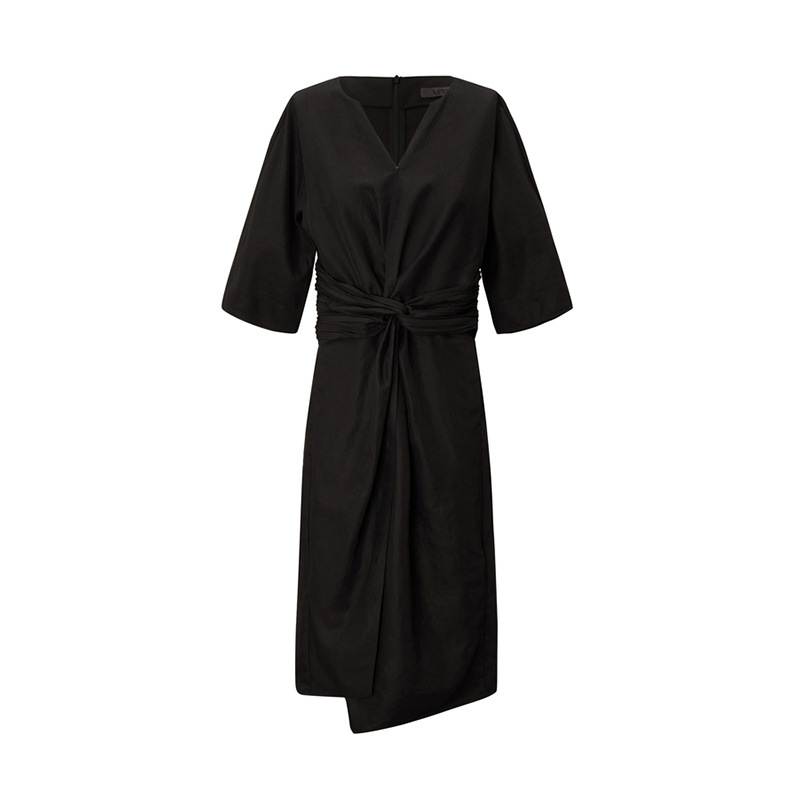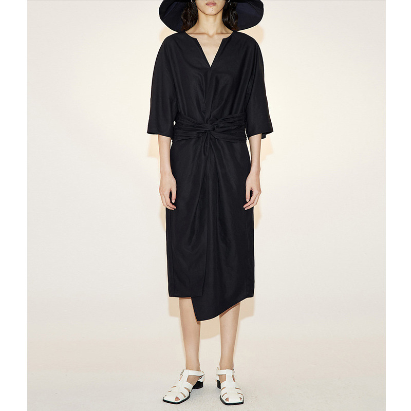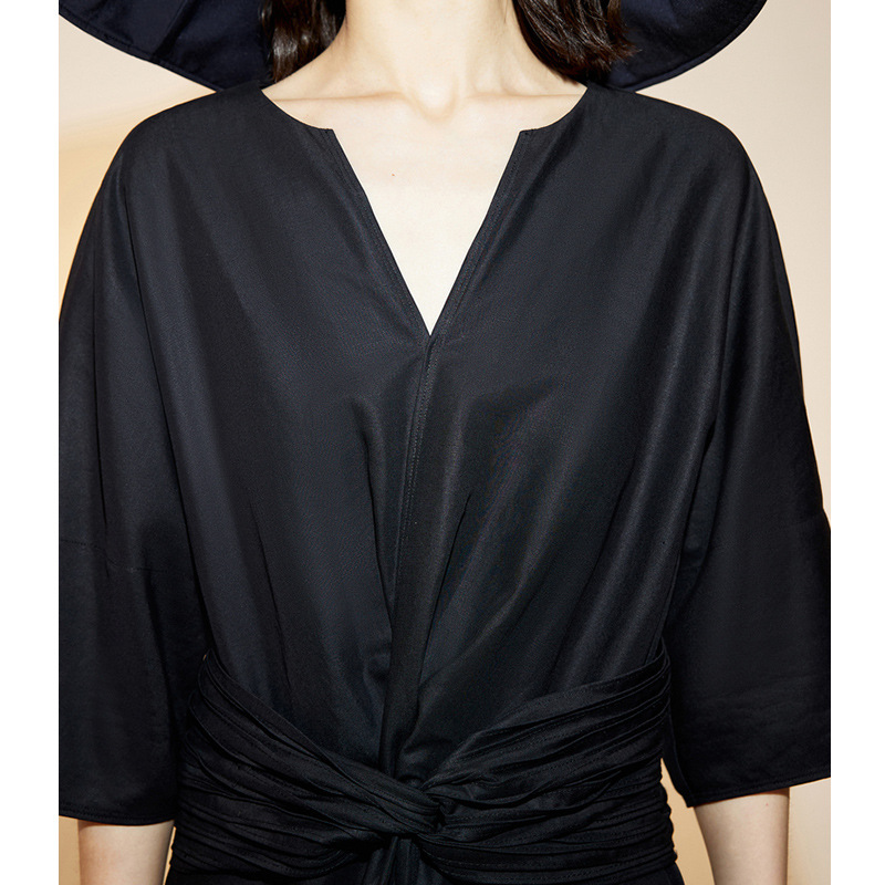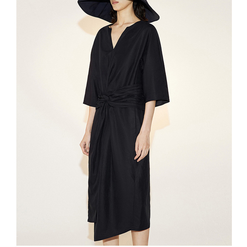 エレガントな深Vネックとウエストリボンが魅力的なフレアシルエットのロングワンピース。
