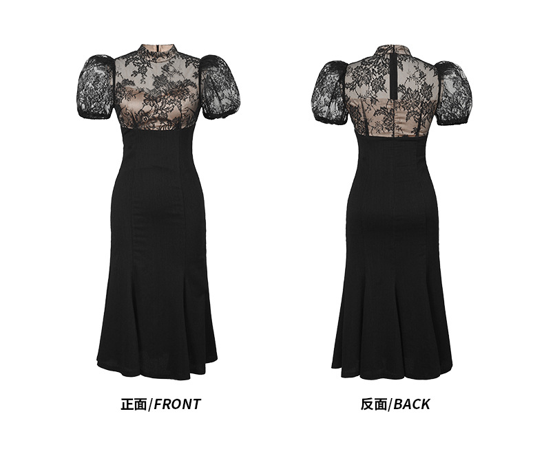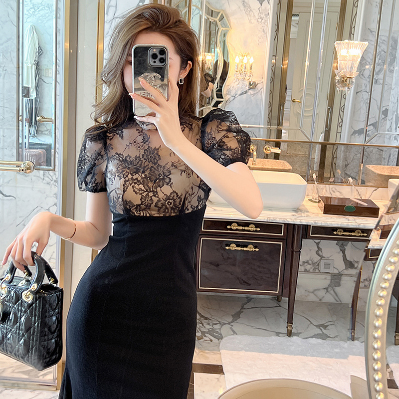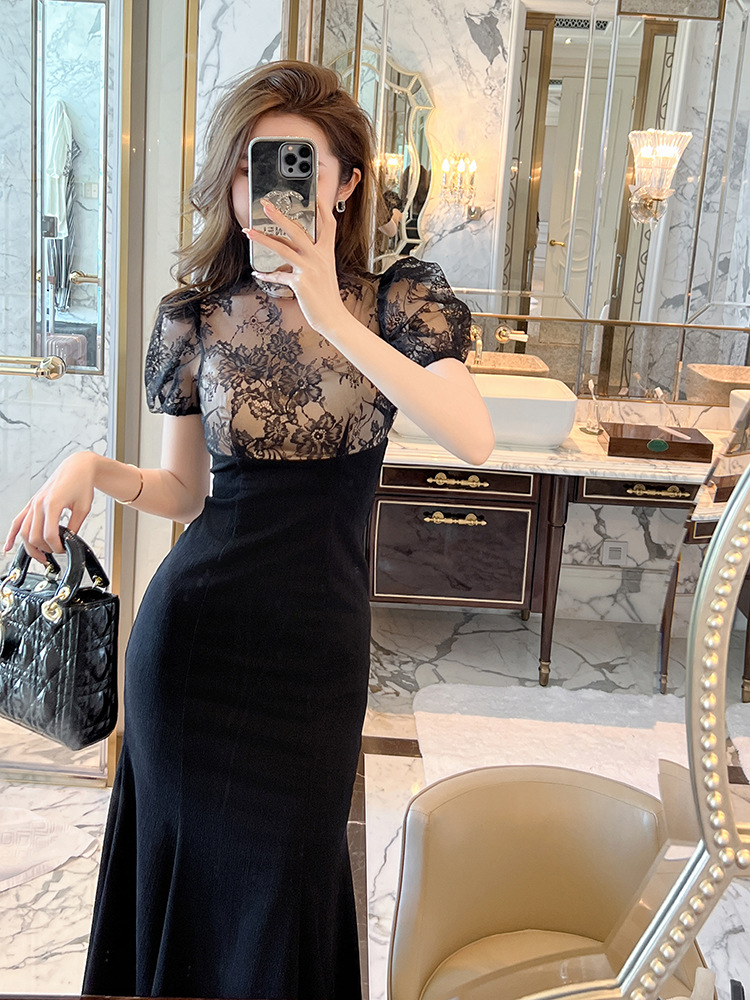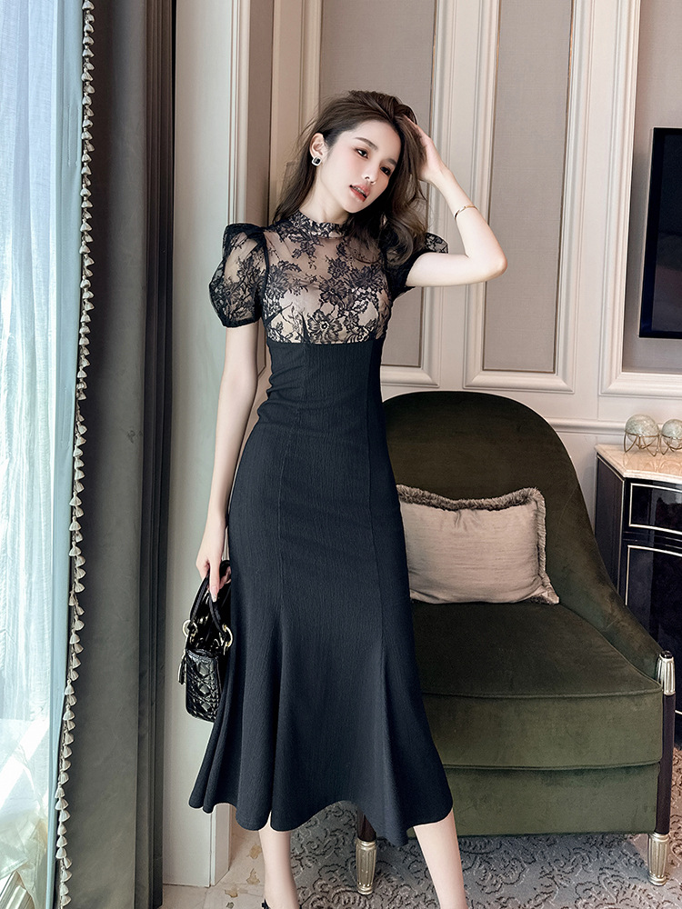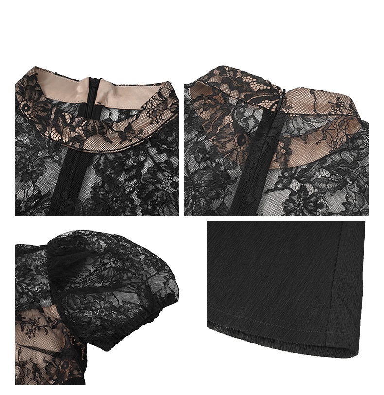透け感のあるレーストップスと落ち着いた黒のスカートの組み合わせが大人の女性らしさを演出します。