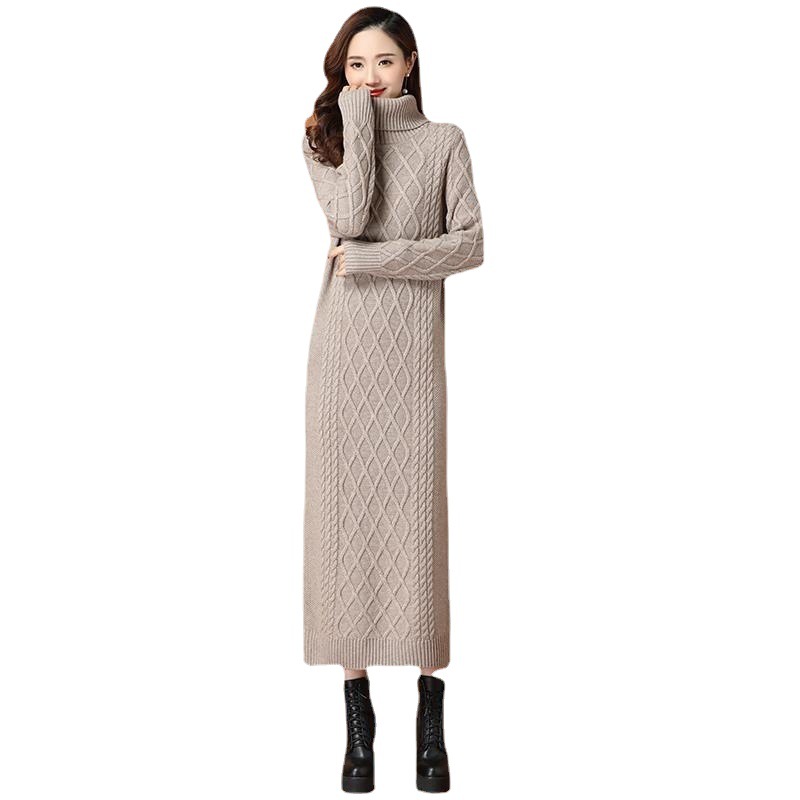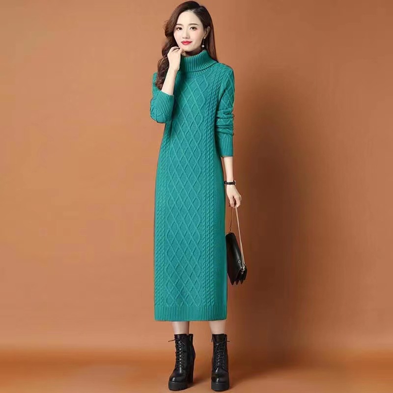 上品な菱形編み柄が美しい厚手ニットのロングワンピースです。