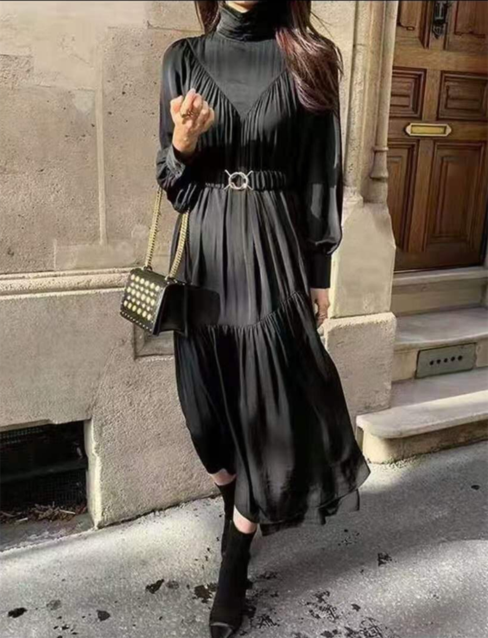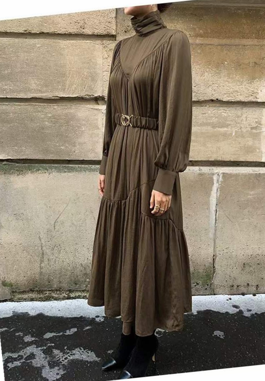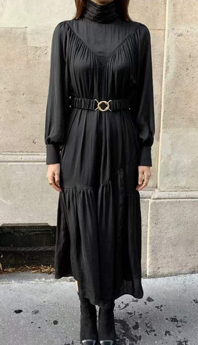 エレガントなタートルネックデザインが魅力的なロングワンピース。