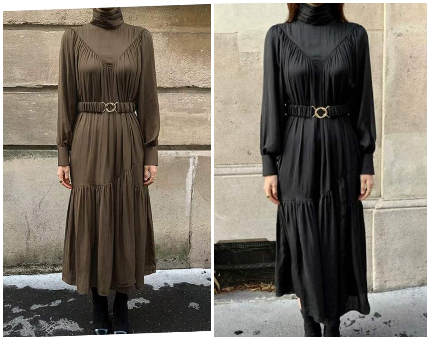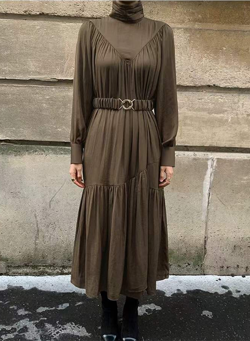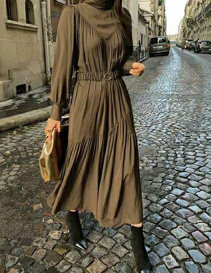 エレガントなタートルネックデザインが魅力的なロングワンピース。
