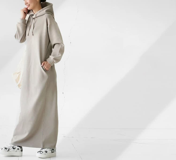上品な気質を演出する今季マストバイアイテム。 柔らかなスウェット素材で作られたロングワンピースは、 ゆったりとしたシルエットで着心地抜群。 フード付きデザインがカジュアルながらも洗練された印象を与えます。 一枚でスタイルが決まる万能アイテムです。