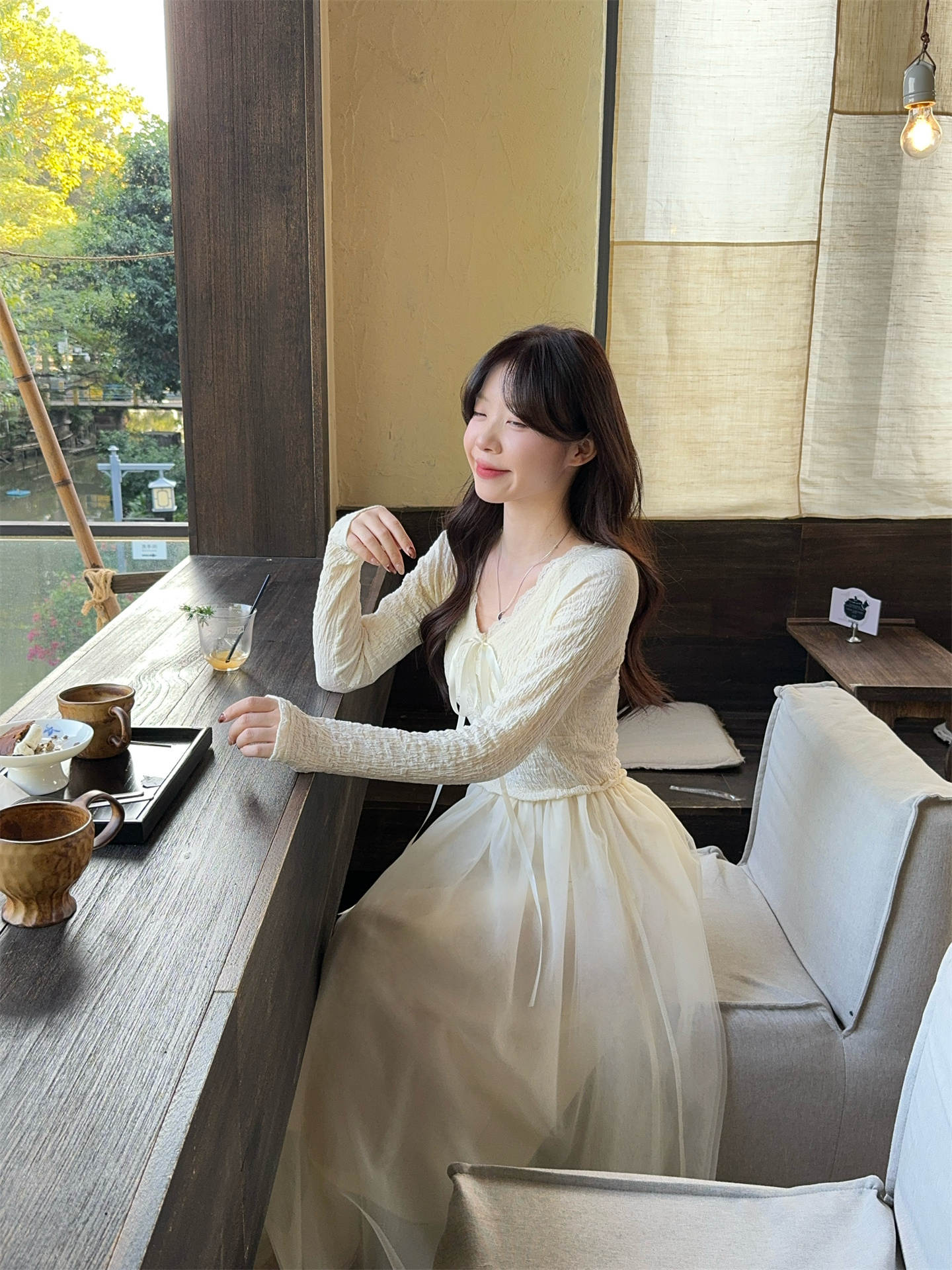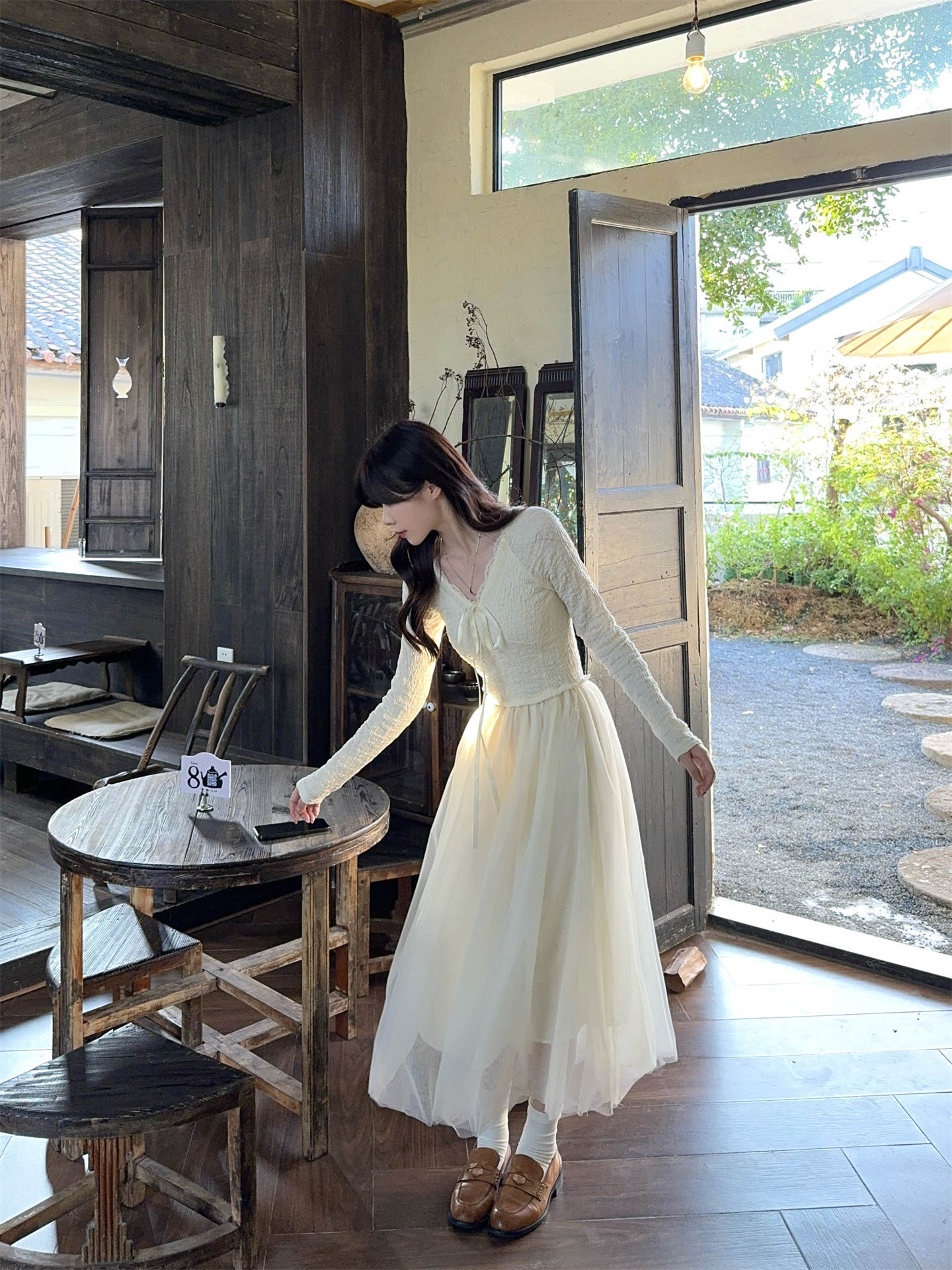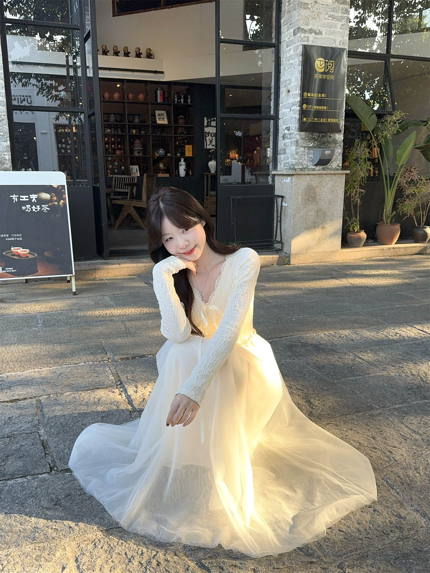 上半身はニット素材のVネックトップス、下半身はふんわりとしたチュールスカートの