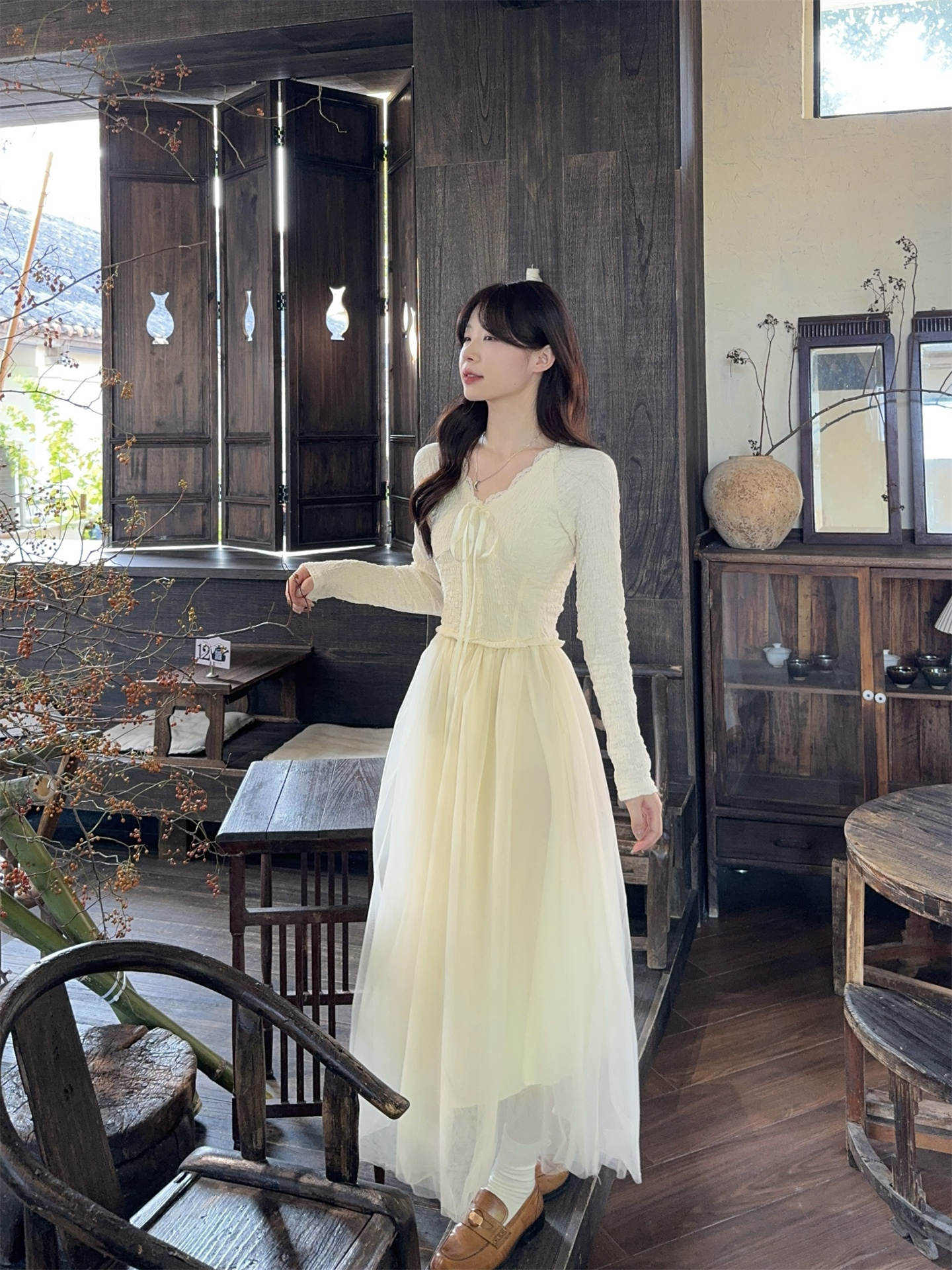 フレンチスタイルの気品あふれるレースロングワンピース。 上半身はニット素材のVネックトップス、下半身はふんわりとしたチュールスカートの フェイクツーピース仕様で、おしゃれな重ね着風デザインが魅力的です。 今季マストバイアイテムで、上質な素材感が大人の女性らしさを演出します。