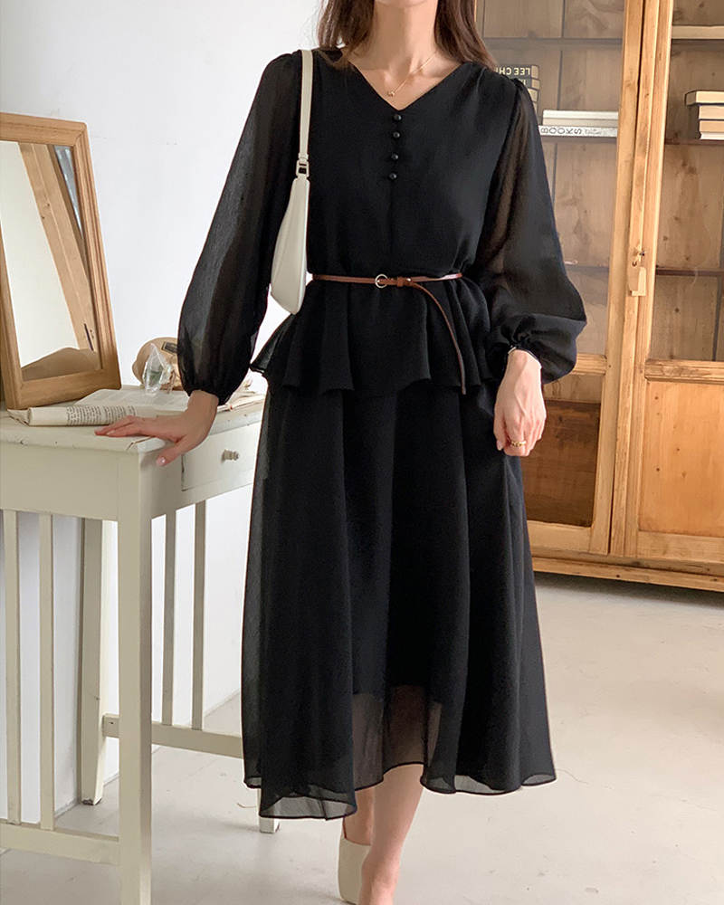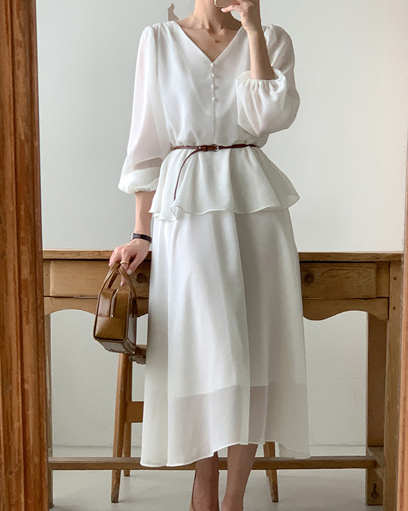 美しいブイネックラインと細身ベルトでウエストマークし、女性らしいシルエットを演出。