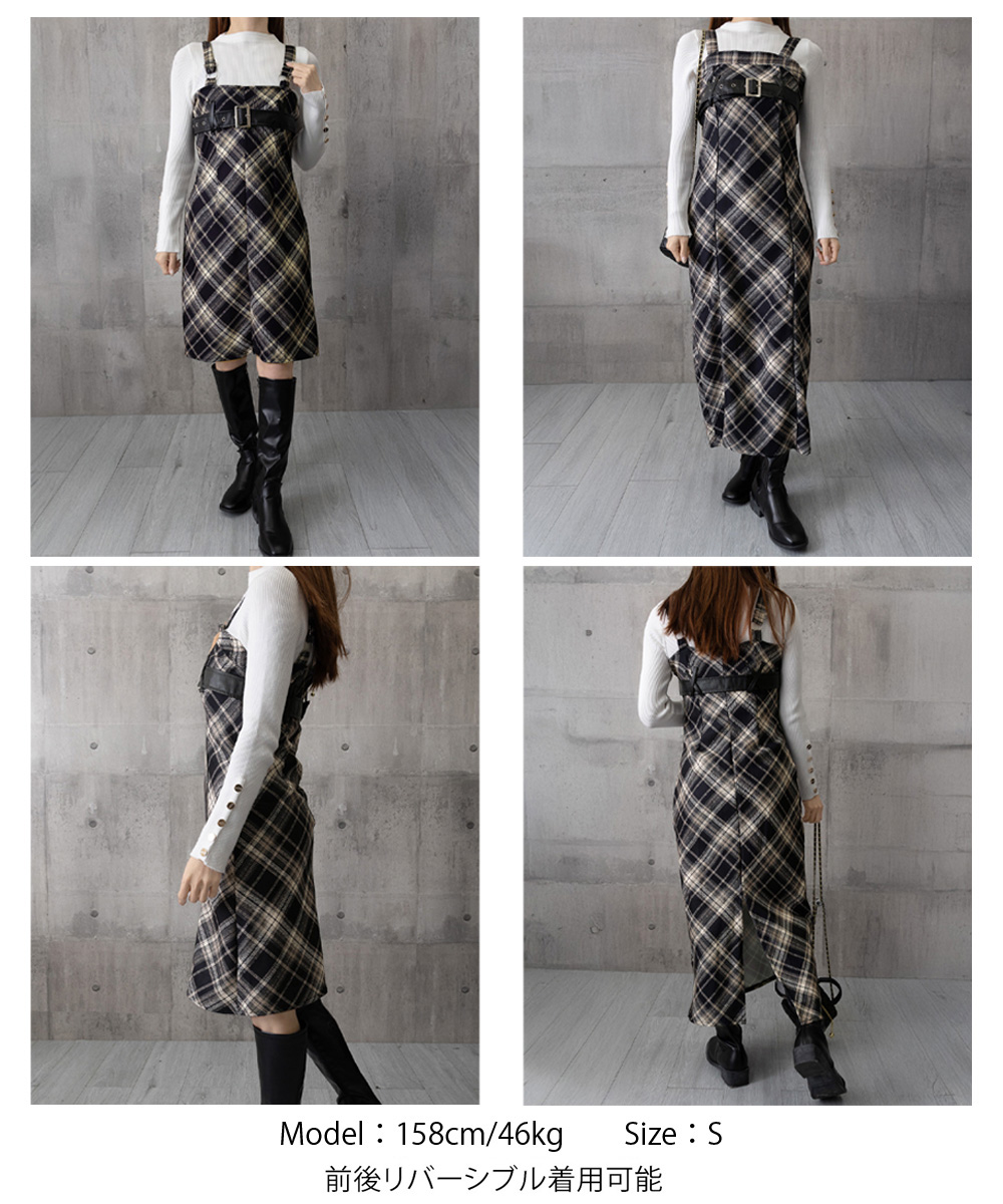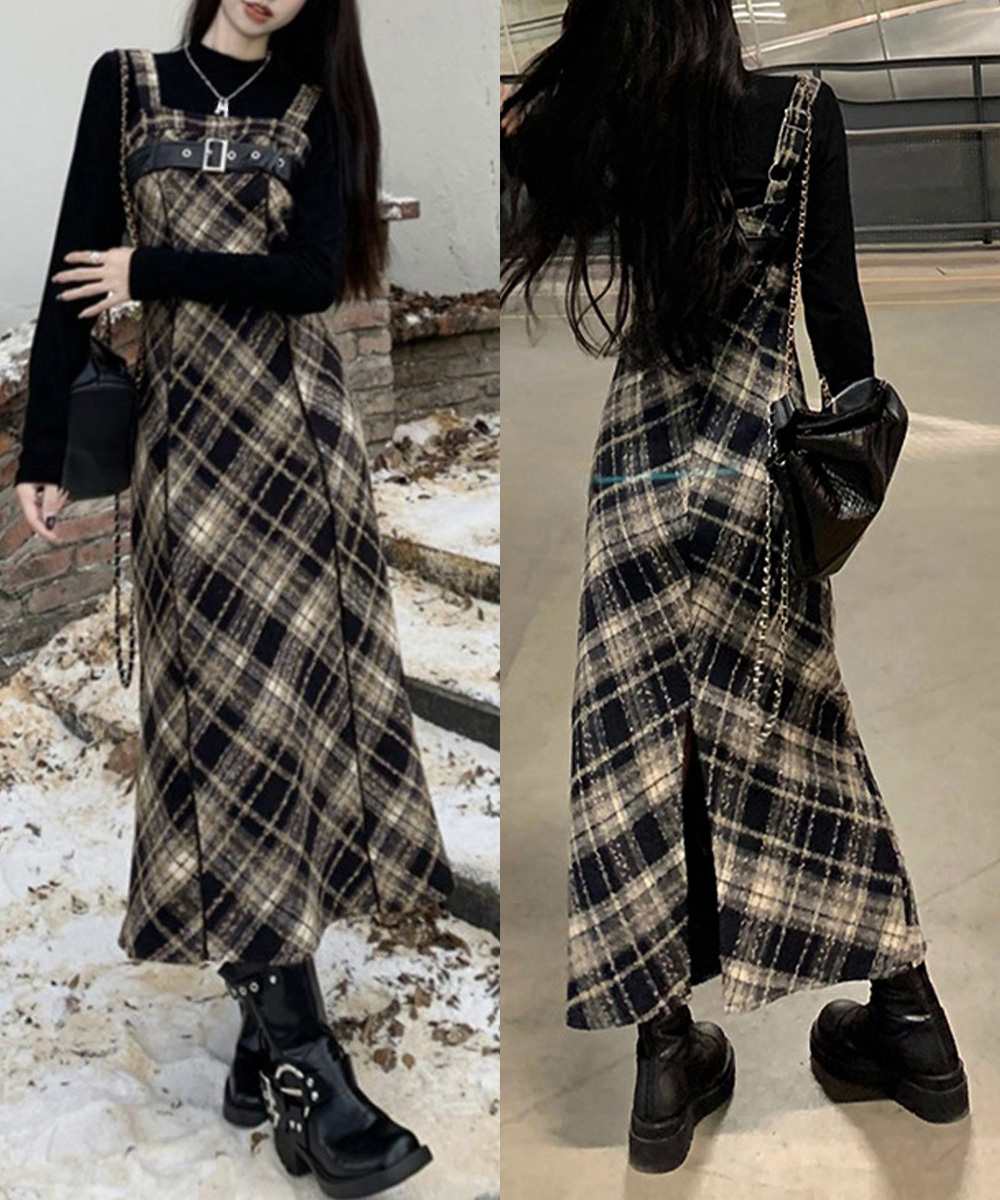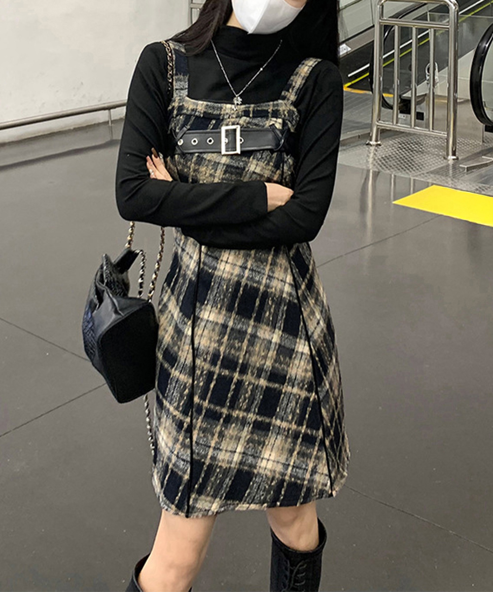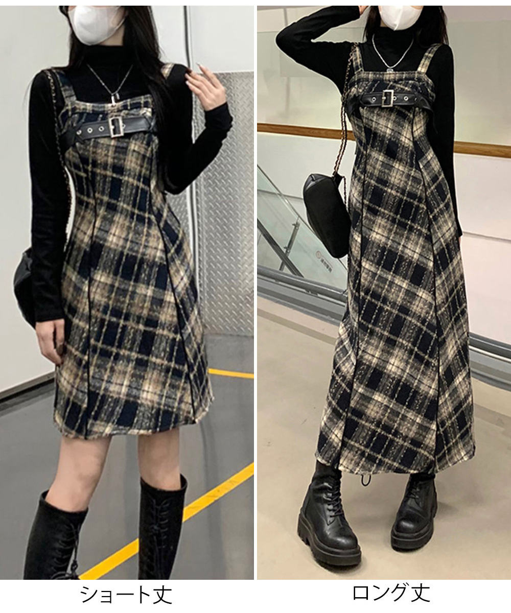 チェック柄が印象的なフレアサスペンダーワンピースで、春秋冬のレイヤードコーデにぴったり。 胸元のベルトがアクセントとなり、ストリート感溢れる個性的なスタイルを演出します。 ショート丈とロング丈の2タイプから選べるロングワンピースで、お好みのシルエットでコーディネート可能。 タートルネックと重ね着すれば季節感のあるレイヤードスタイルが完成し、韓国風モードコーデにも最適です。