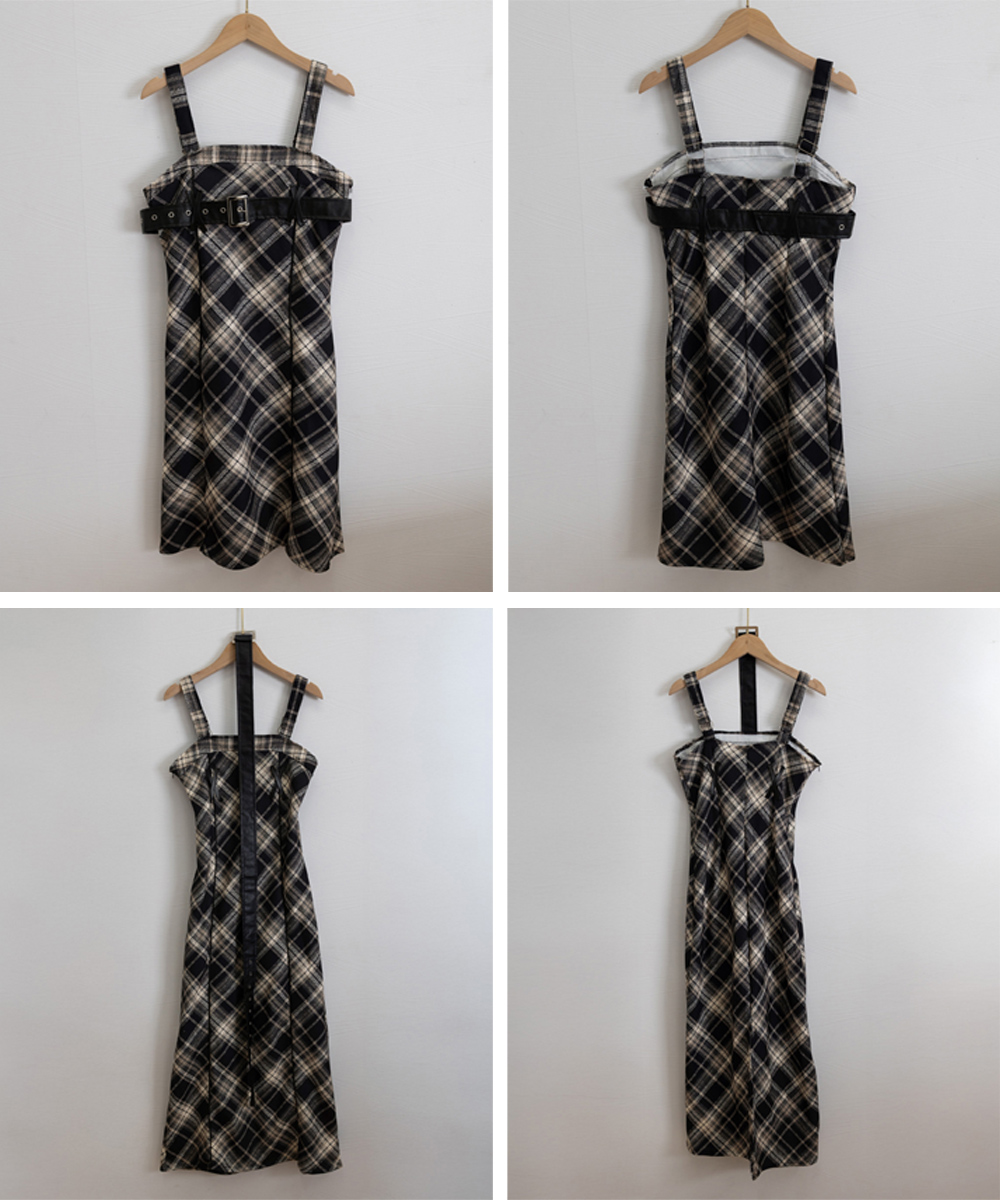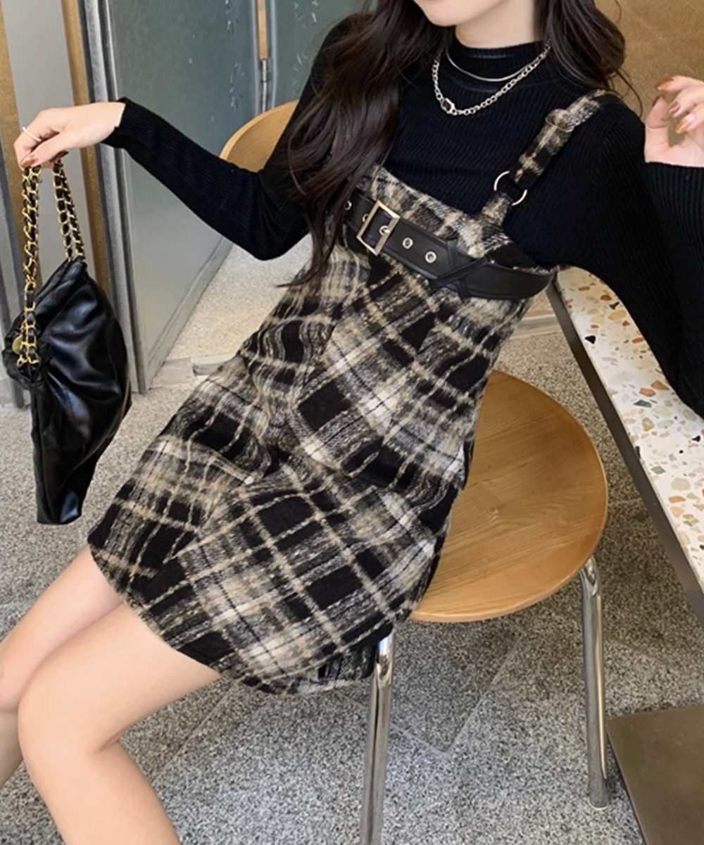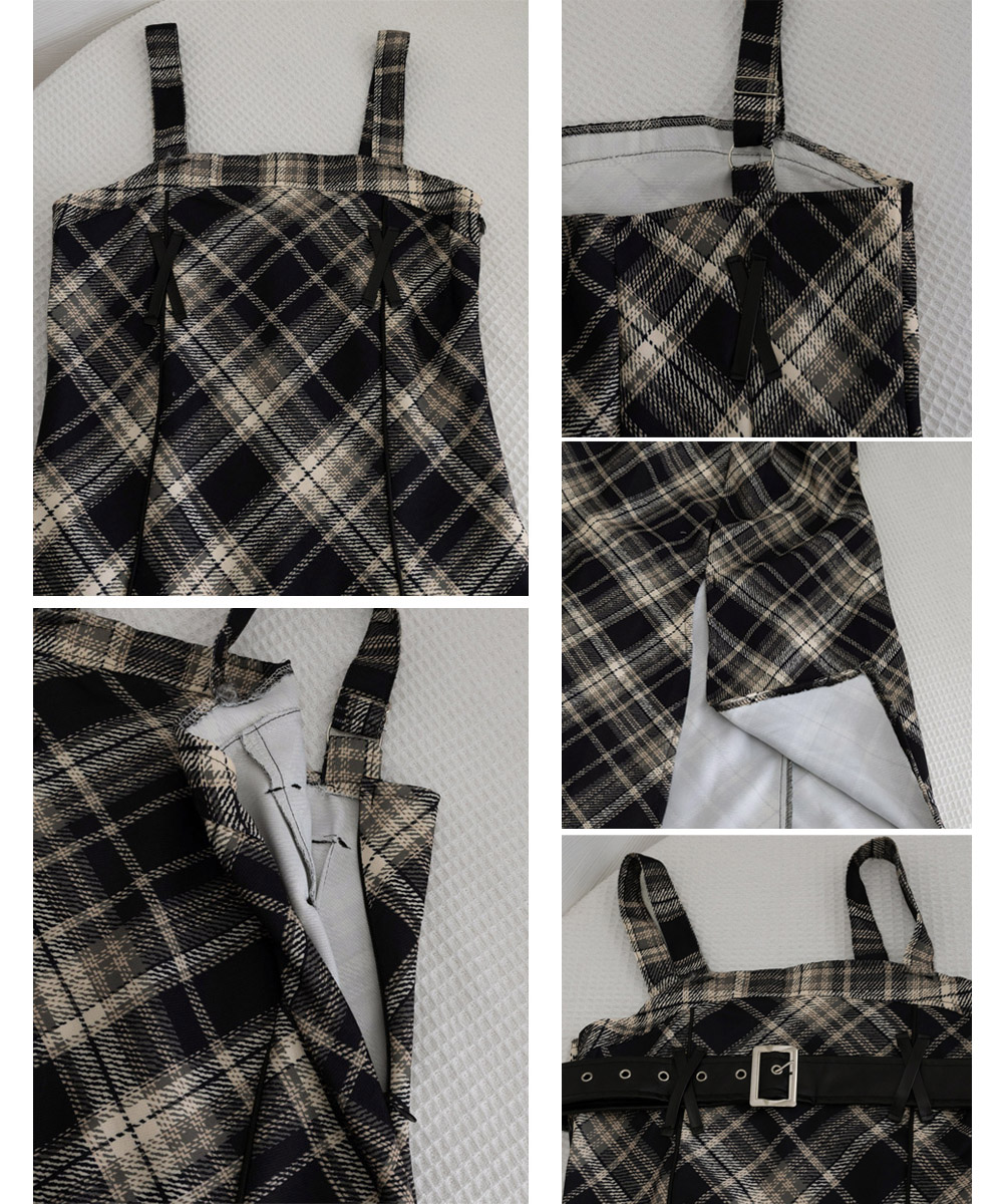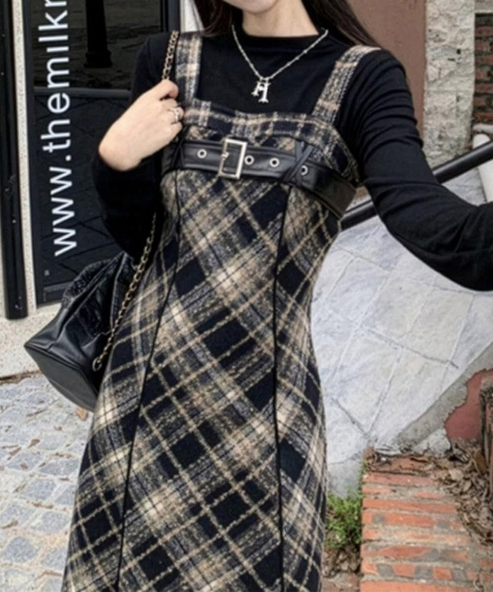 チェック柄が印象的なフレアサスペンダーワンピースで、春秋冬のレイヤードコーデにぴったり。 胸元のベルトがアクセントとなり、ストリート感溢れる個性的なスタイルを演出します。 ショート丈とロング丈の2タイプから選べるロングワンピースで、お好みのシルエットでコーディネート可能。 タートルネックと重ね着すれば季節感のあるレイヤードスタイルが完成し、韓国風モードコーデにも最適です。