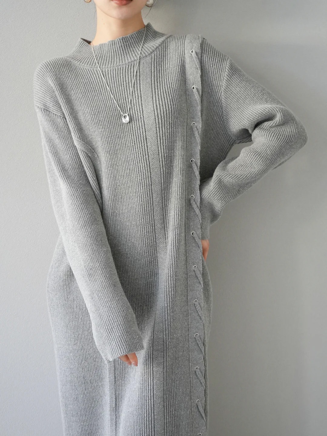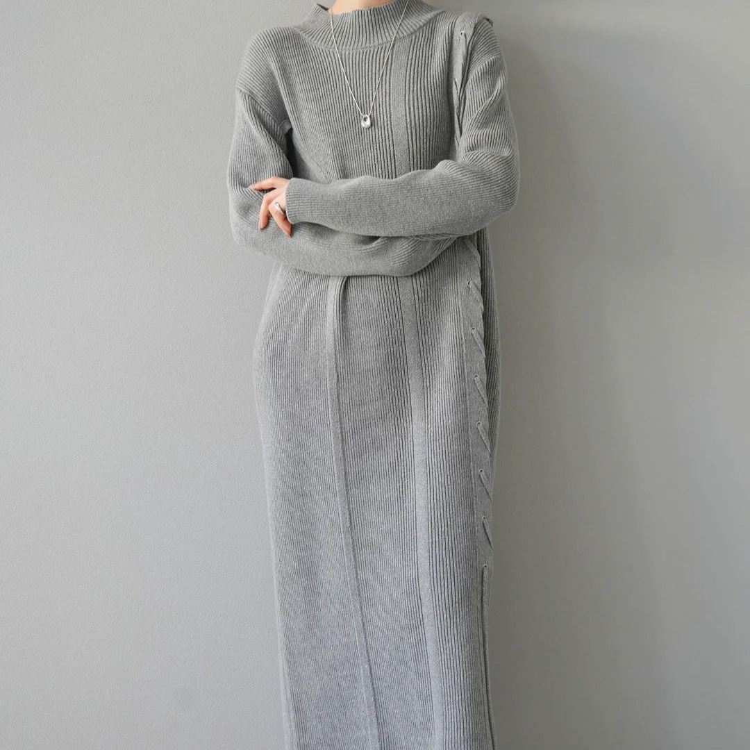上品な韓国風デザインのリブニットロングワンピースです。