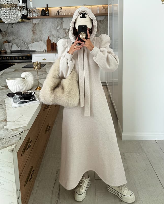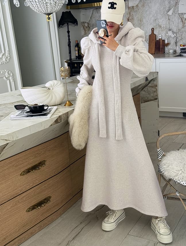 今季注目の上品なスウェット素材を使用したロングワンピース。 柔らかな着心地とゆったりとしたシルエットで、一日中快適に過ごせます。 フード付きでカジュアルながらも洗練された印象を演出。 様々なシーンで活躍する万能アイテムです。