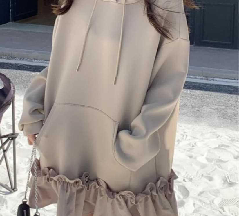 裾に施された可愛らしいフリルがおしゃれなアクセントになり、カジュアルながらも女性らしさを表現。