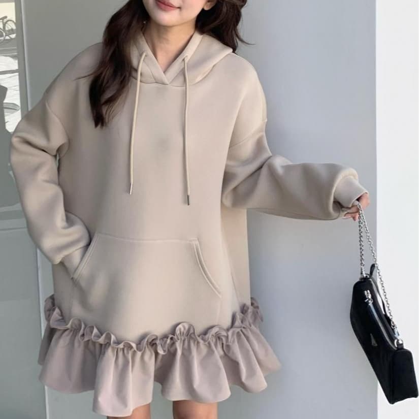 上品な気質を演出する今季注目のスウェットロングワンピース。 裾に施された可愛らしいフリルがおしゃれなアクセントになり、カジュアルながらも女性らしさを表現。 ゆったりとした着心地で普段使いからお出かけまで幅広く活用できる一枚です。