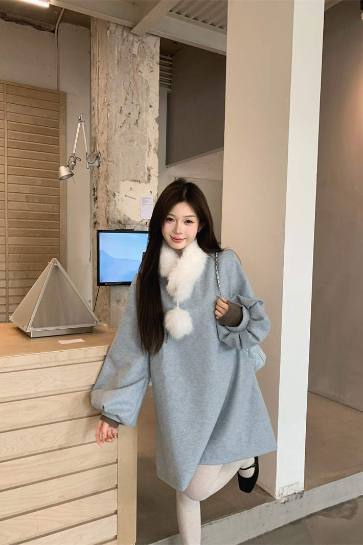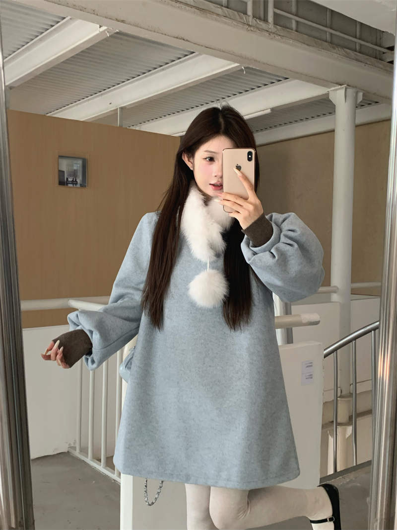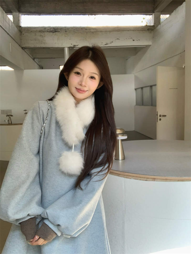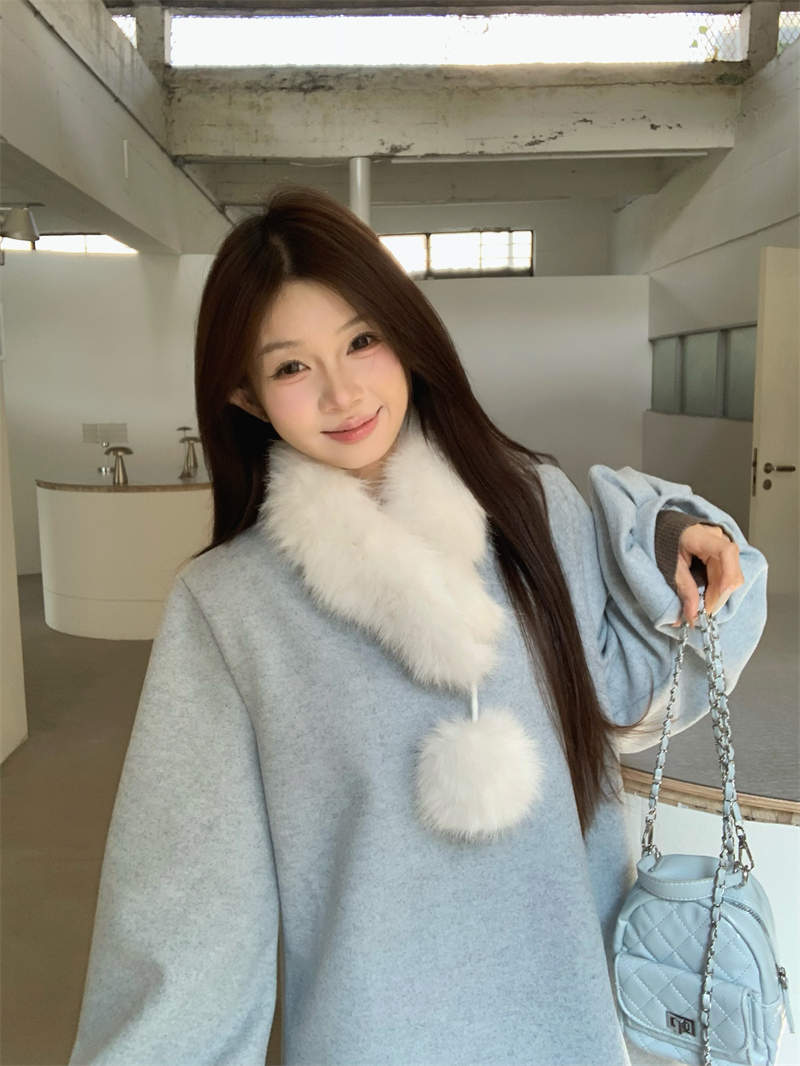 優しいブルーカラーと上品な毛玉マフラーがセットになった甘めスタイル。
