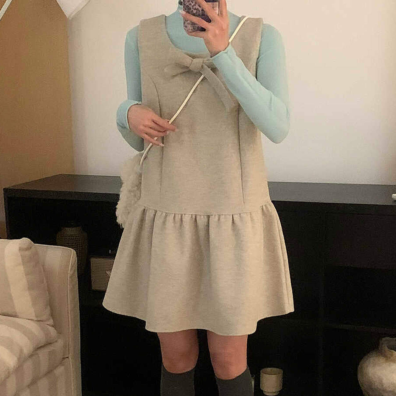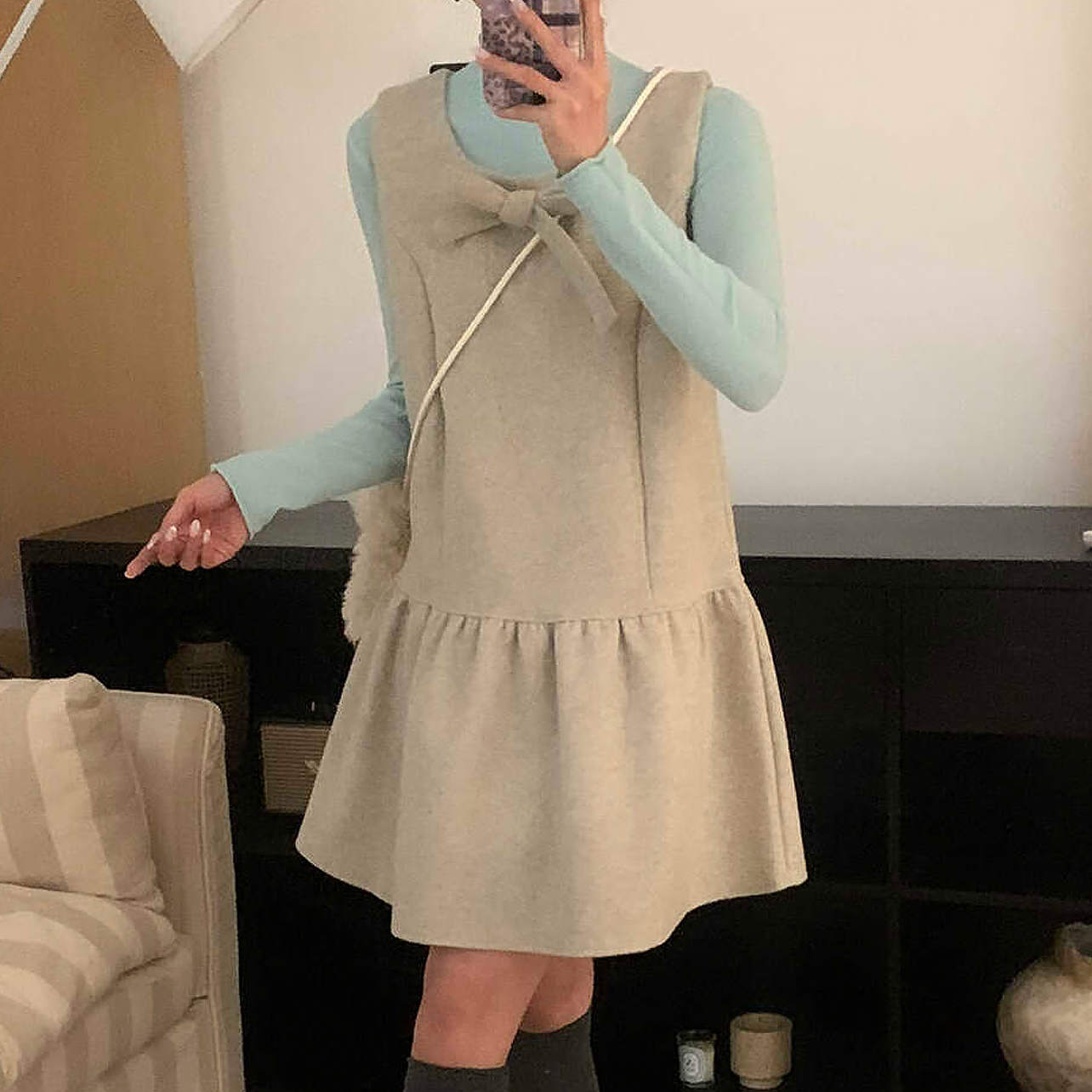 ゆったりとしたニットトップスと可愛いリボンデザインのロングワンピースの組み合わせで、