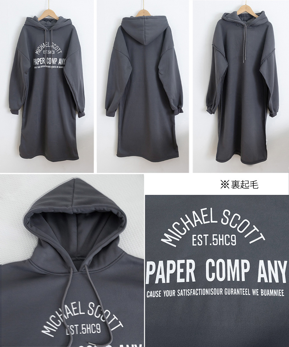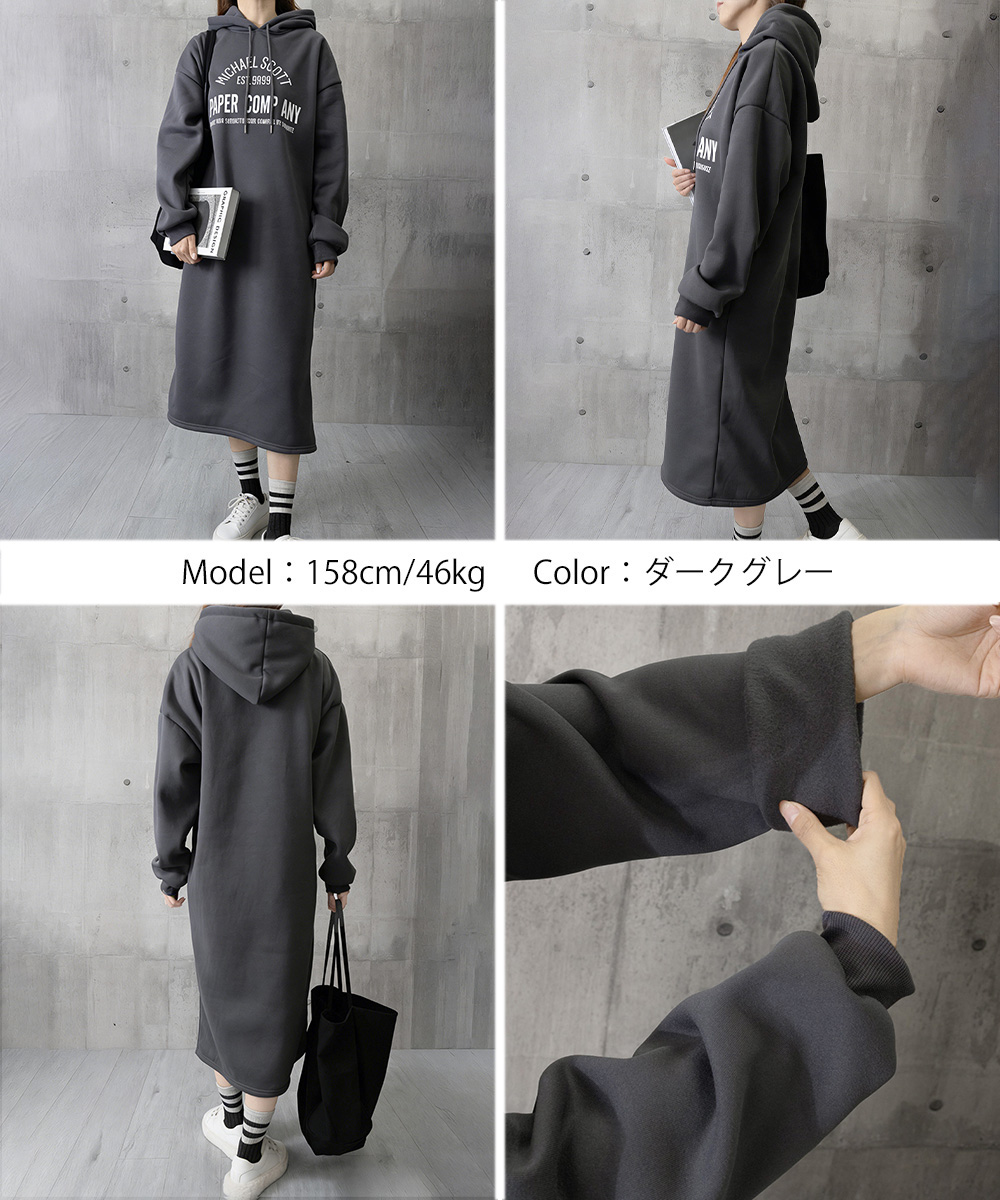 体型カバー ロゴプリント ゆるパーカーワンピース オーバーサイズ 厚手ワンピ 大人カジュアル ゆったりワンピース 着やせ 暖かいワンピ 無地 トレーナーワンピ秋 フードワンピース冬 フロントにロゴプリントが入ったオーバーサイズのスウェットワンピース。 裏地が起毛仕様になっているので、暖かく秋冬シーズンに最適な一着。 ゆったりとしたシルエットで体型カバーもでき、リラックス感のある着心地を実現。 キャップやミニショルダーバッグ、ブーツを合わせてストリートカジュアルなスタイリングが楽しめる。 素材:ポリエステル65%+綿35% カラー:ブラック/ダークグレー/ライトグレー サイズ:ワンサイズ 総丈:約110cm 肩幅:約62cm 袖丈:約52cm ゆき:約83cm 身幅:約57cm 胸囲:約114-124cm 裏地:なし(裏起毛) 伸縮性:ややあり 透け感:なし