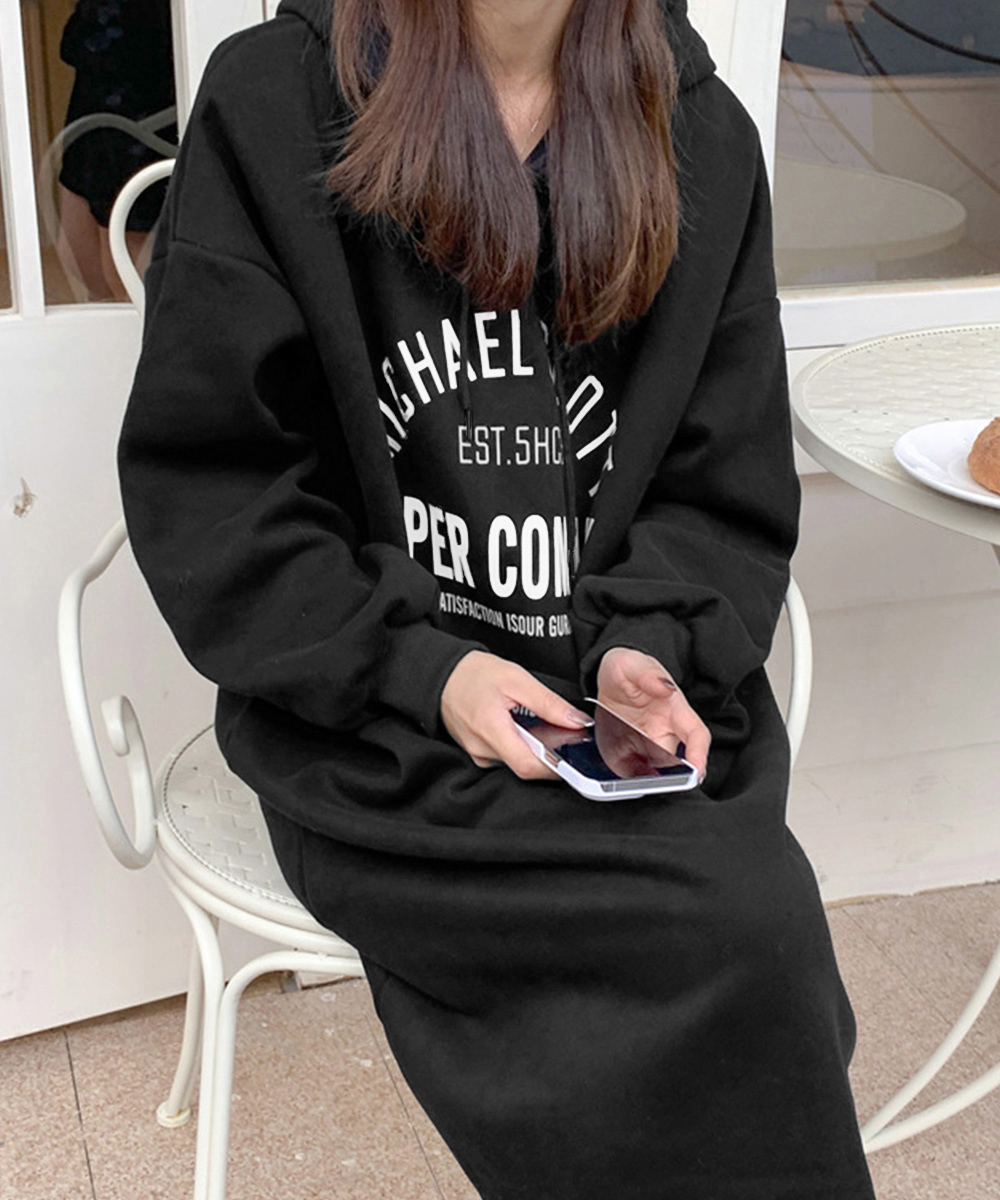 体型カバーに優れた文字印刷入りのスウェット素材ロングワンピース。