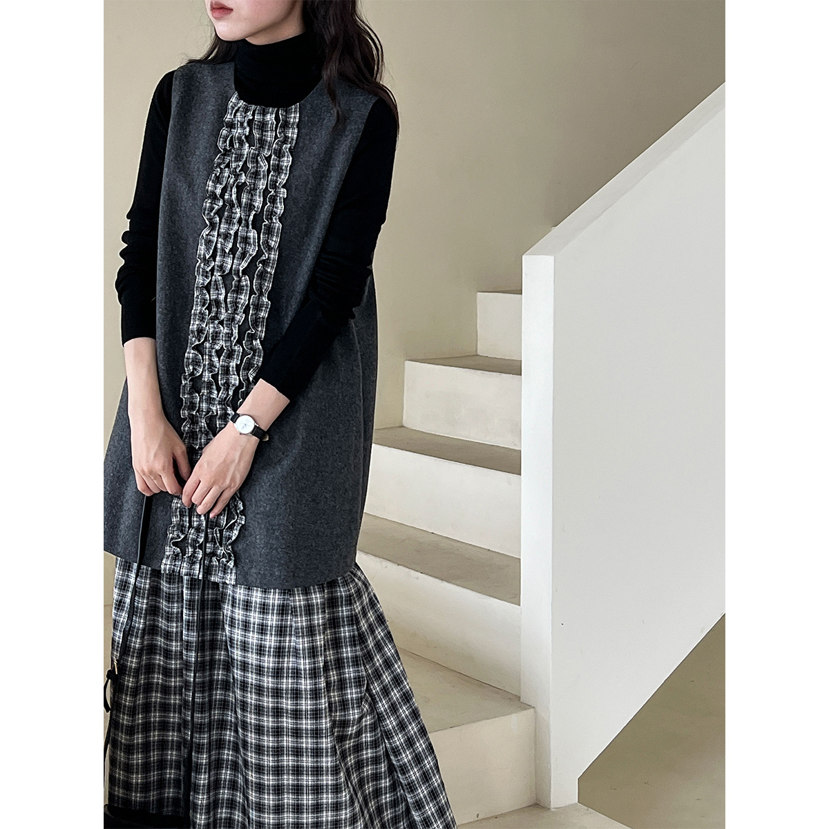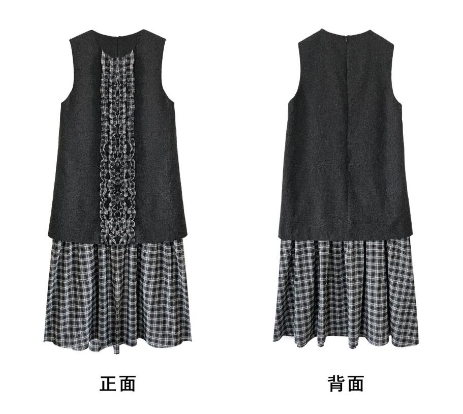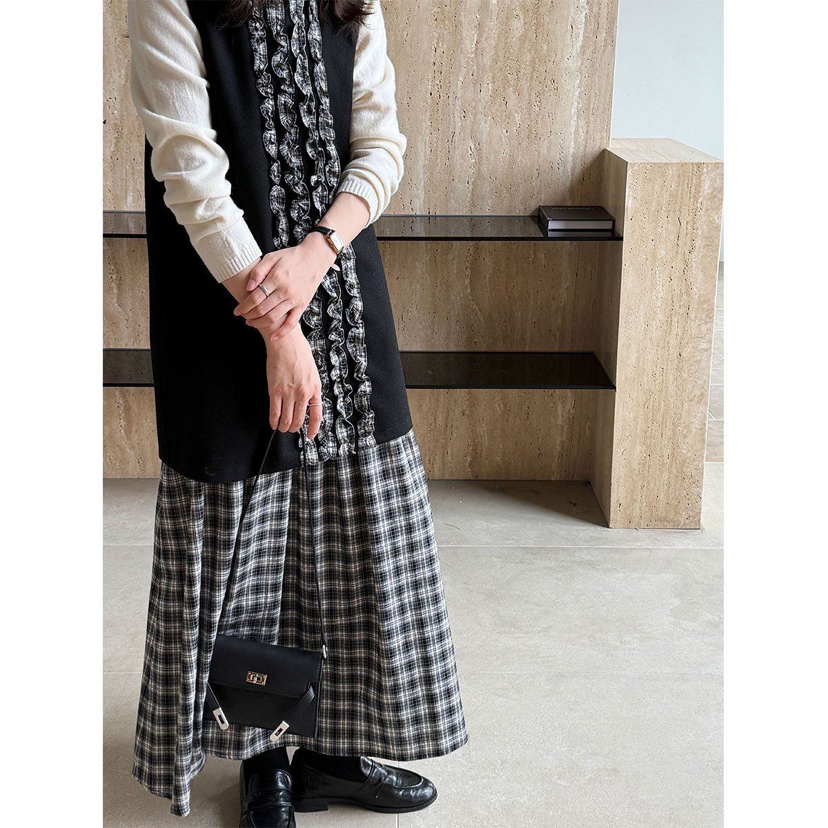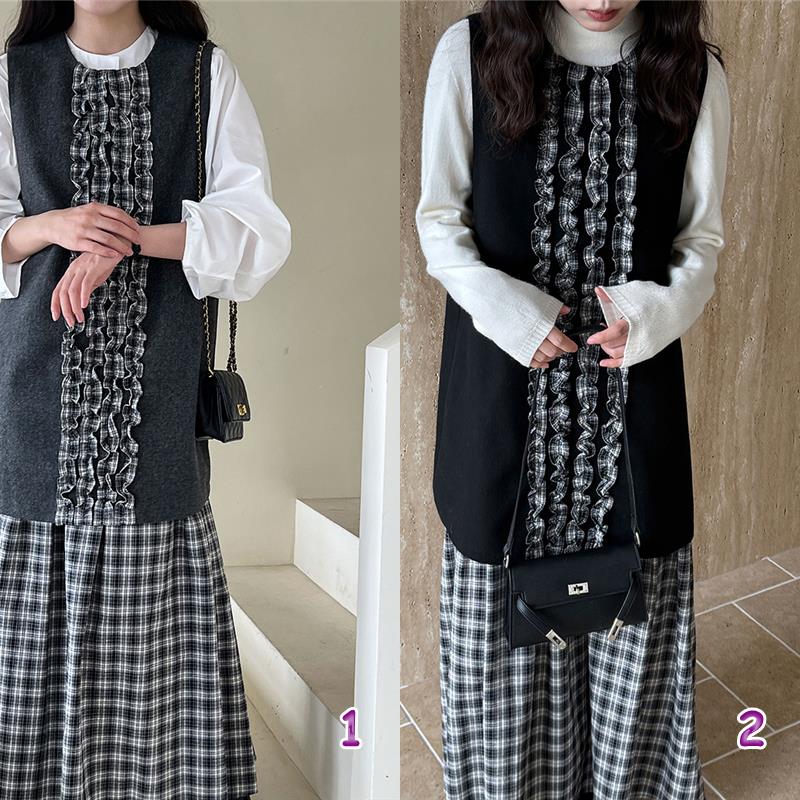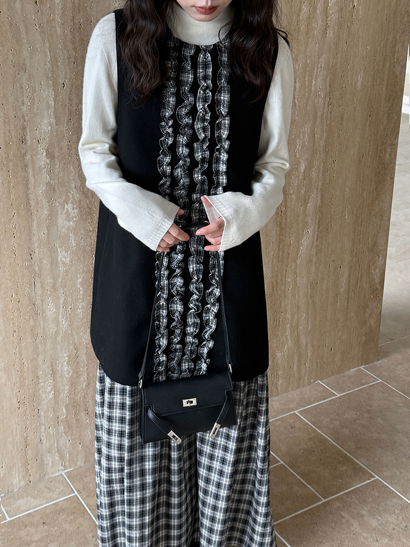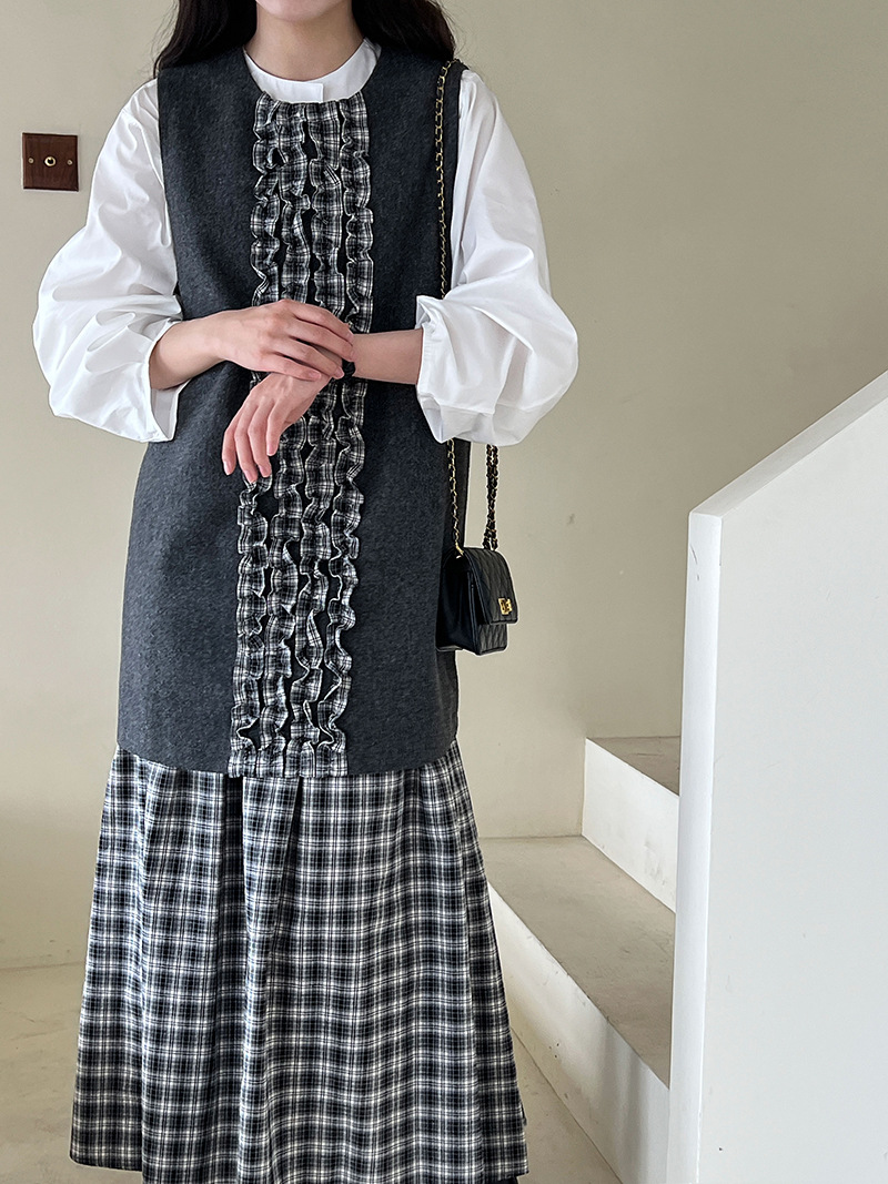 チェック柄のロングワンピースにフリル装飾が上品な印象を演出します。