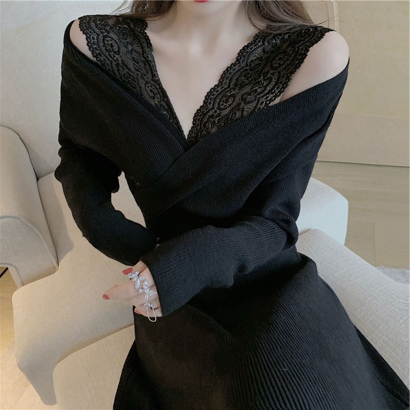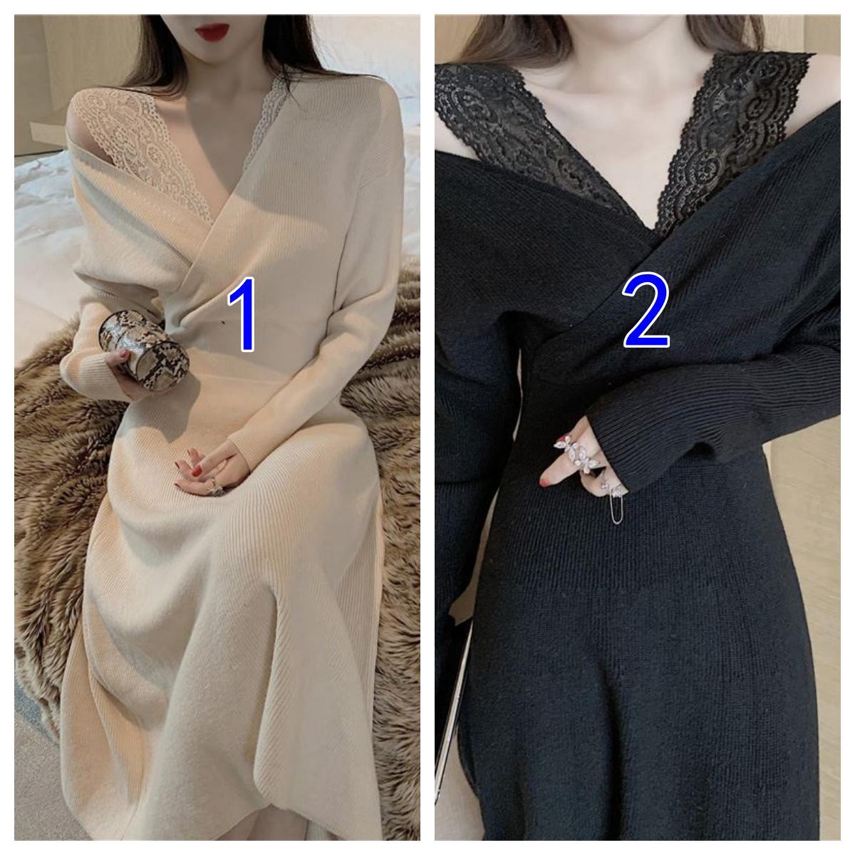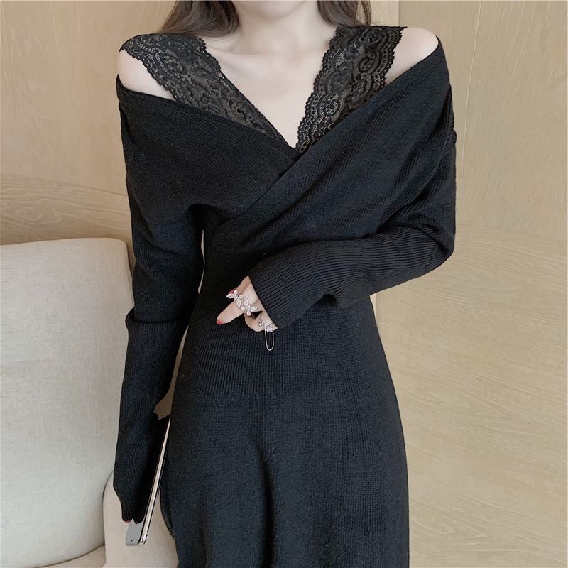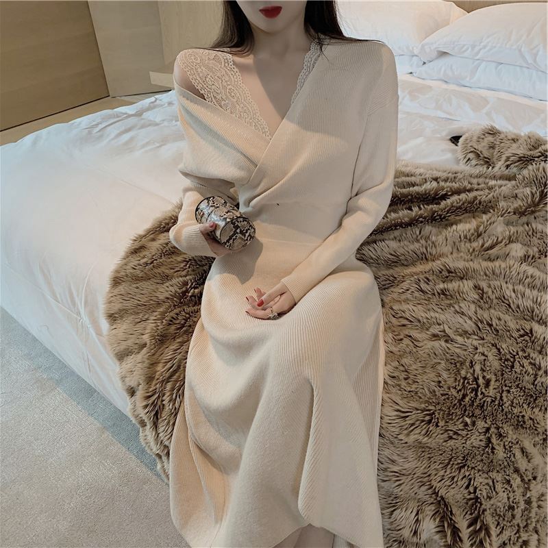 エレガントなレース襟が印象的なニット素材のロングワンピースです。