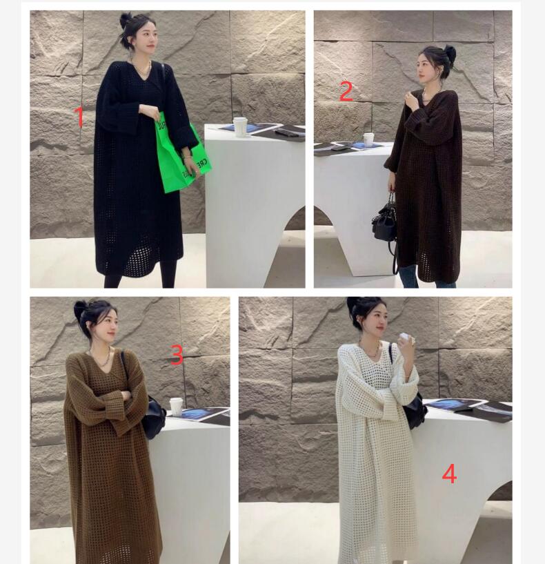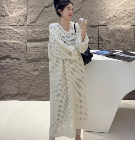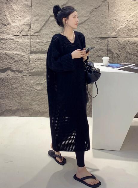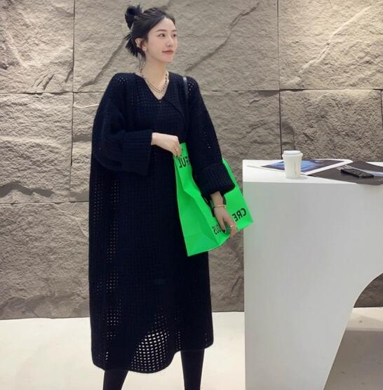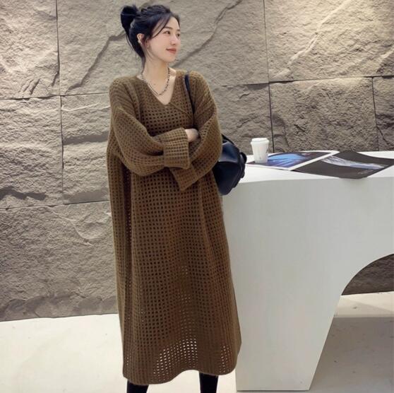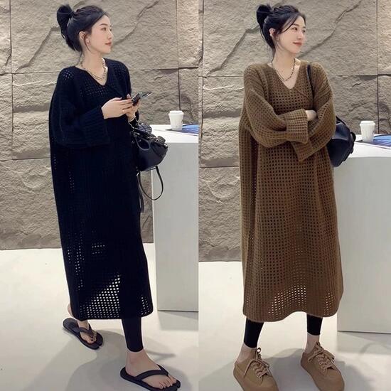 上品なブイネックデザインが魅力的なニット素材のロングワンピース。