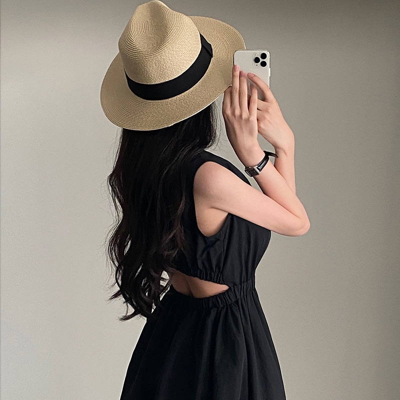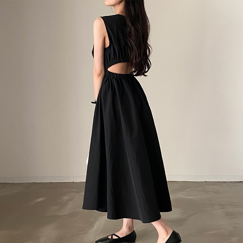 上品なブラックカラーとウエスト部分のカットアウトデザインが特徴的で、洗練された大人の魅力を演出します。
