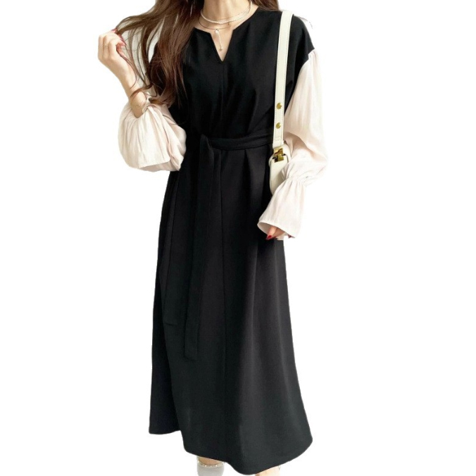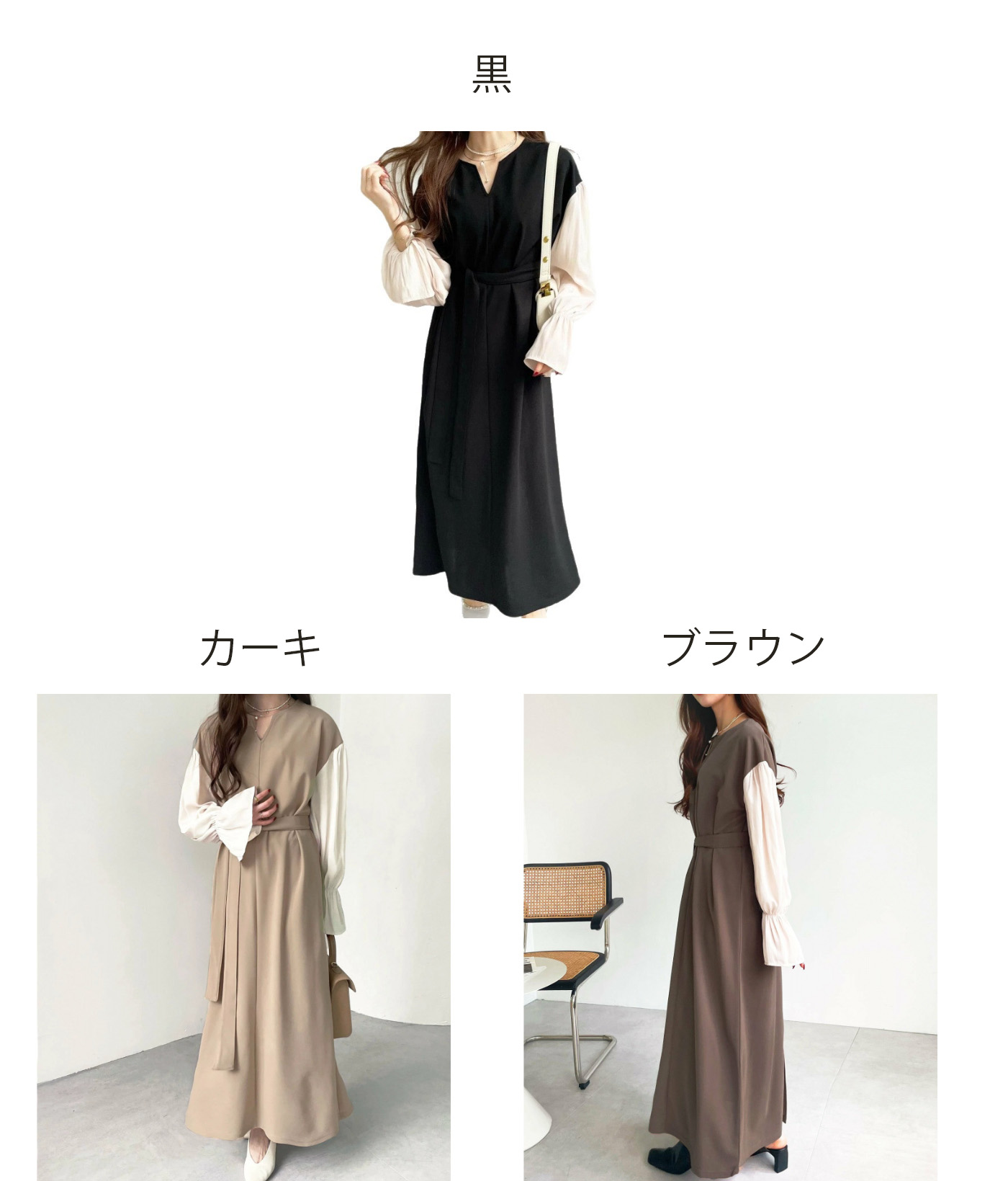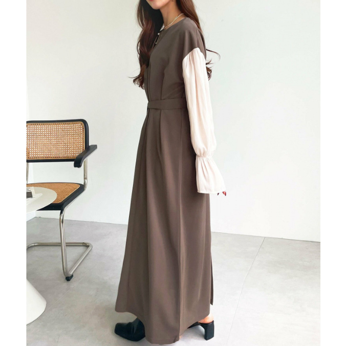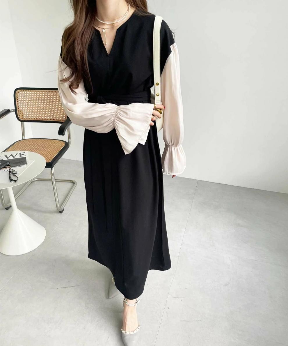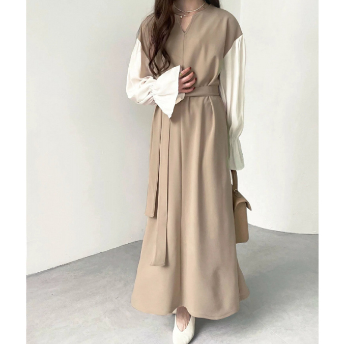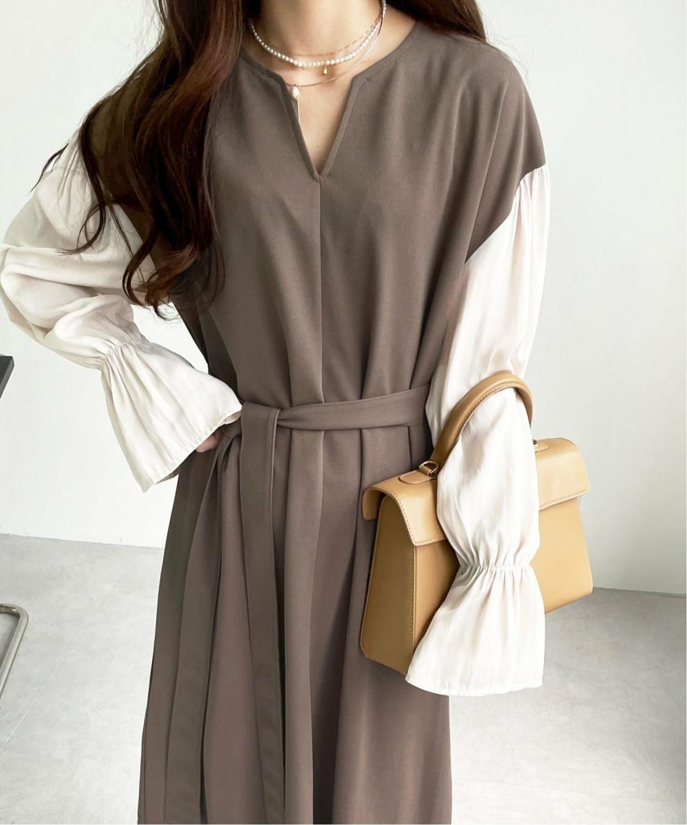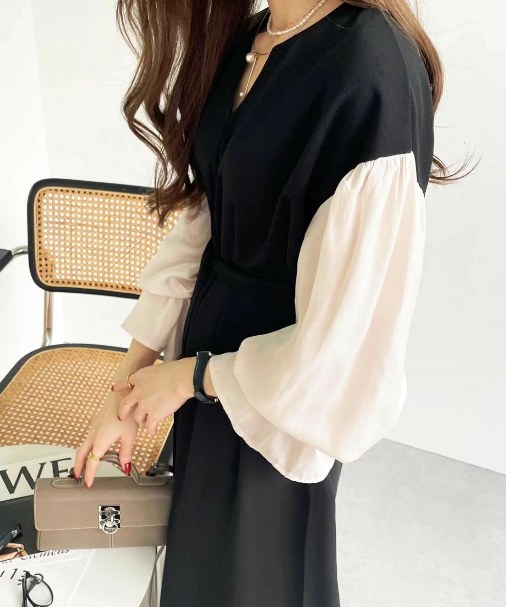 今季注目の異素材を組み合わせたフレア袖が印象的なロングワンピース。