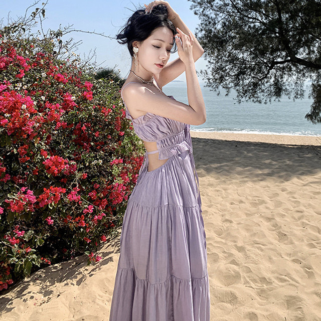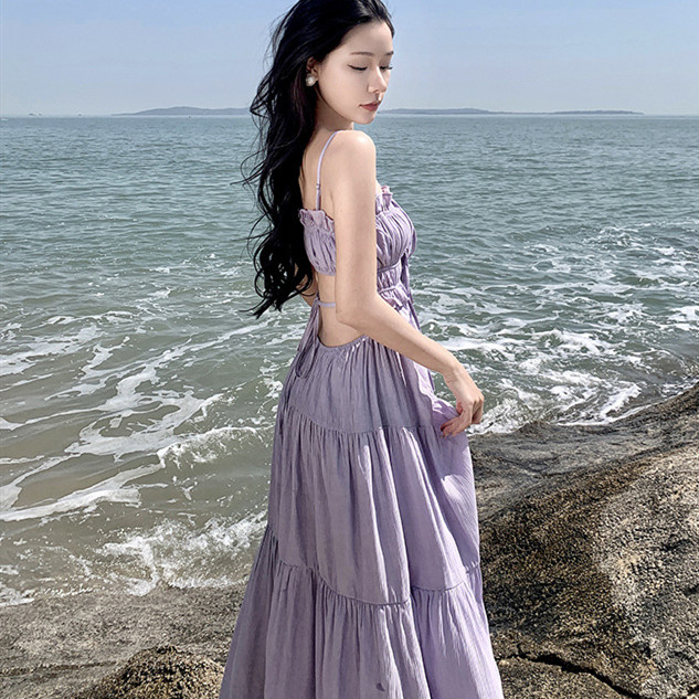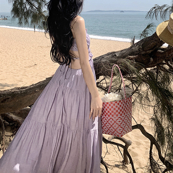 大人可愛い紫色のロングワンピースで、リゾートから結婚式まで幅広く活躍します。