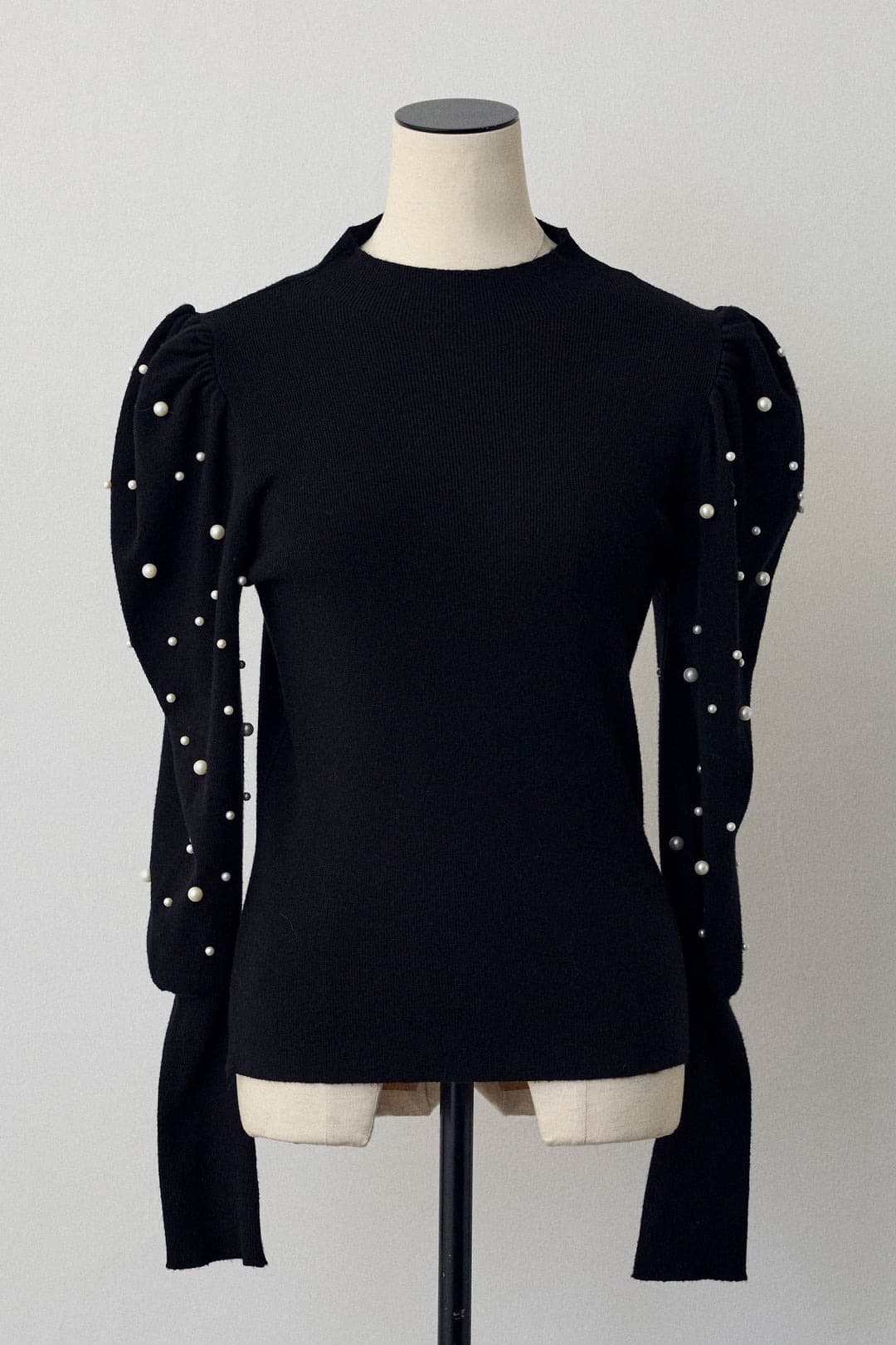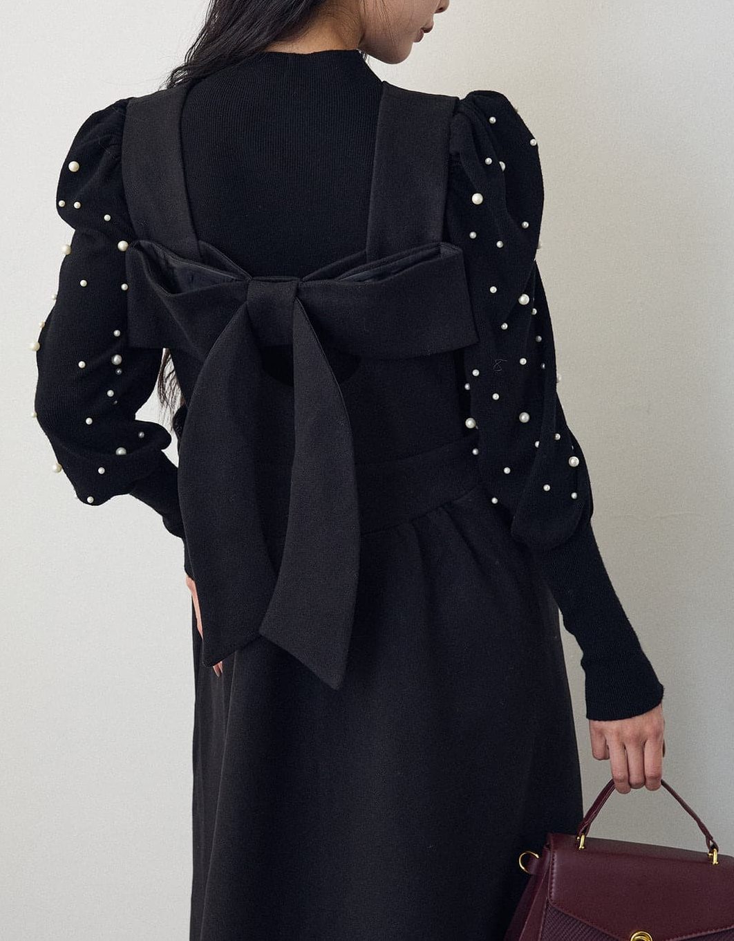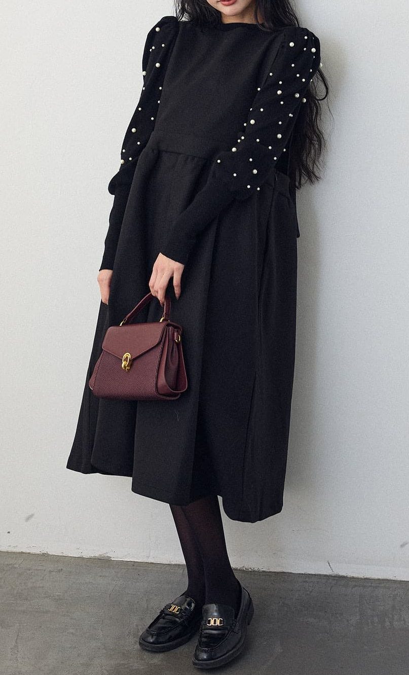 上品なパール装飾が美しいバルーン袖ニットと、エレガントなフレアシルエットのロングワンピースのセットアップ。