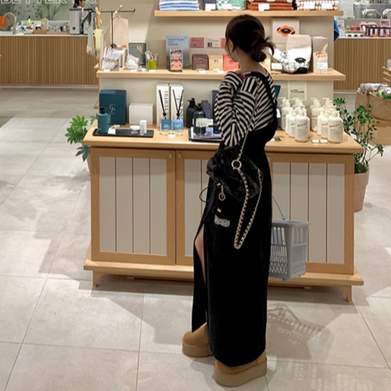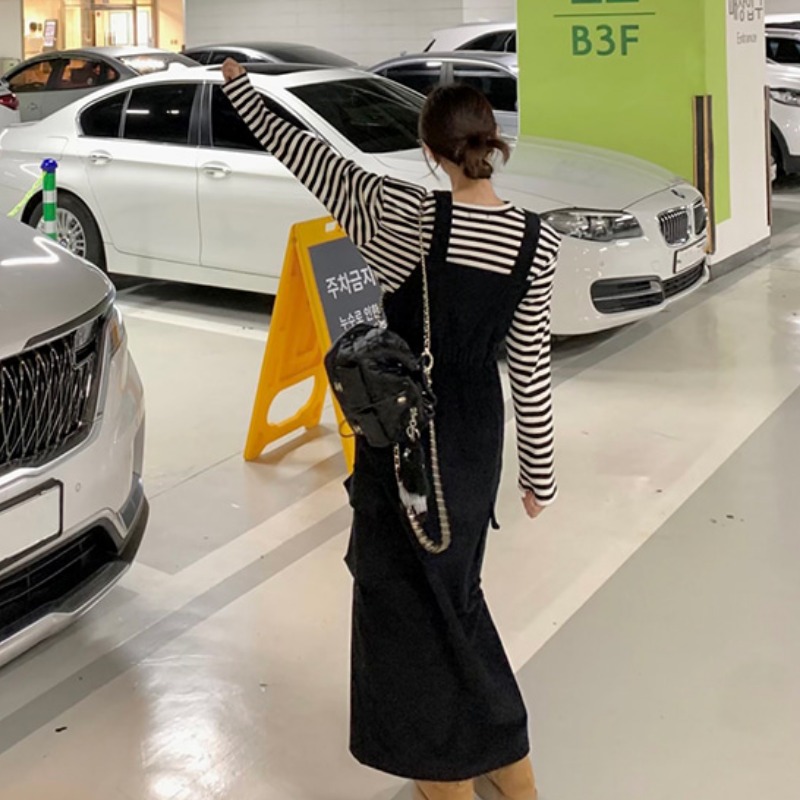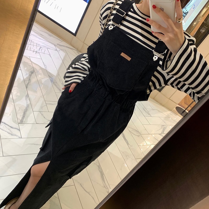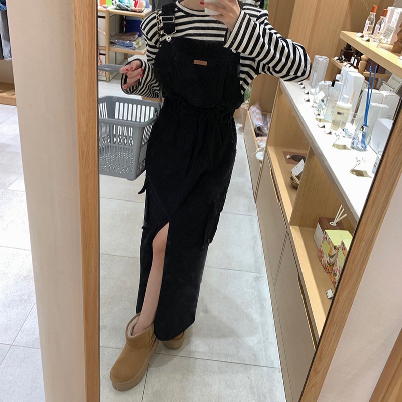 今季注目のデニム素材を使用したロングワンピース風ジャンパースカート。