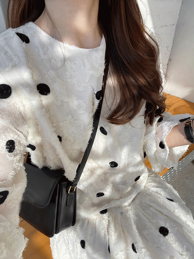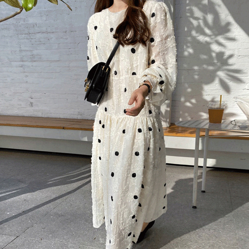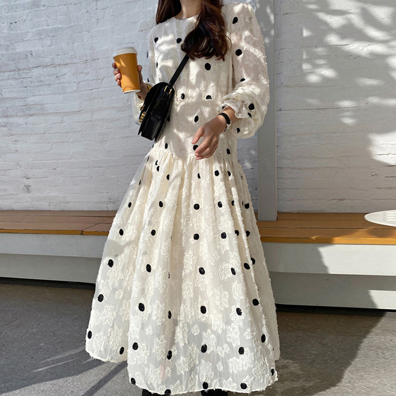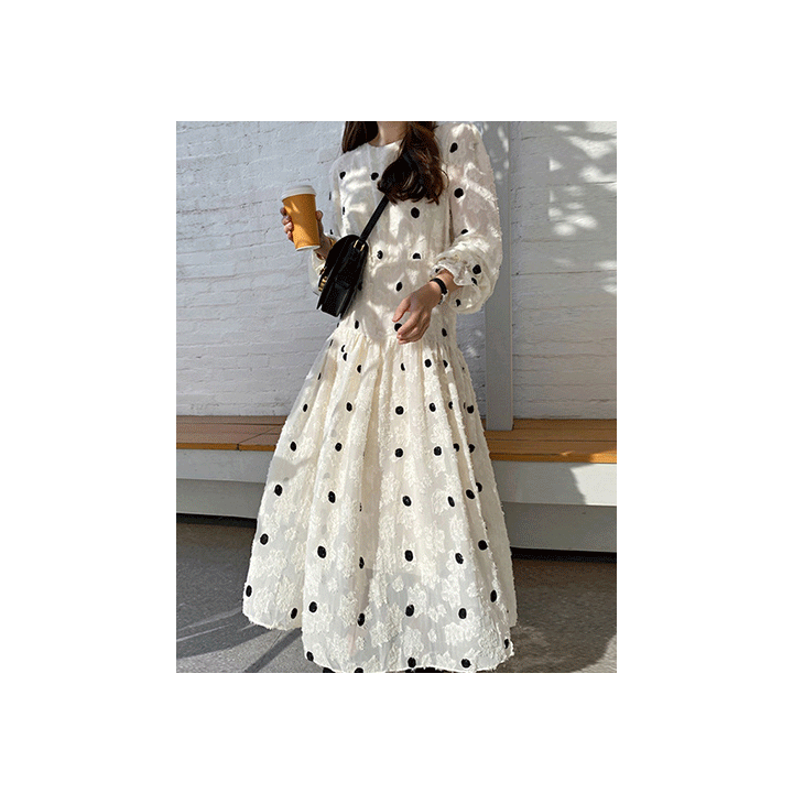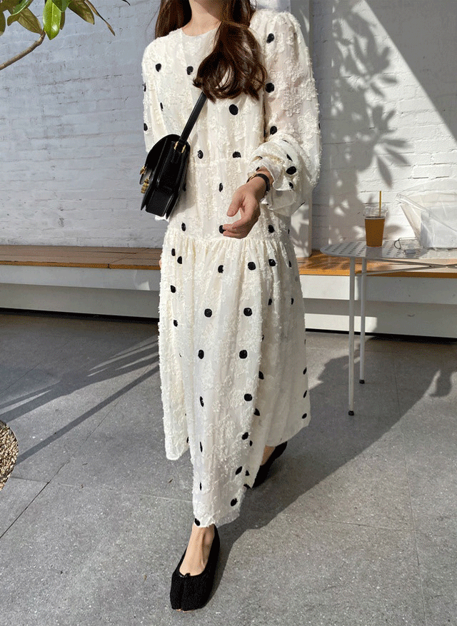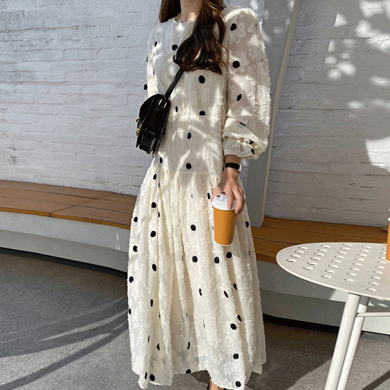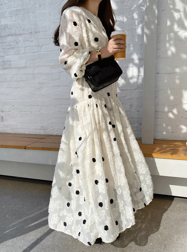 上品なドット柄とフレアシルエットで女性らしさを演出します。