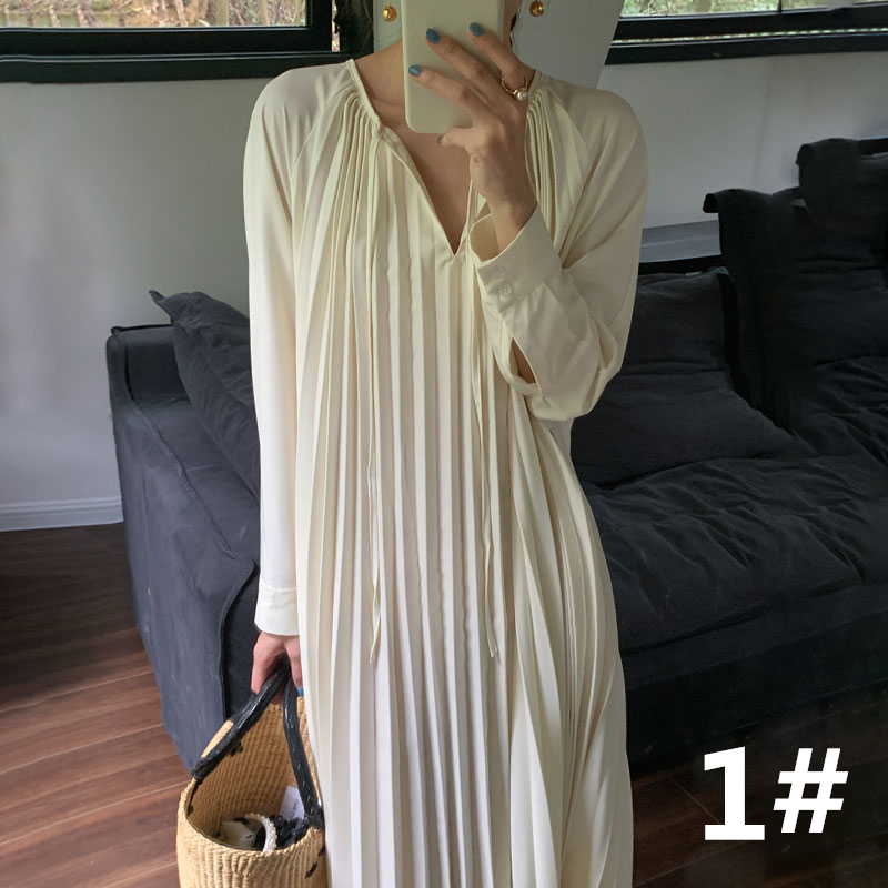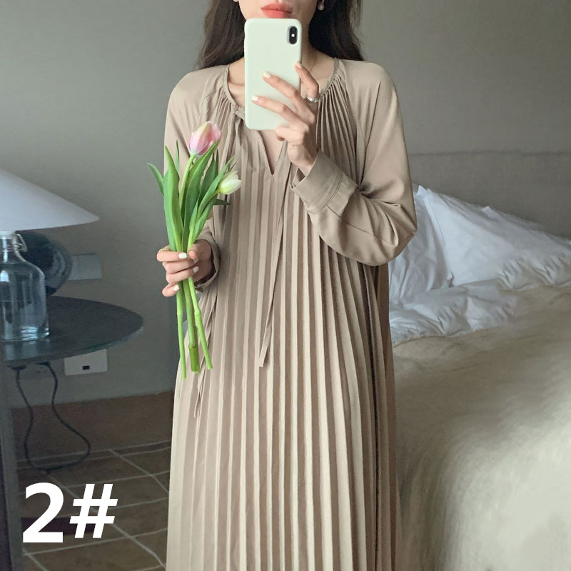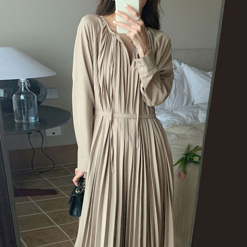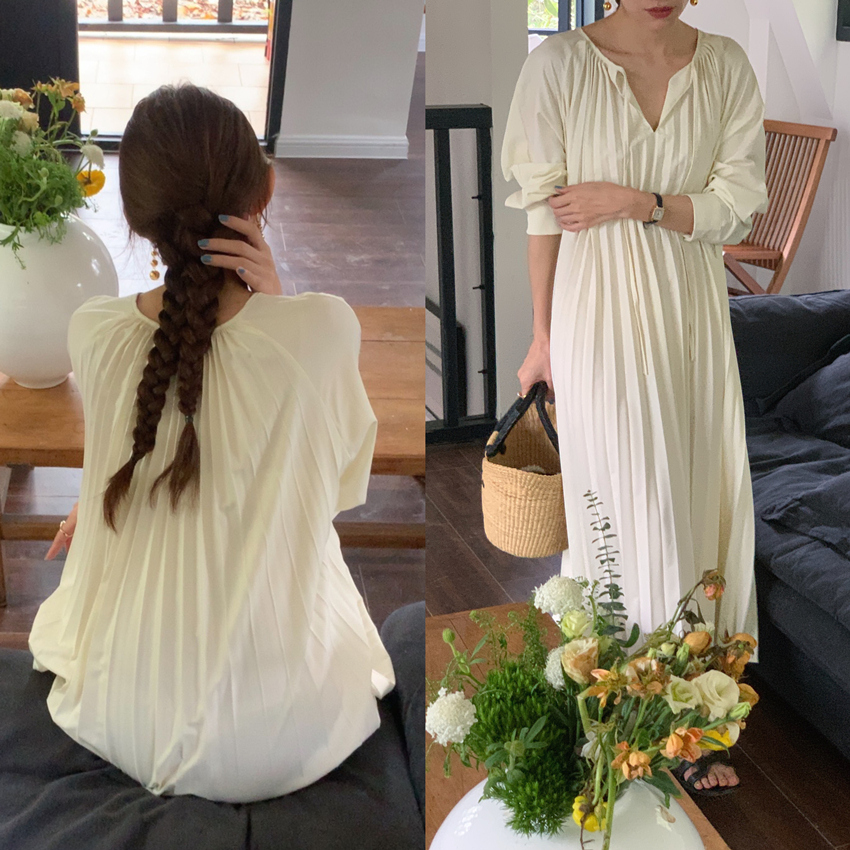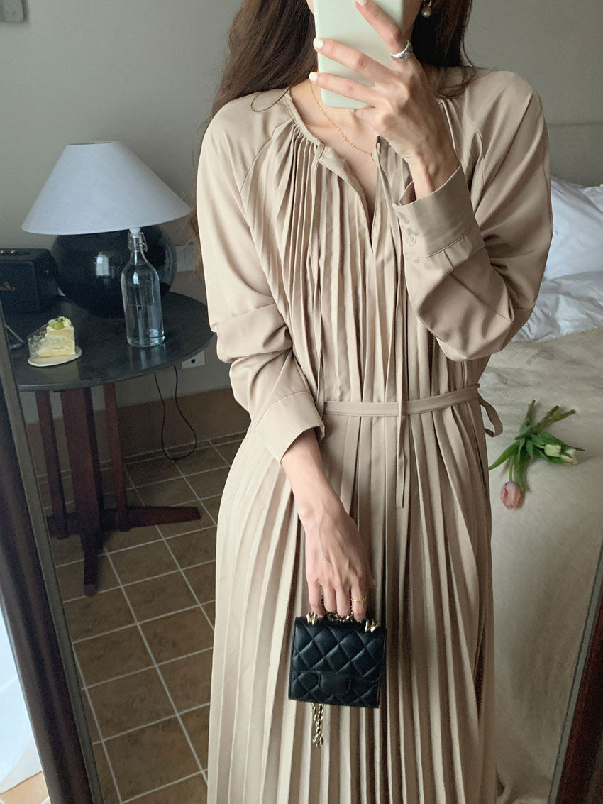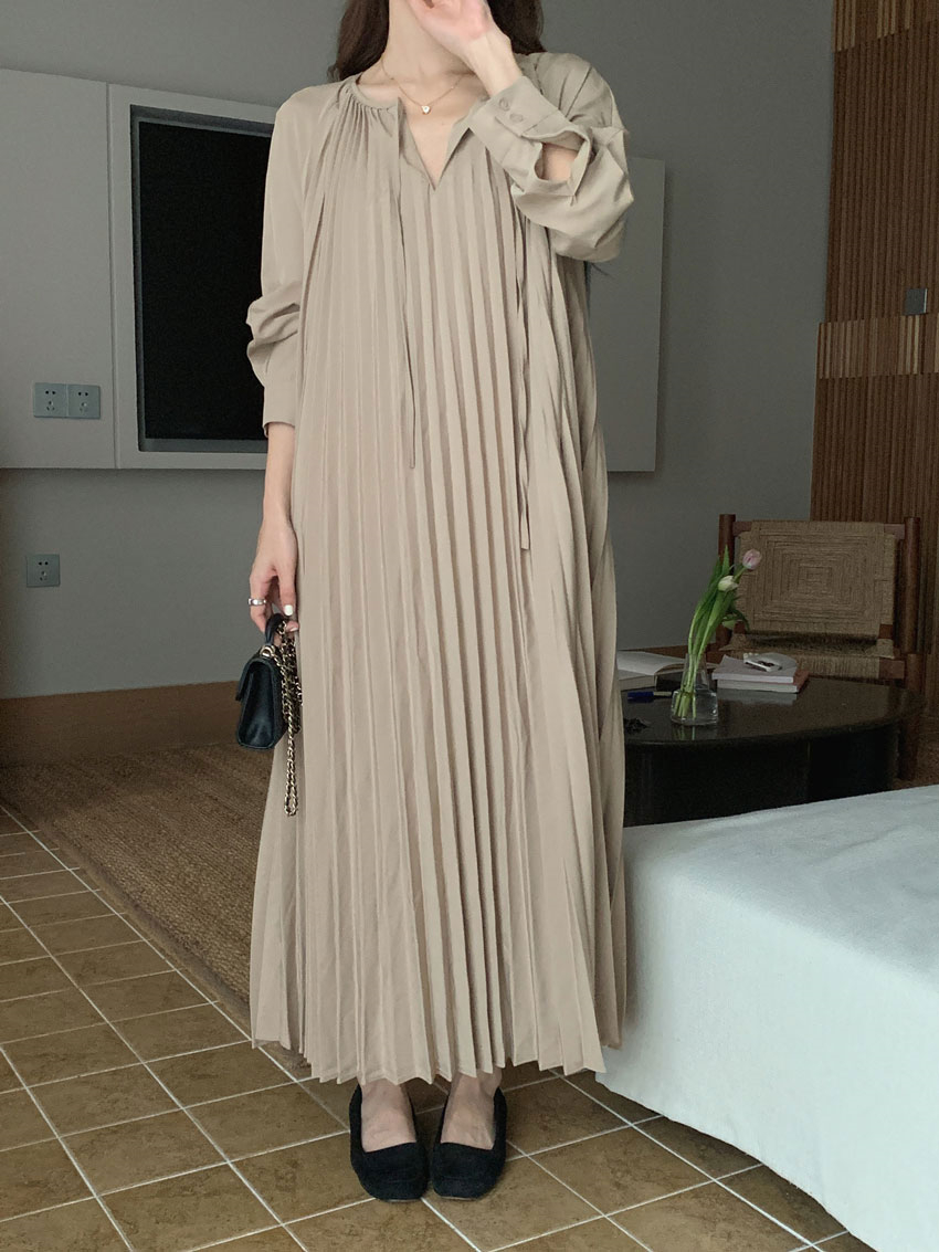 秋にぴったりな素材を使用したプリーツロングワンピースは今季注目の一着です。
