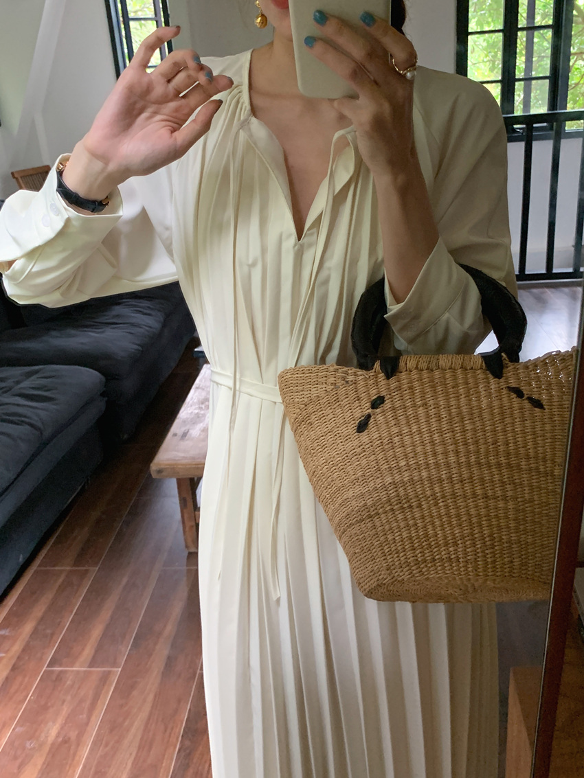 胸元の美しいプリーツデザインが上品な印象を演出し、体型カバー効果も抜群。